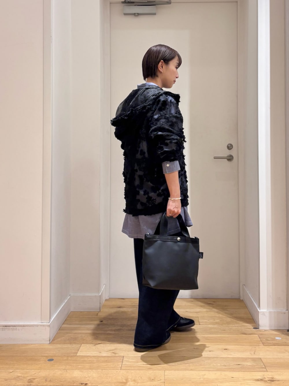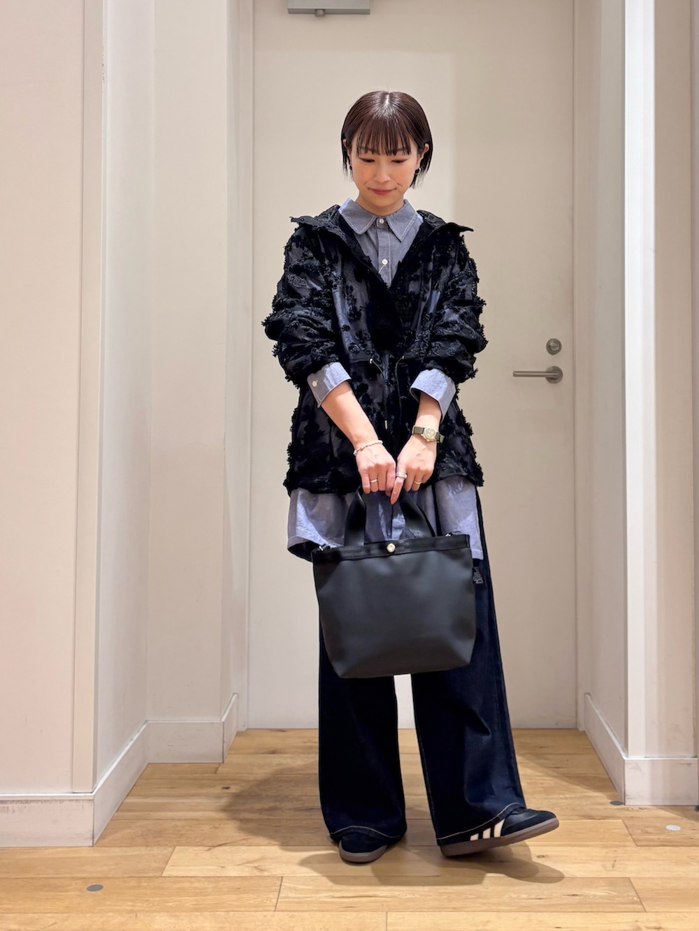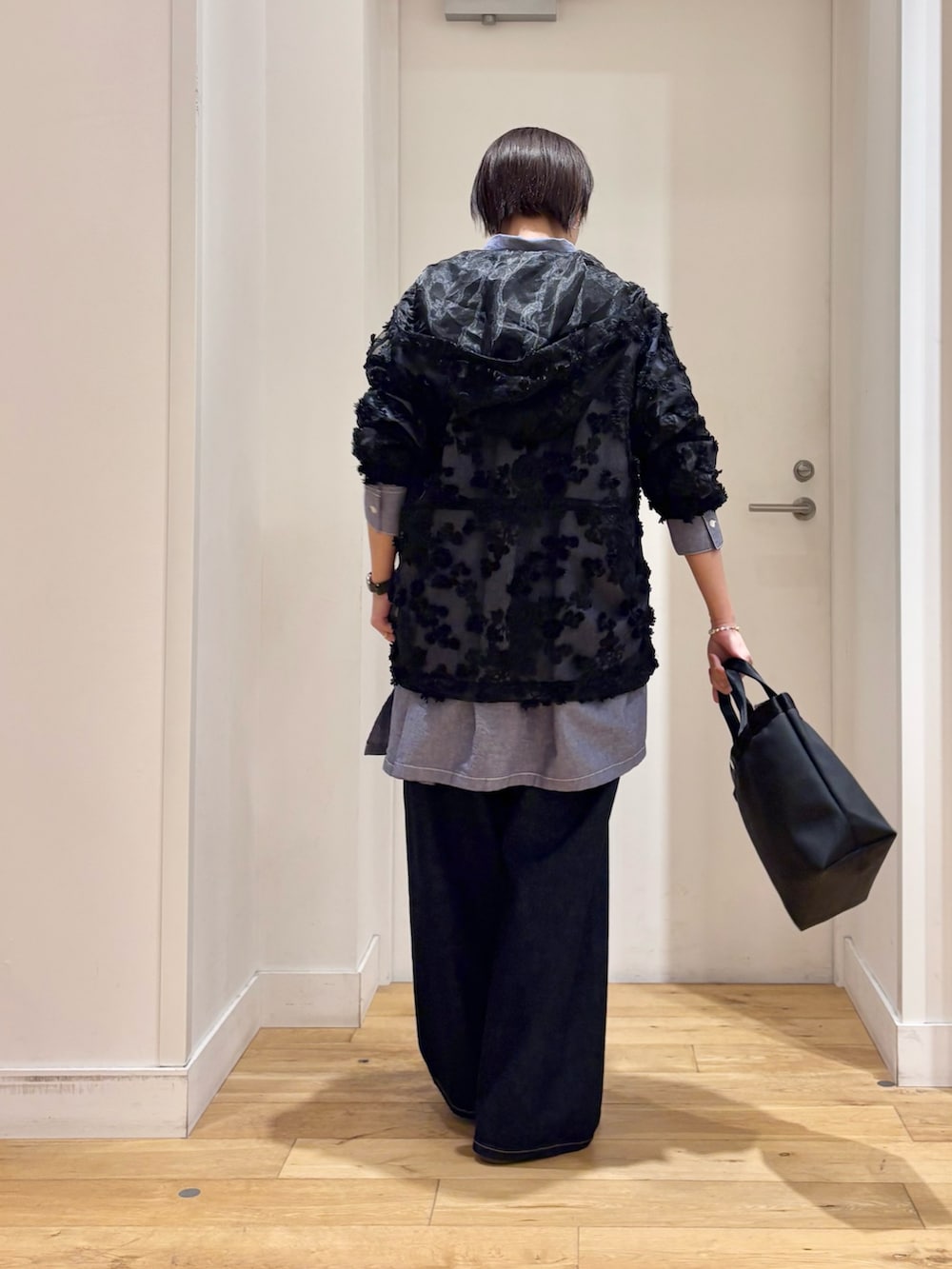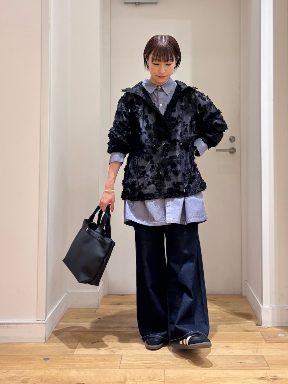 今回はシャツやデニムパンツを合わせてカジュアルスタイルですが、スカートで女性らしい上品なスタイルでの着用もオススメです◎