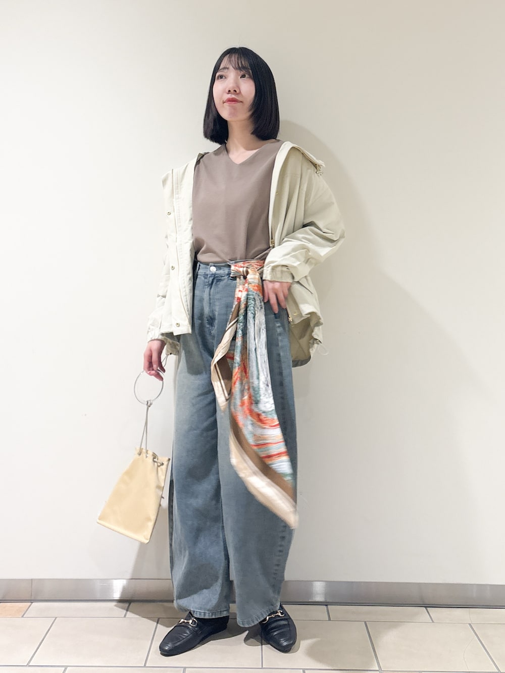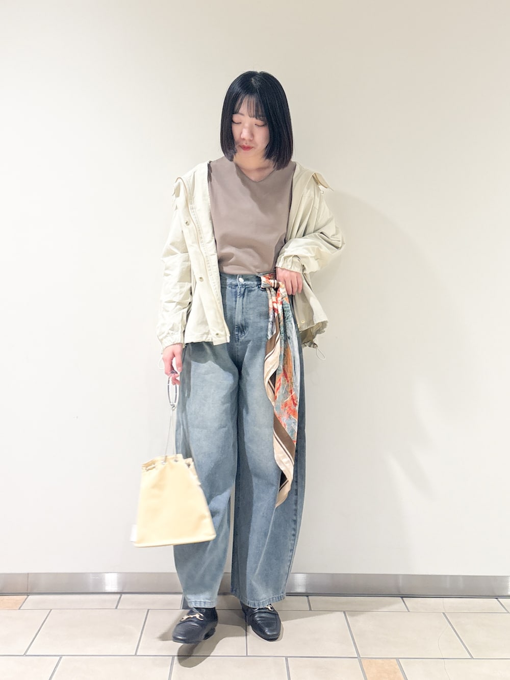 ベーシックなカラーでまとめたので、大柄のスカーフをポイントにしました〜^^