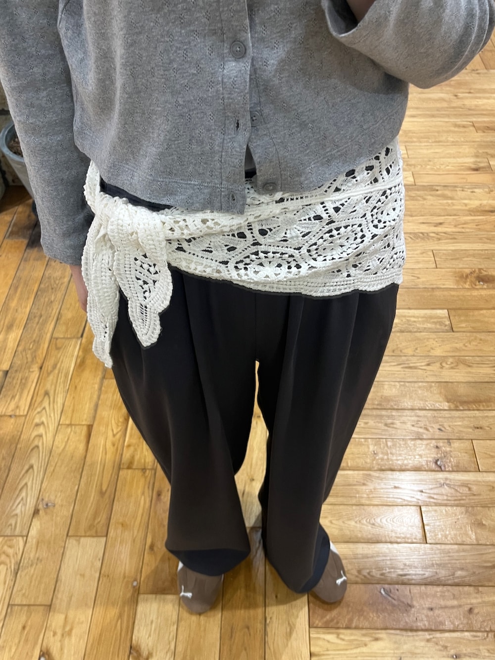 レーススカーフを腰巻きして、さりげないアクセントに✨