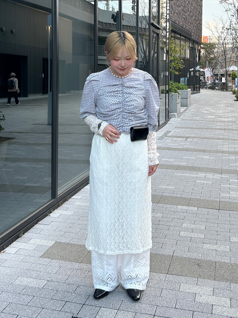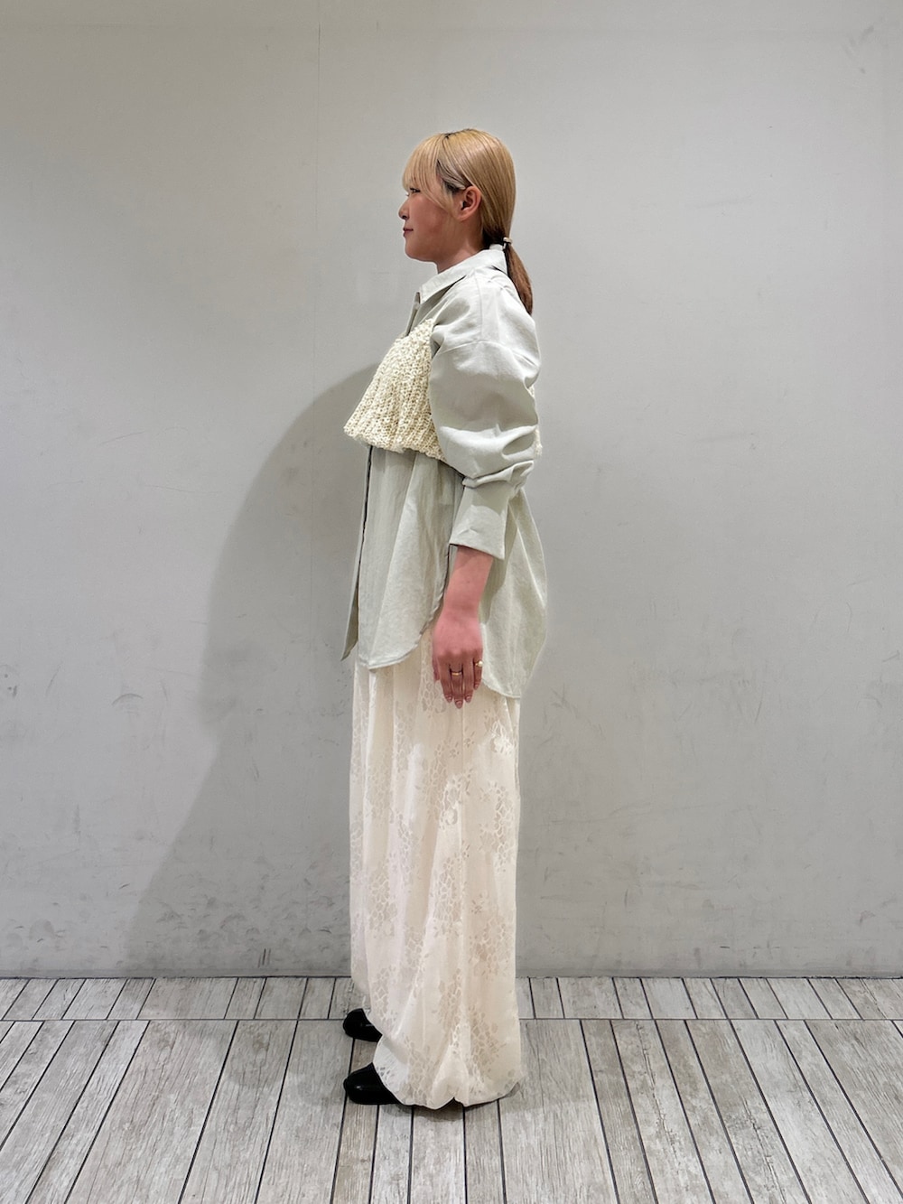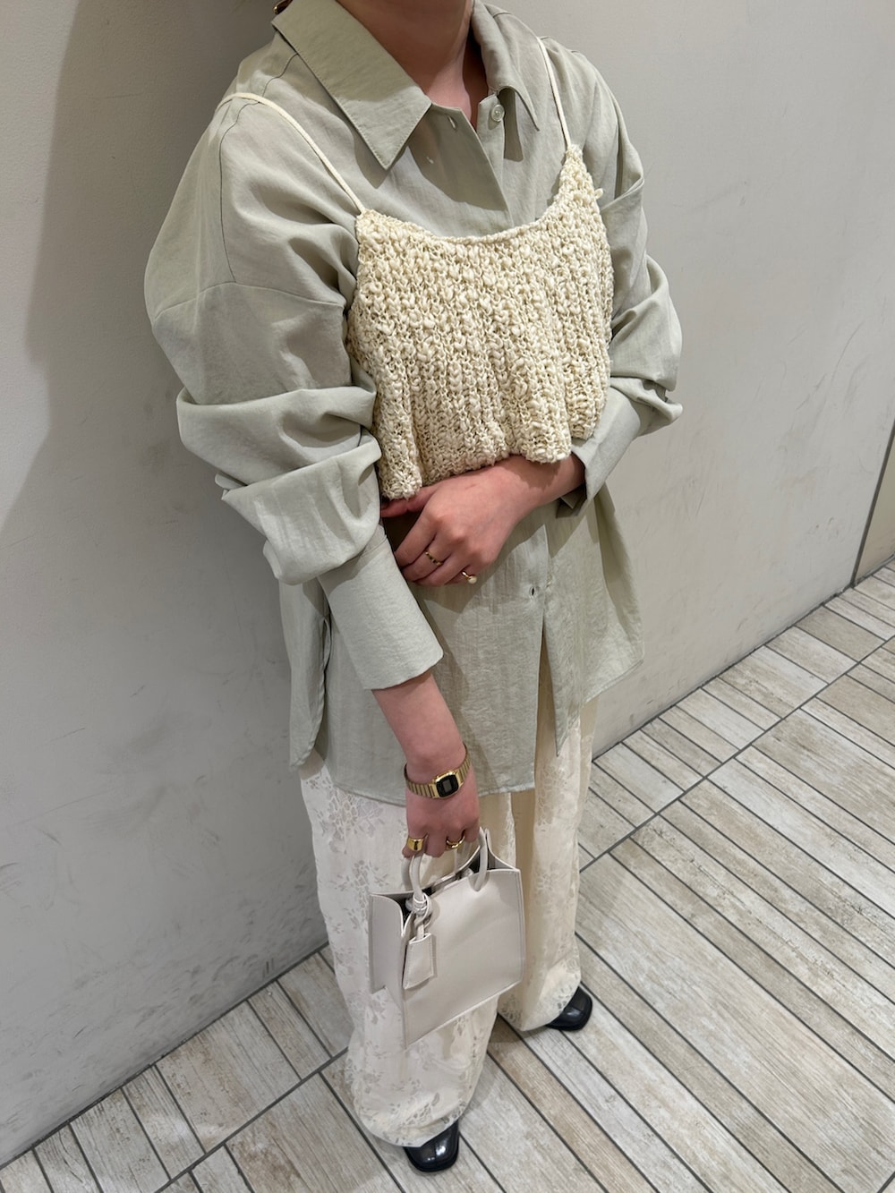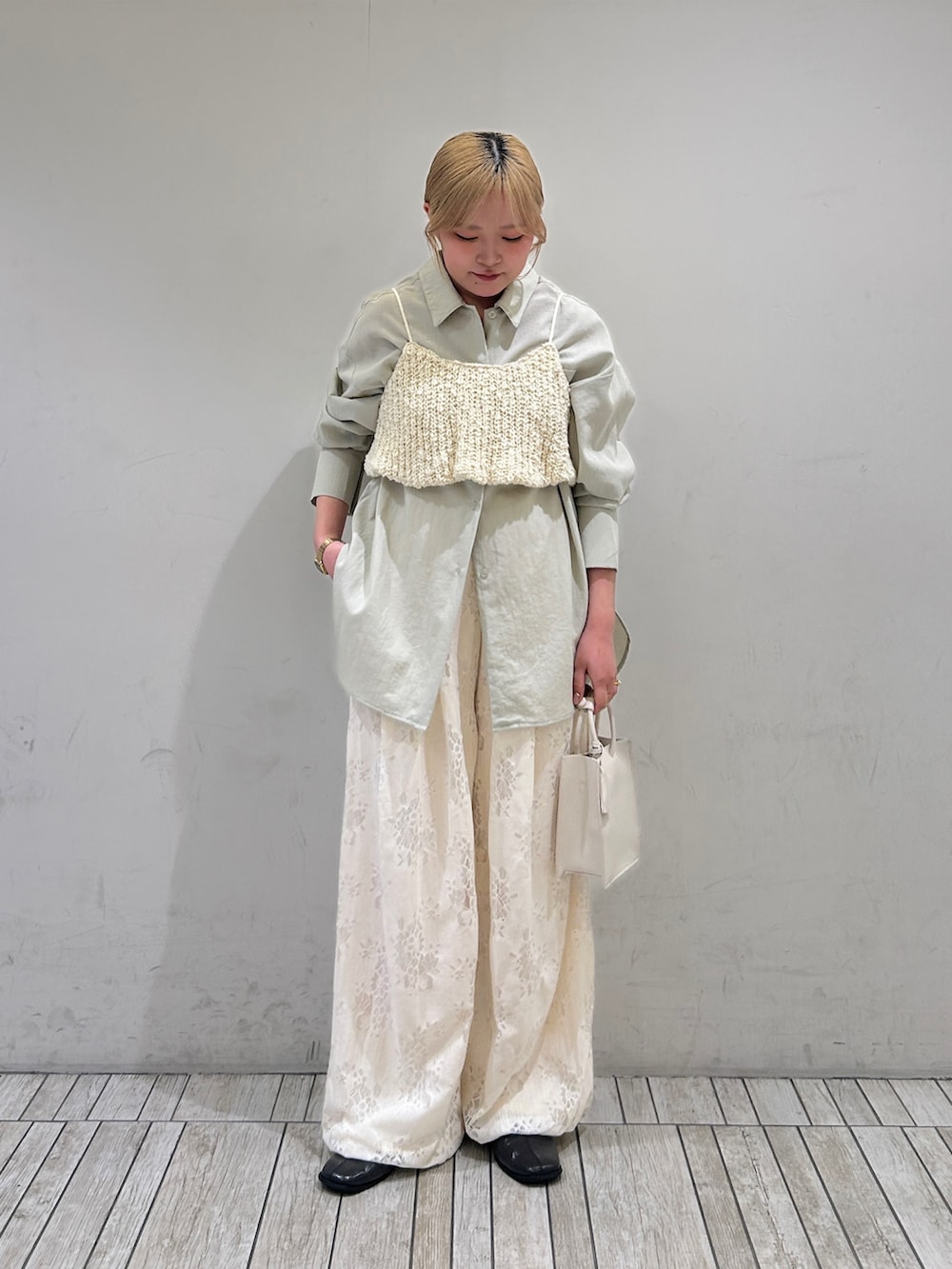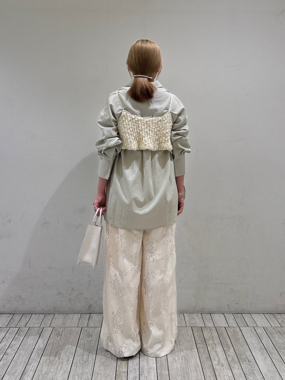 春らしいグリーンのシャツにビスチェを重ねて、パンツも同系色のアイボリーで合わせました!