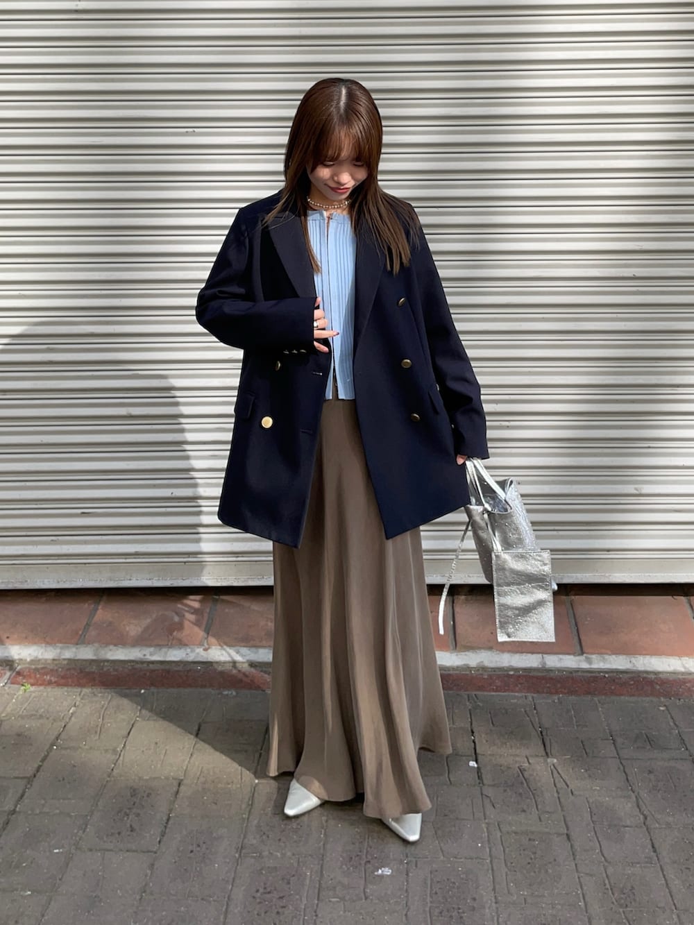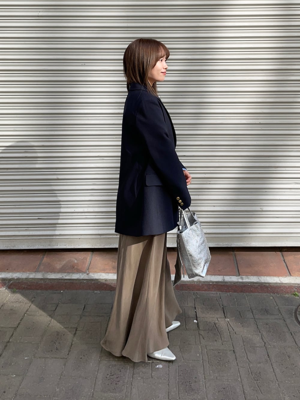 スカートは、キュプラバイアスカートです!サテンのようなキレイめスカートで、裾がフレアに広がったデザインが可愛く、スニーカー合わせのカジュアルにも合います✨私の身長でウエスト折って履いてます!