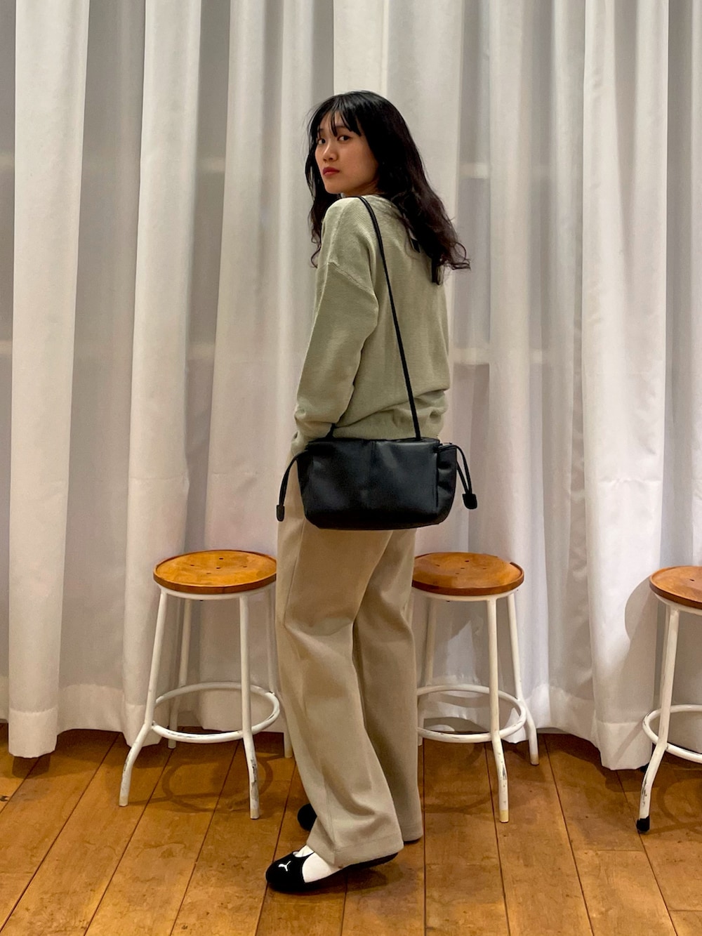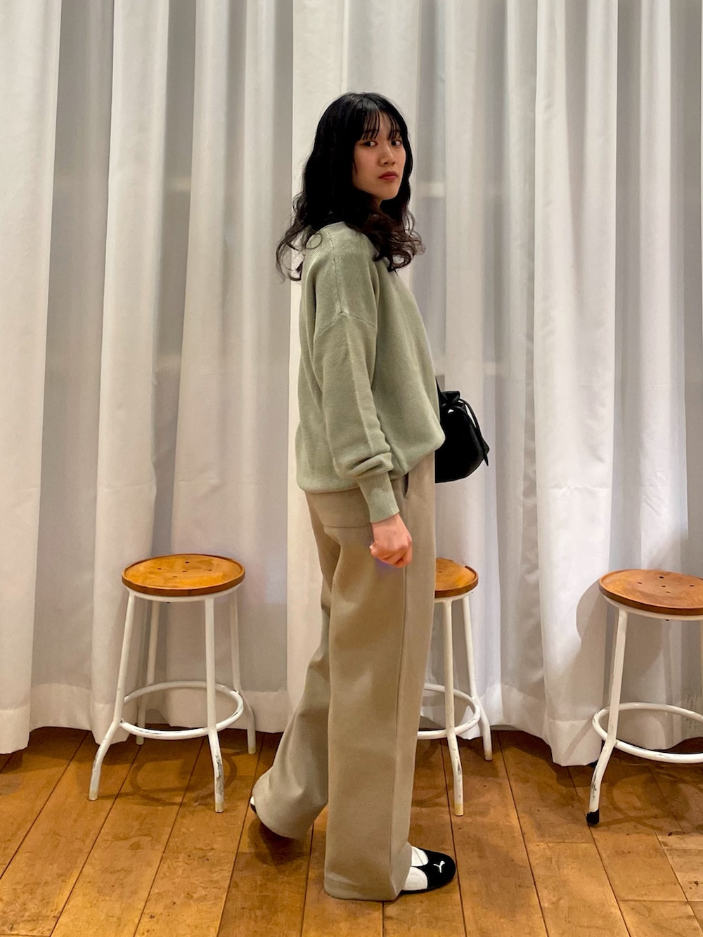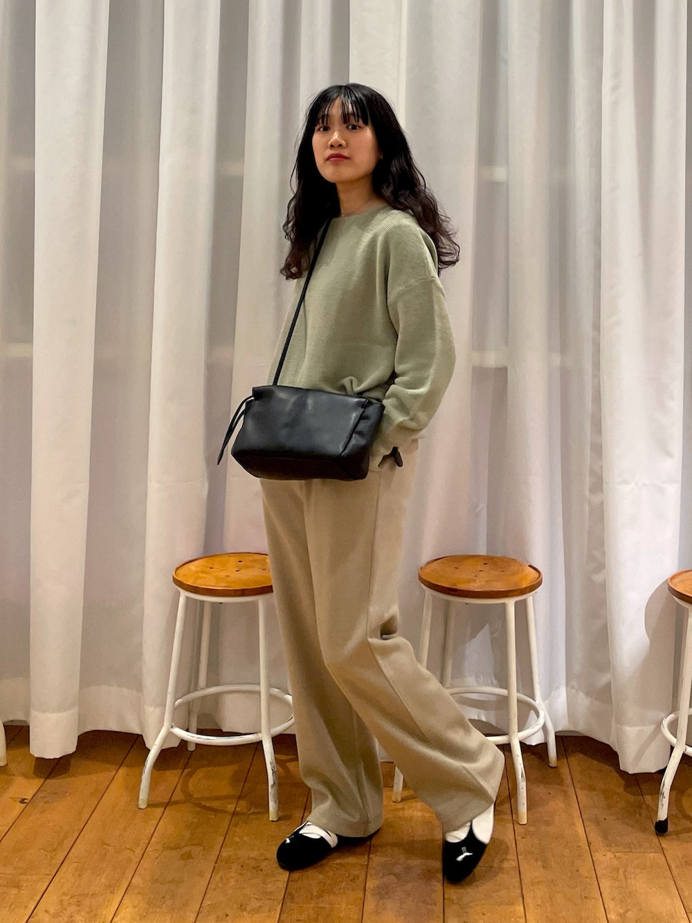 小物はブラックで引き締めて、ゆるさとのコントラストを大事にしました!