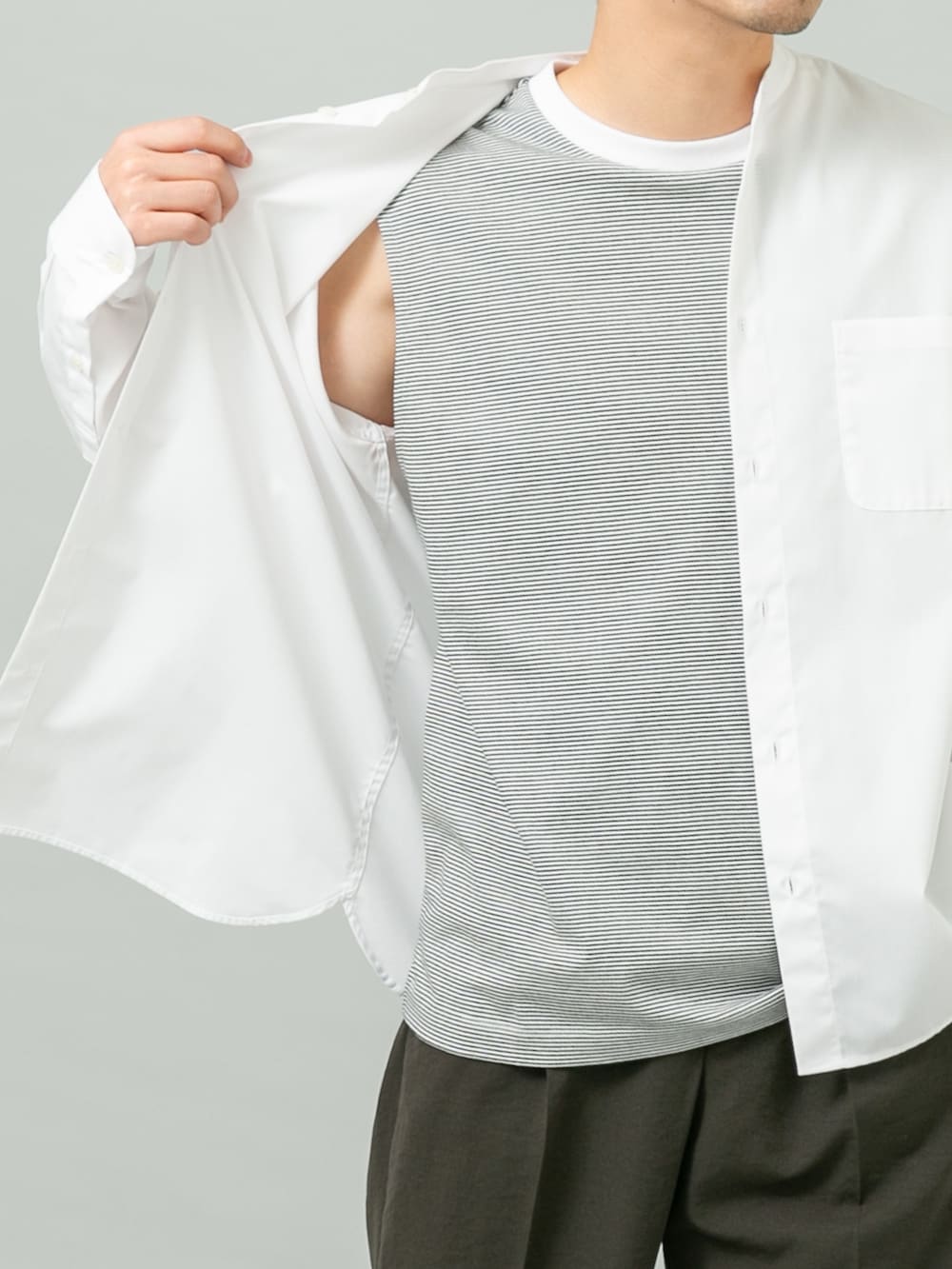カラーはホワイトと淡いチャコールでクリーンな印象にしてボーダーでカジュアル感をプラス。