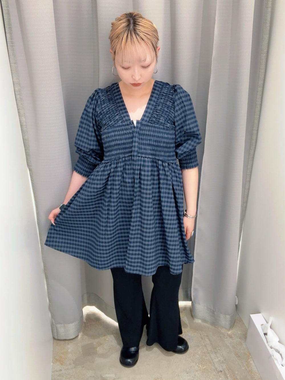 フレアパンツと合わせて大人らしく!首の開きがデコルテをすっきり見せてくれて着やすいです!シャーリングも可愛いので細見せ間違いなしの一枚です❣️