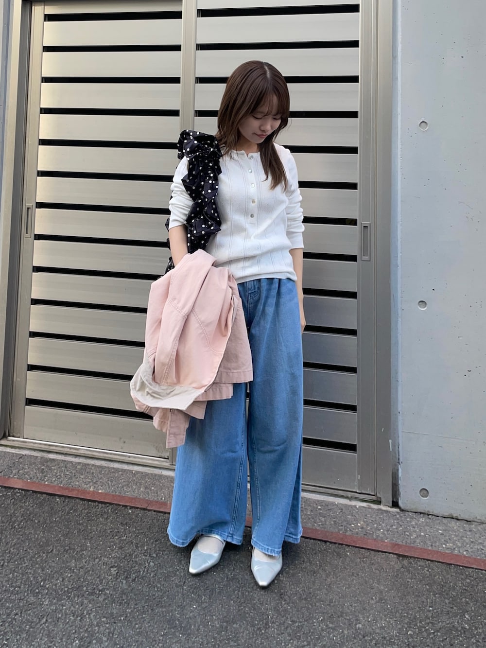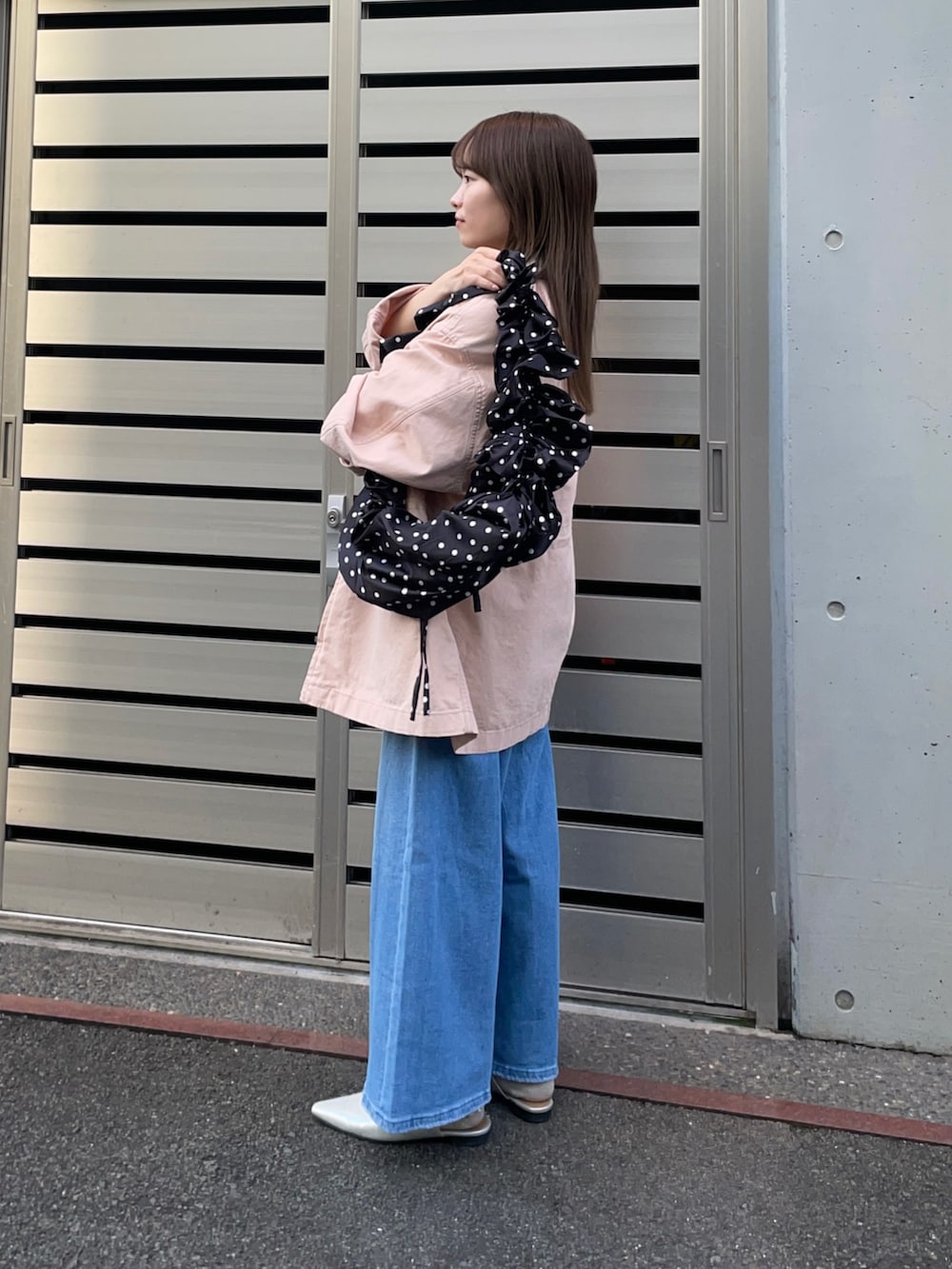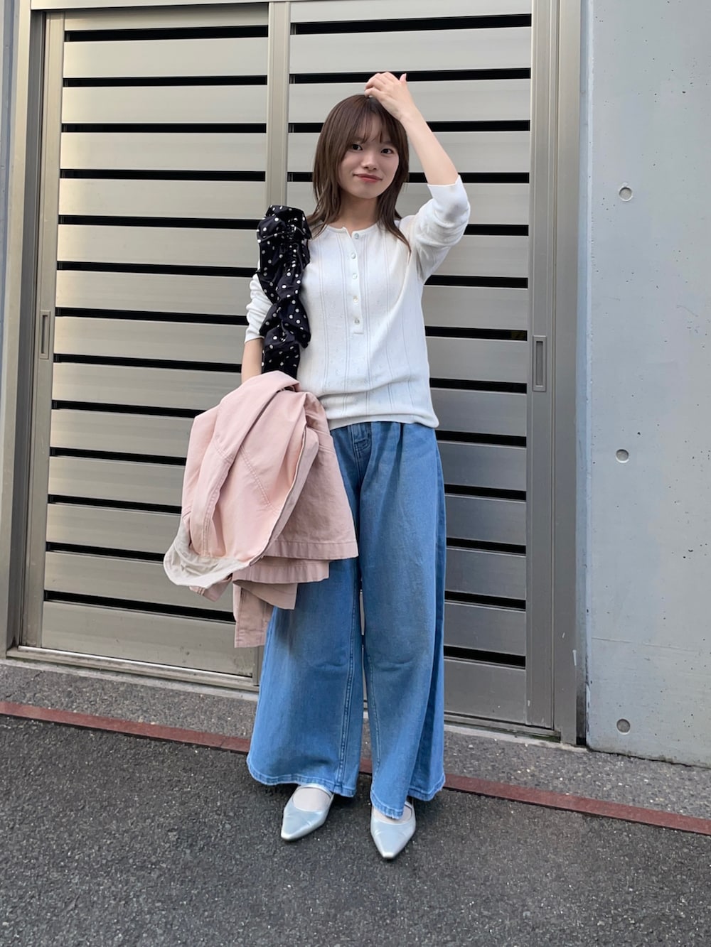 パンツは綿麻デニムイージーパンツです!毎年の大人気商品で、着てみるとびっくりなのが、とっっても柔らかいストレスフリーな履き心地です!デニム特有の硬さがなく、ワイドなシルエットで体型カバーしてくれる優れものです!私の身長でウエスト折ってます!
