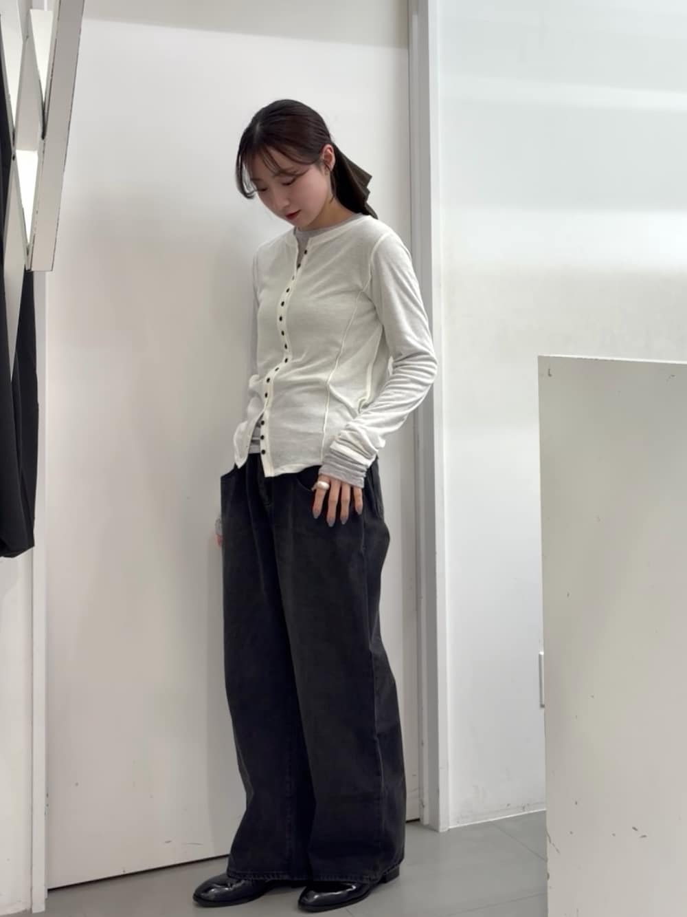 すっきりとしたシルエットに、ワイドデニムを合わせて抜け感をプラス☑️