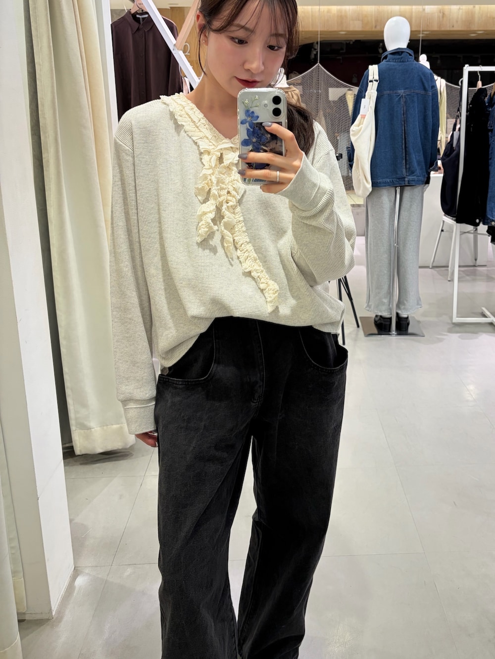 トップスは柔らかくて着心地がよく、レースが顔まわりを華やかに見せてくれます🫰デニム合わせで甘すぎず普段使いしやすいです🎶