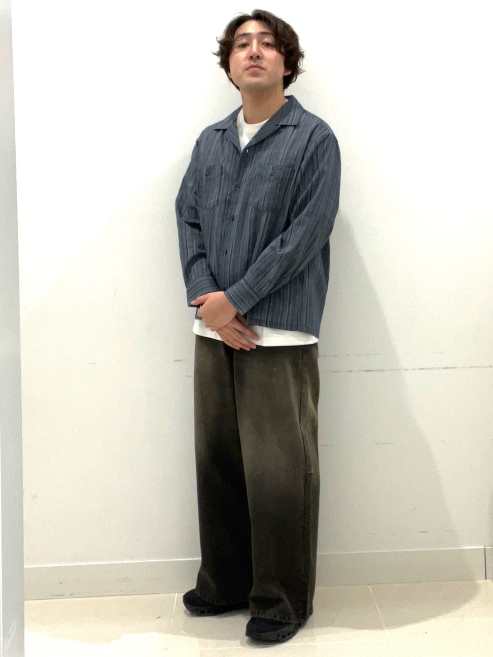 ブルーのシアーシャツをベースにモノトーンのインナーとパンツで合わせてみました!