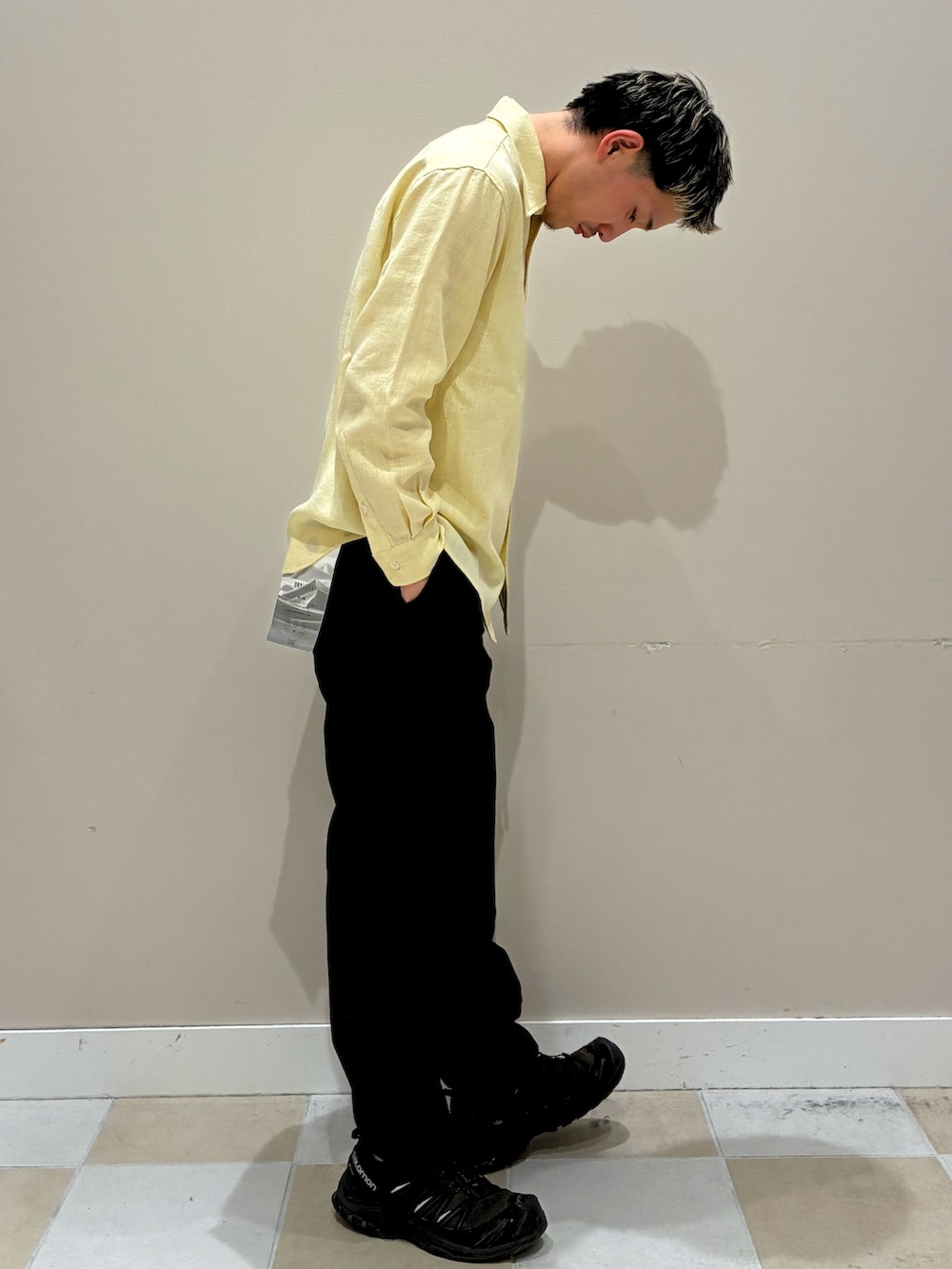 柔らかい印象のイエローシャツを主役に、ブラックのスラックスで全体を引き締めた大人カジュアルスタイル。