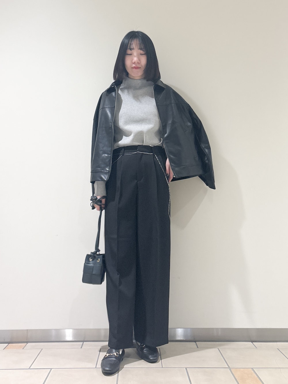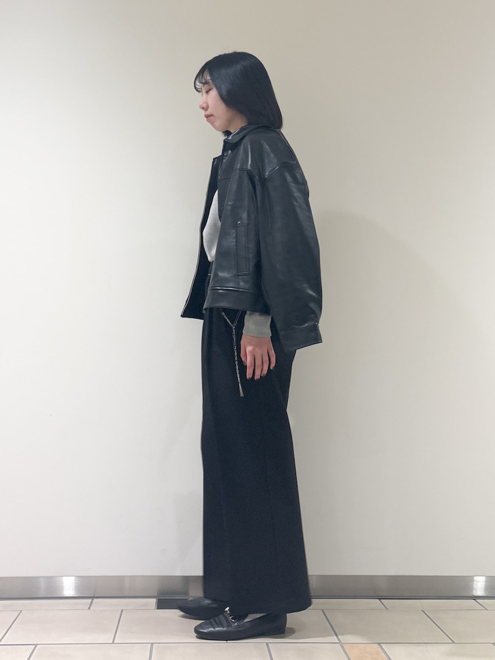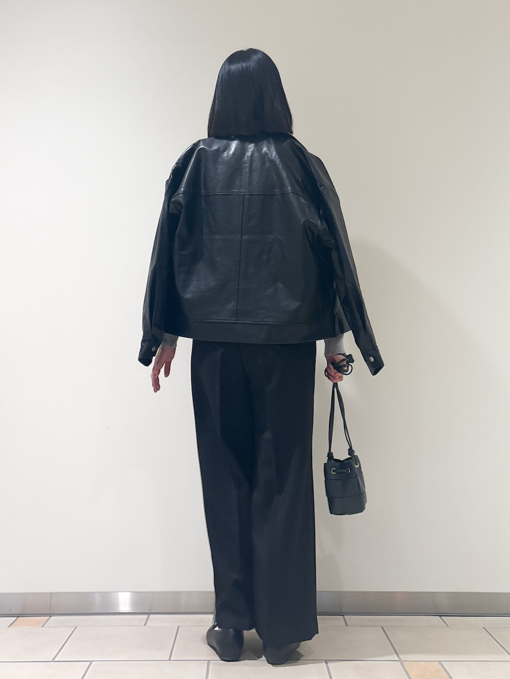 フェイクレザージャケットをバサっと羽織ったキレイめスタイル◎