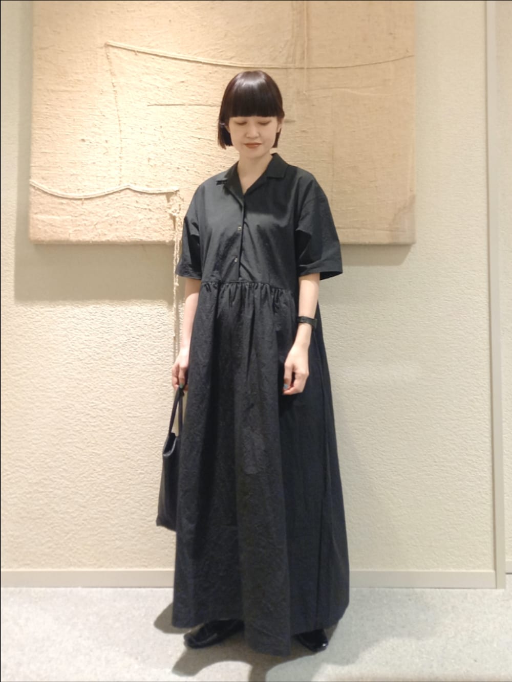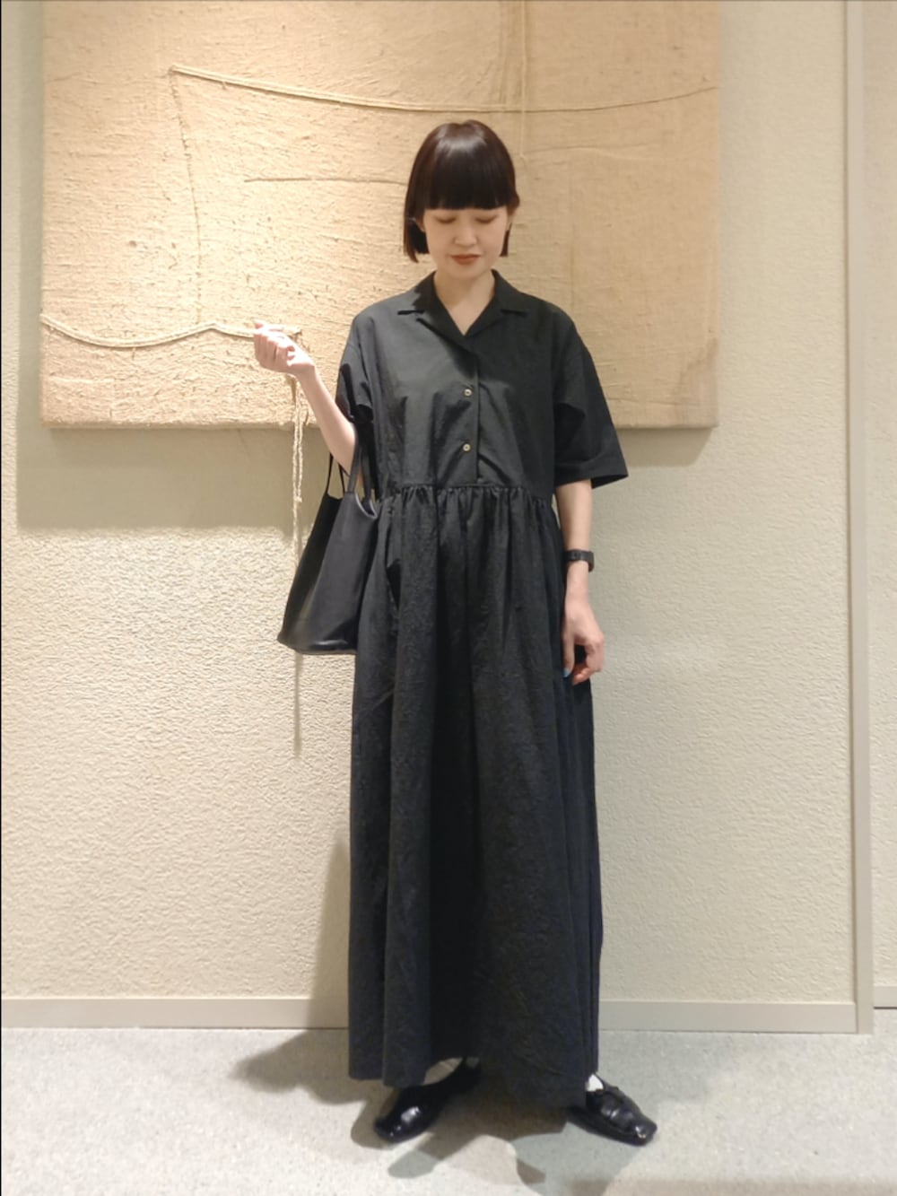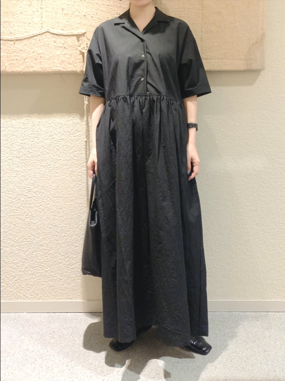 オープンカラーのシャツワンピースはシンプルに一枚で着るだけでサマになるデザインです。