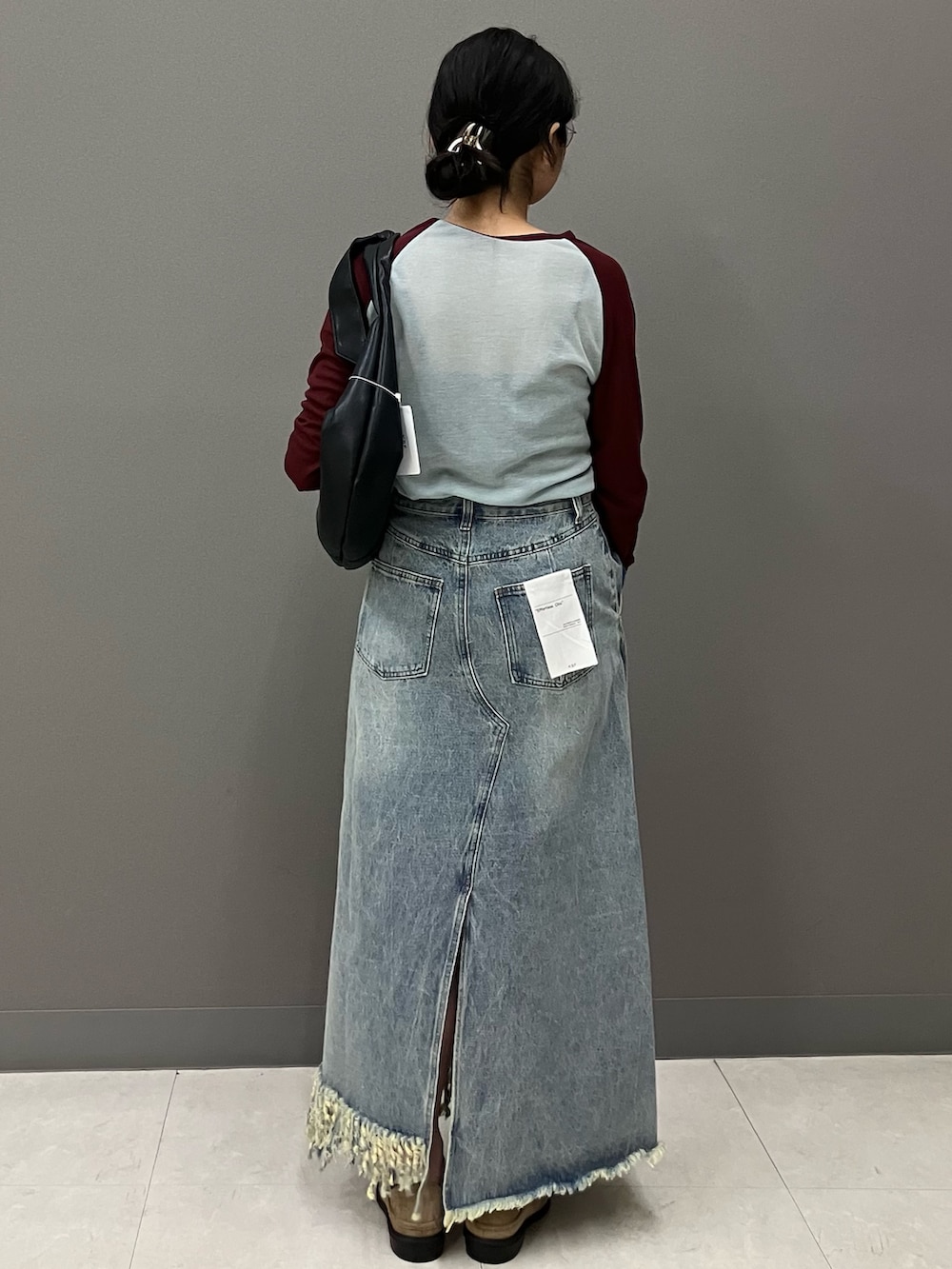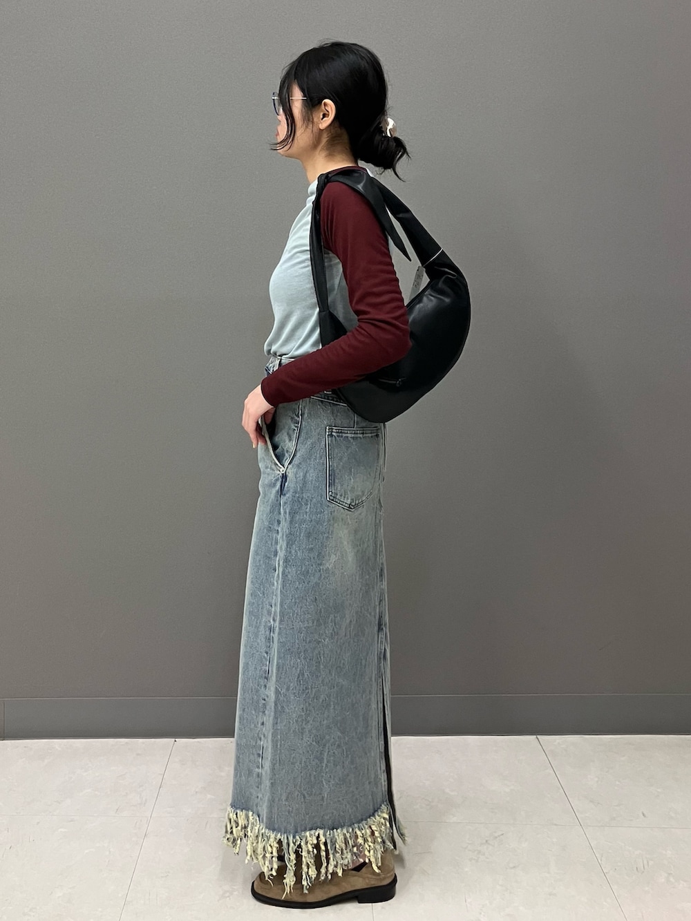 デニムスカートはアシンメトリーなデザインと裾のフリンジがポイントで、シンプルなトップスとサッと合わせるだけでコーデを完成させてくれます!