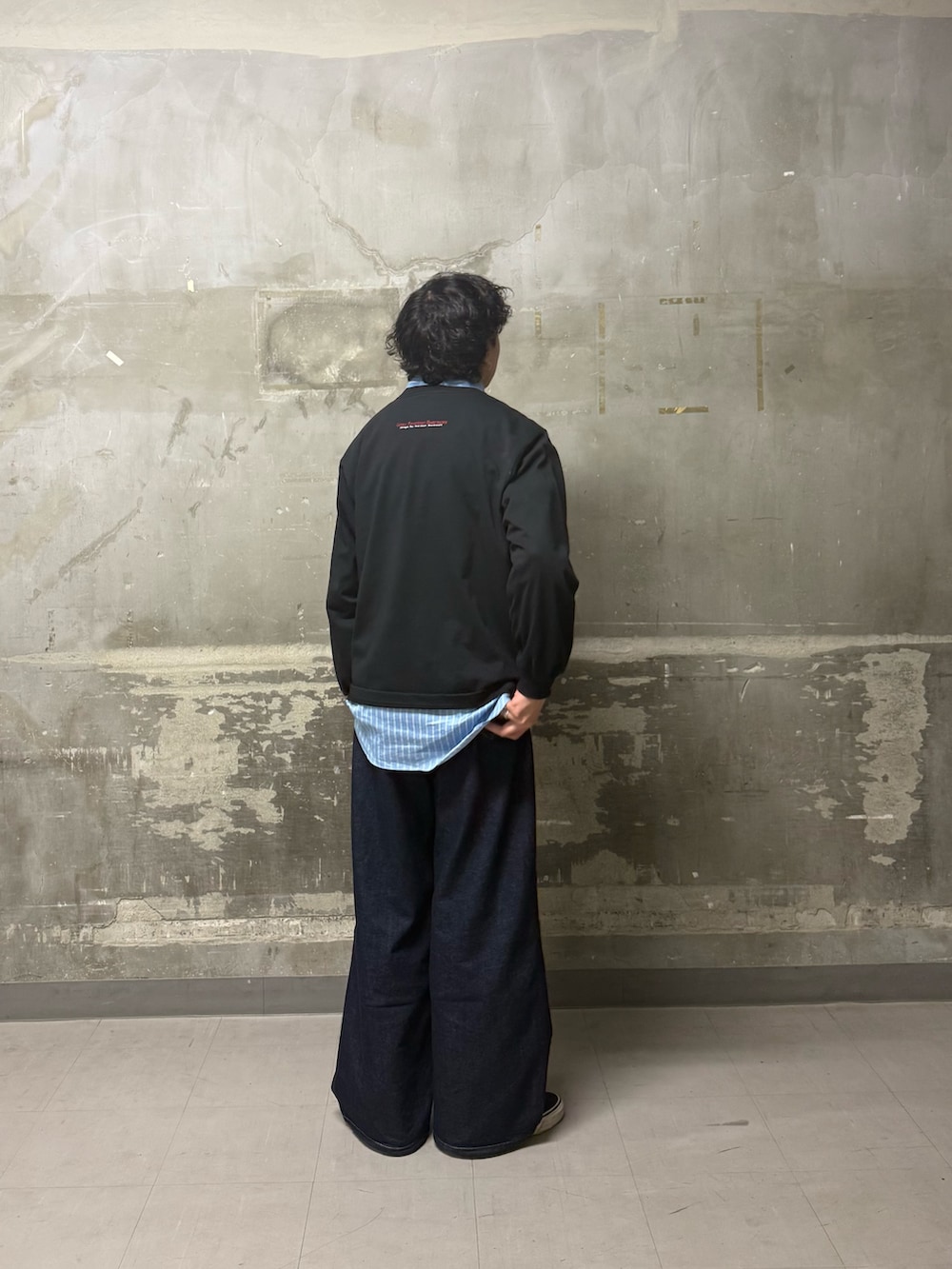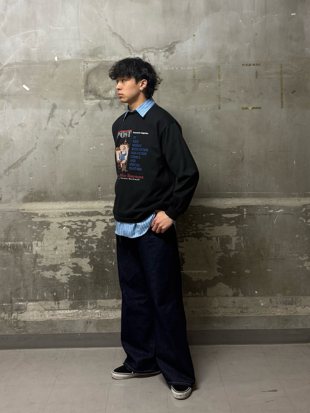 今回はストライプのブルーのシャツが重くなりやすいブラックとインディゴの繋ぎ役として、レイヤードさせてみました!