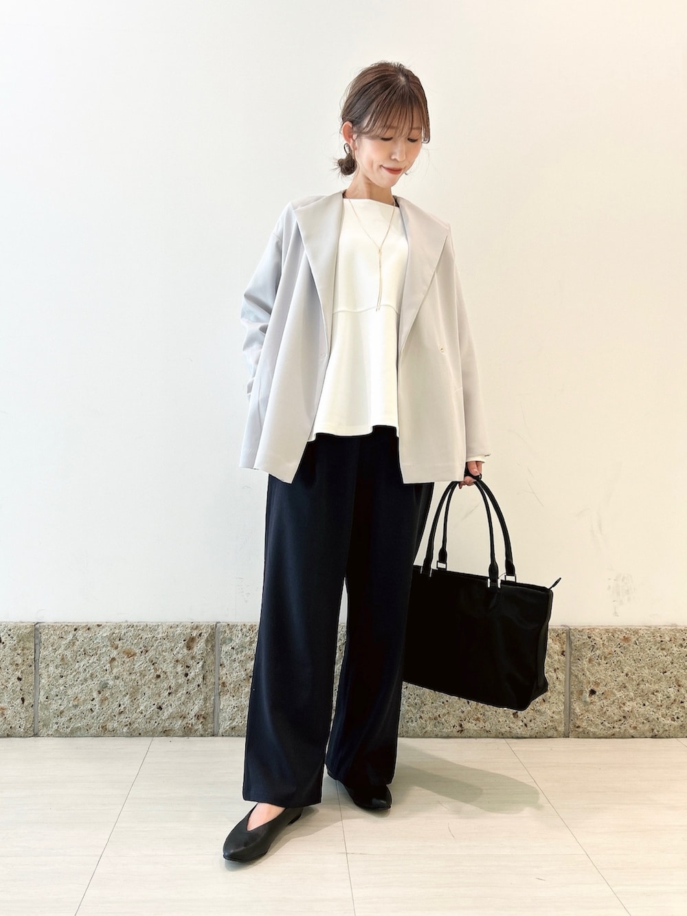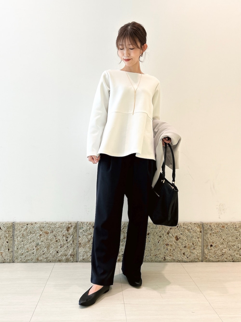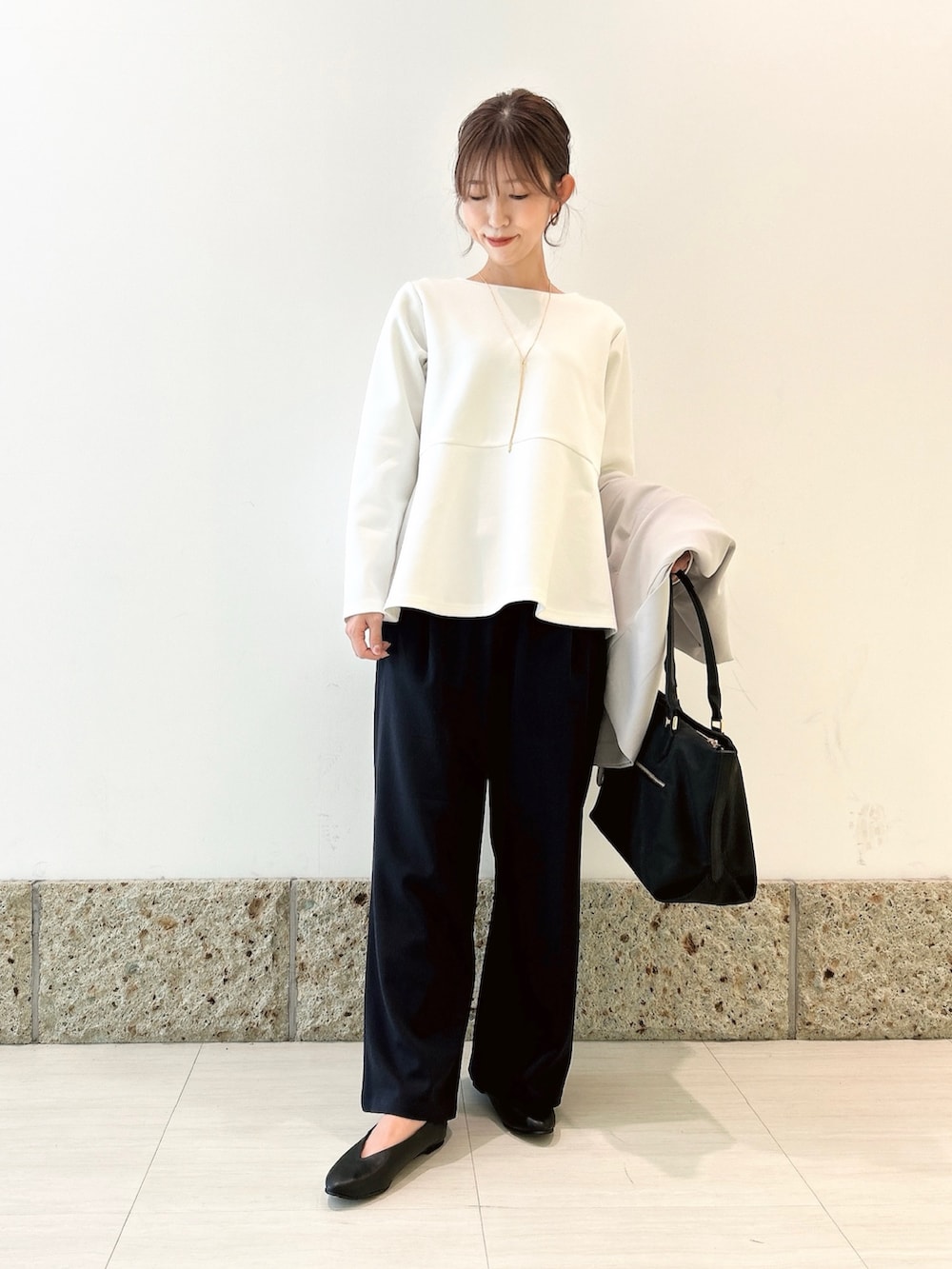 ボトムにはワイドパンツを。