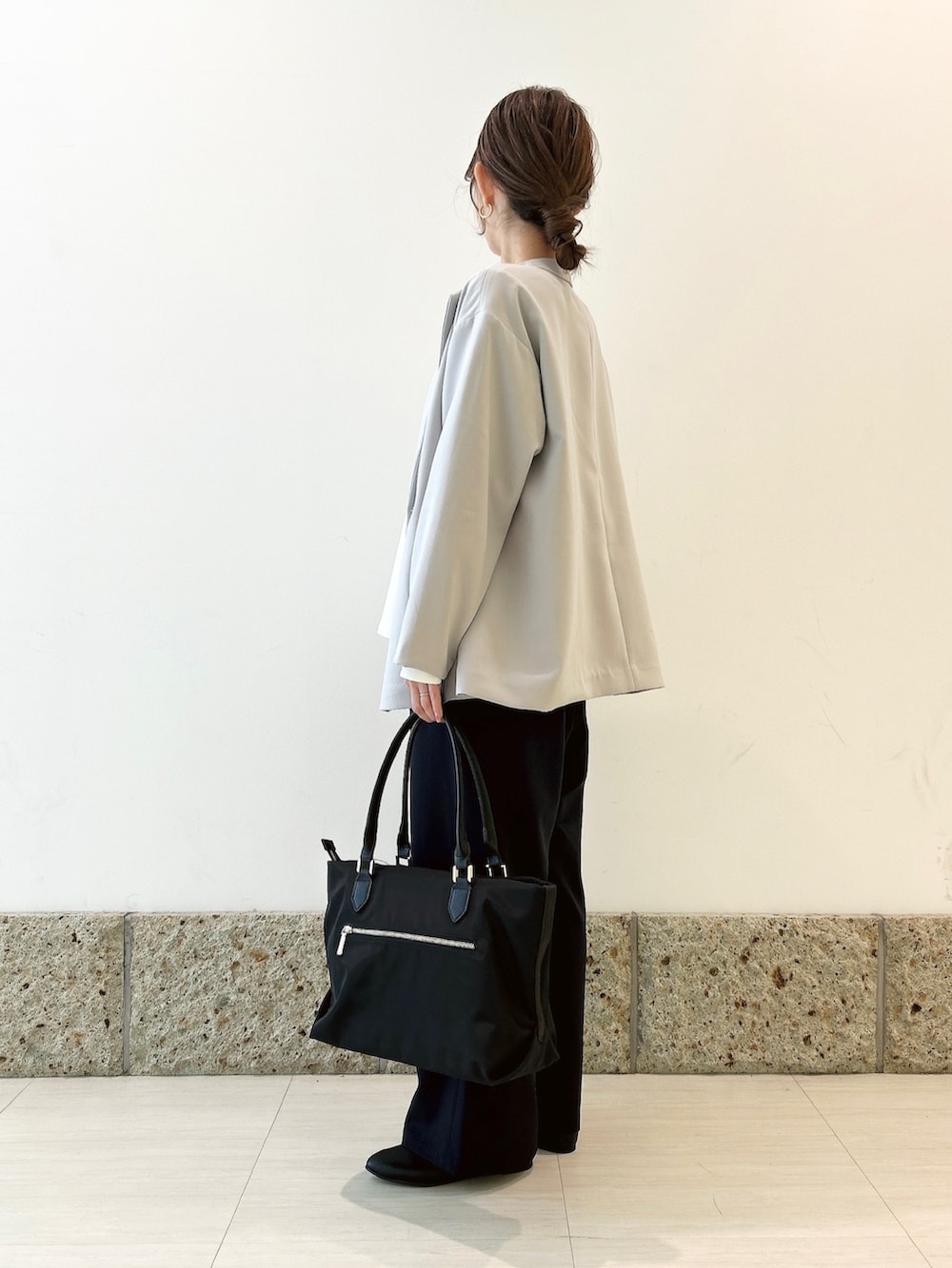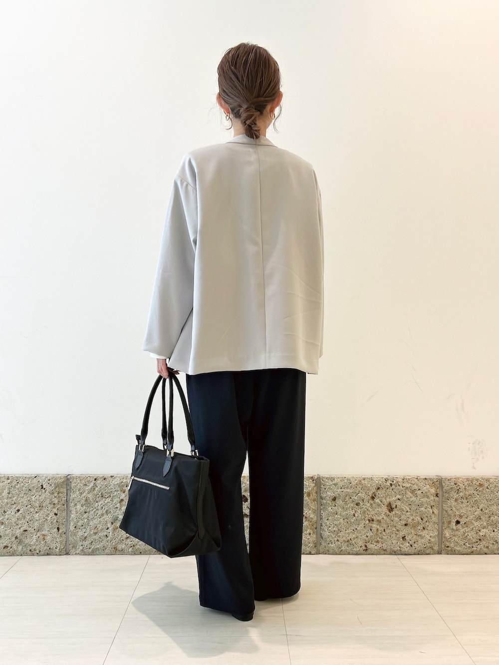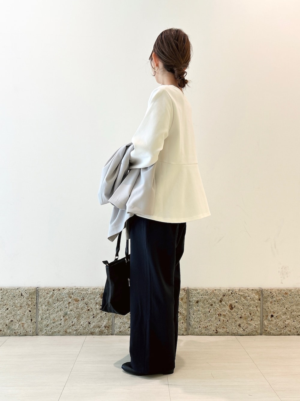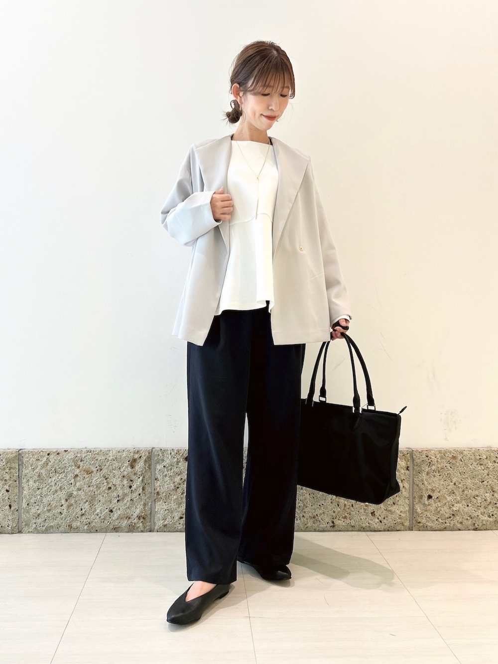 ボトムにはワイドパンツを。