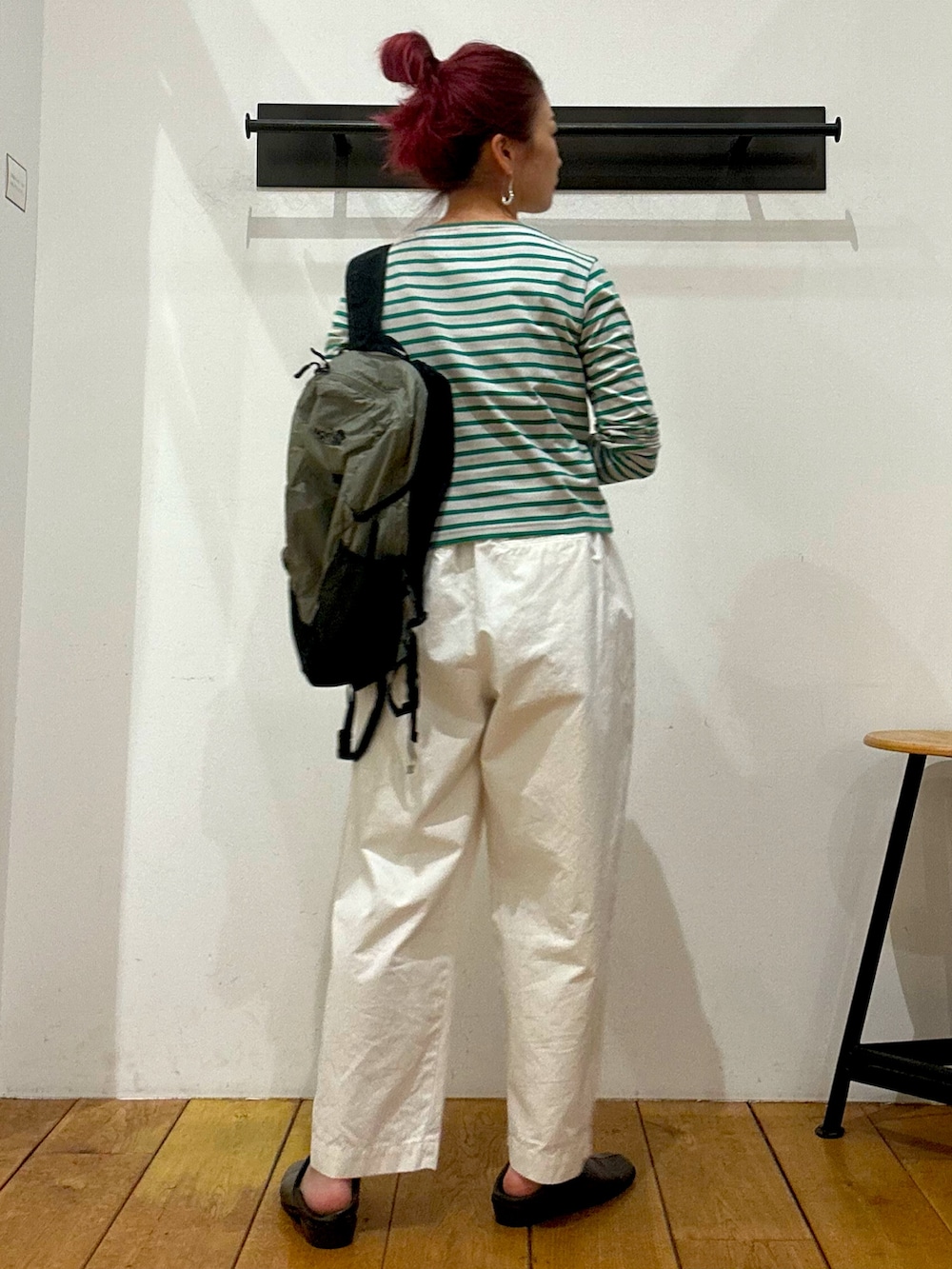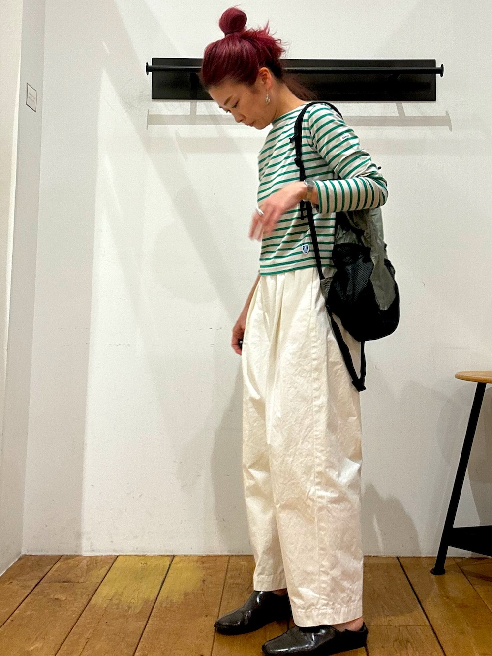ボリューム感のあるパンツに、少しコンパクトなカットソーで落ち着いた印象に!