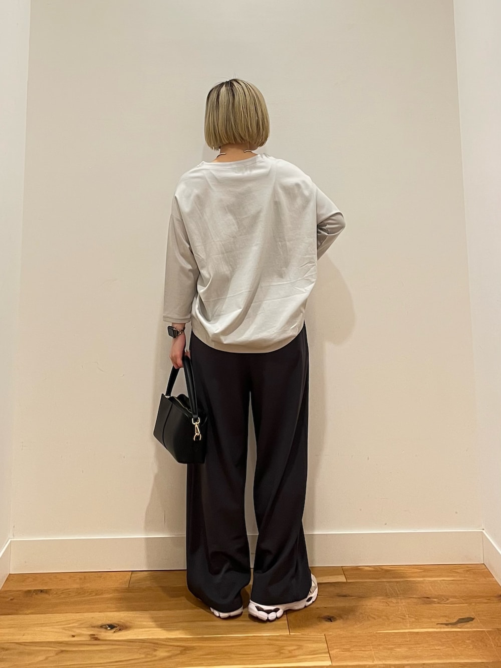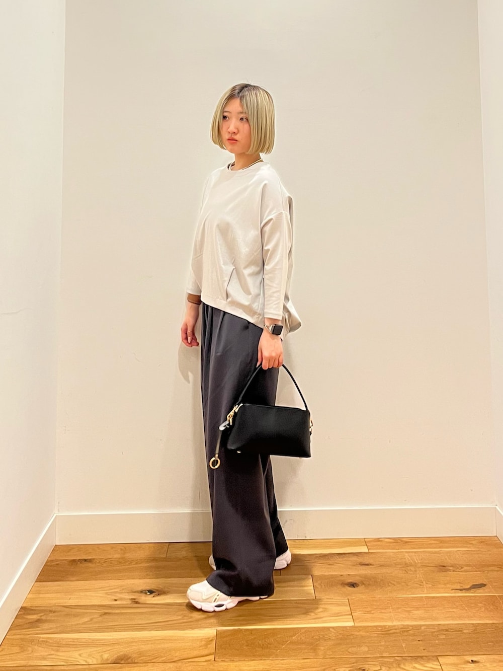 前の着丈を短めに設定することでフロントインもしやすく、ワイドパンツやギャザースカートにもバランス良く合わせられるのも魅力。