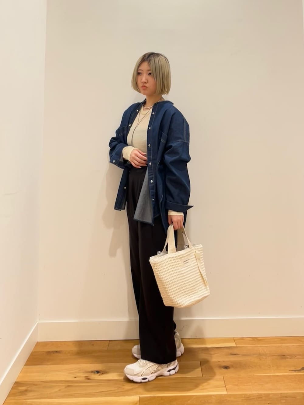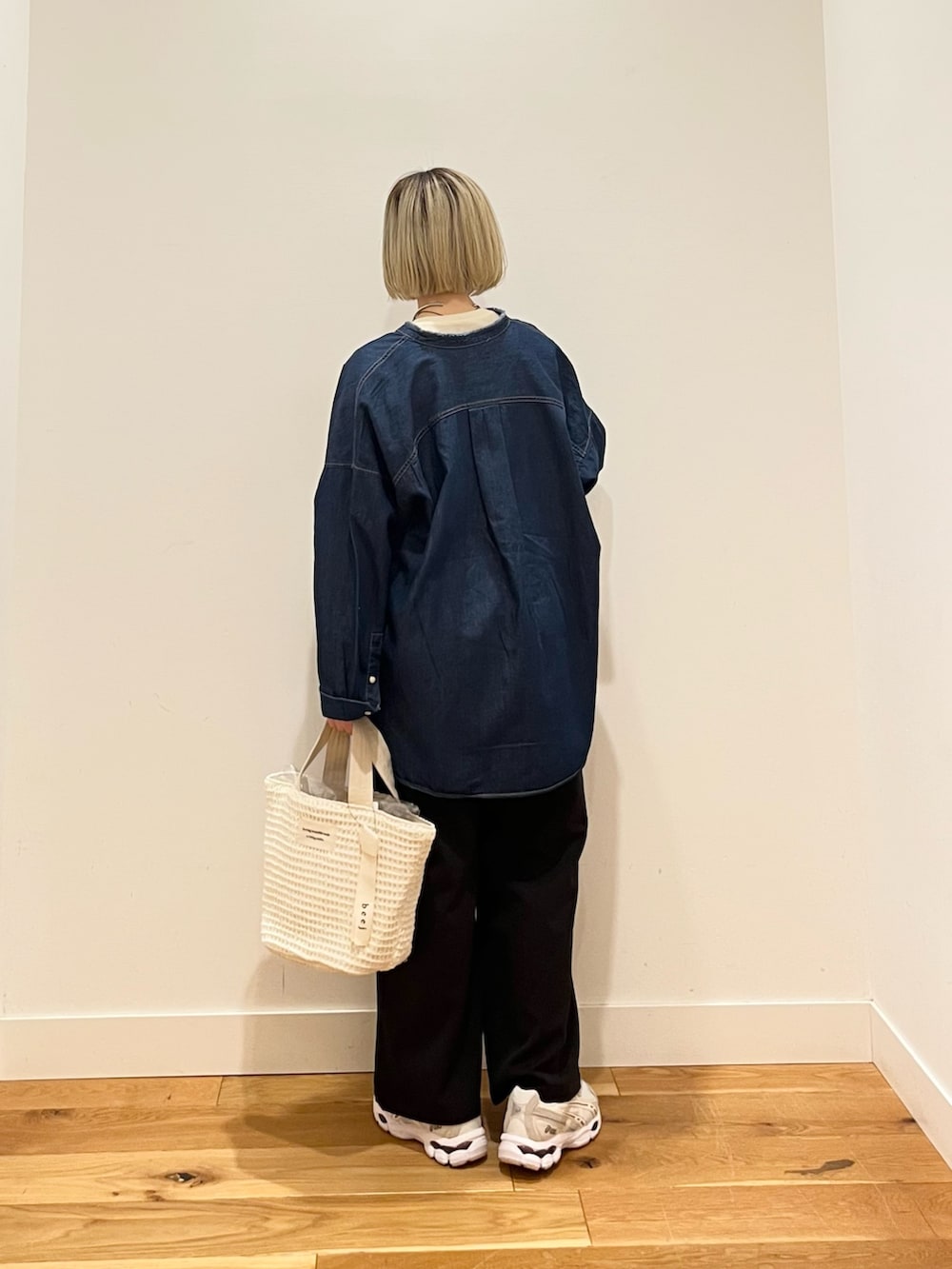やわらかデニムのオーバーサイズバンドカラーシャツ