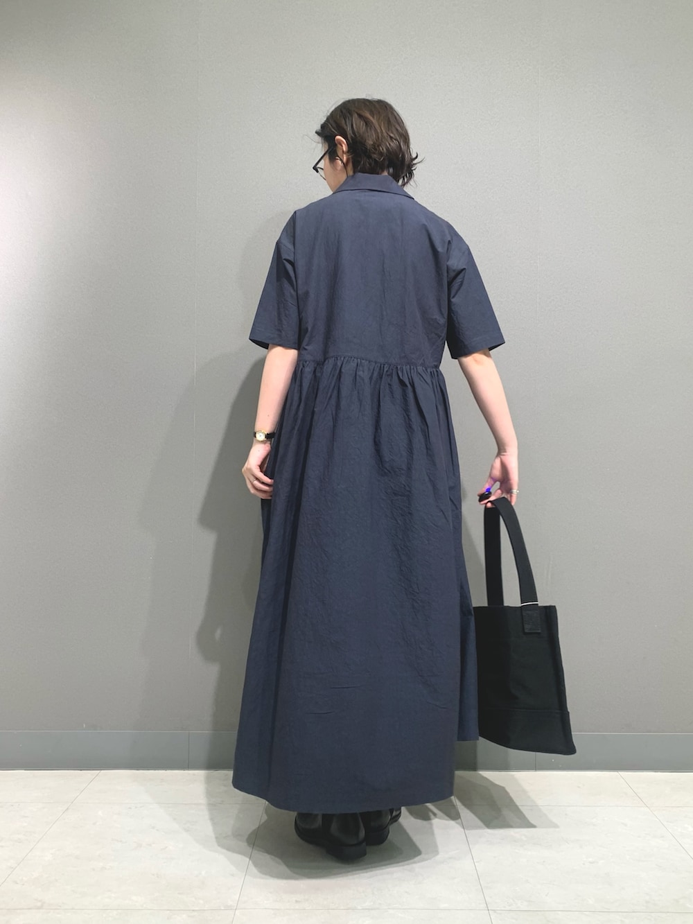 ゆったりとしたシャツワンピース。胸下のギャザーが女性らしくふわっと広がるデザインになっています。丈が長めなので身長が高めの方にもおすすめです。