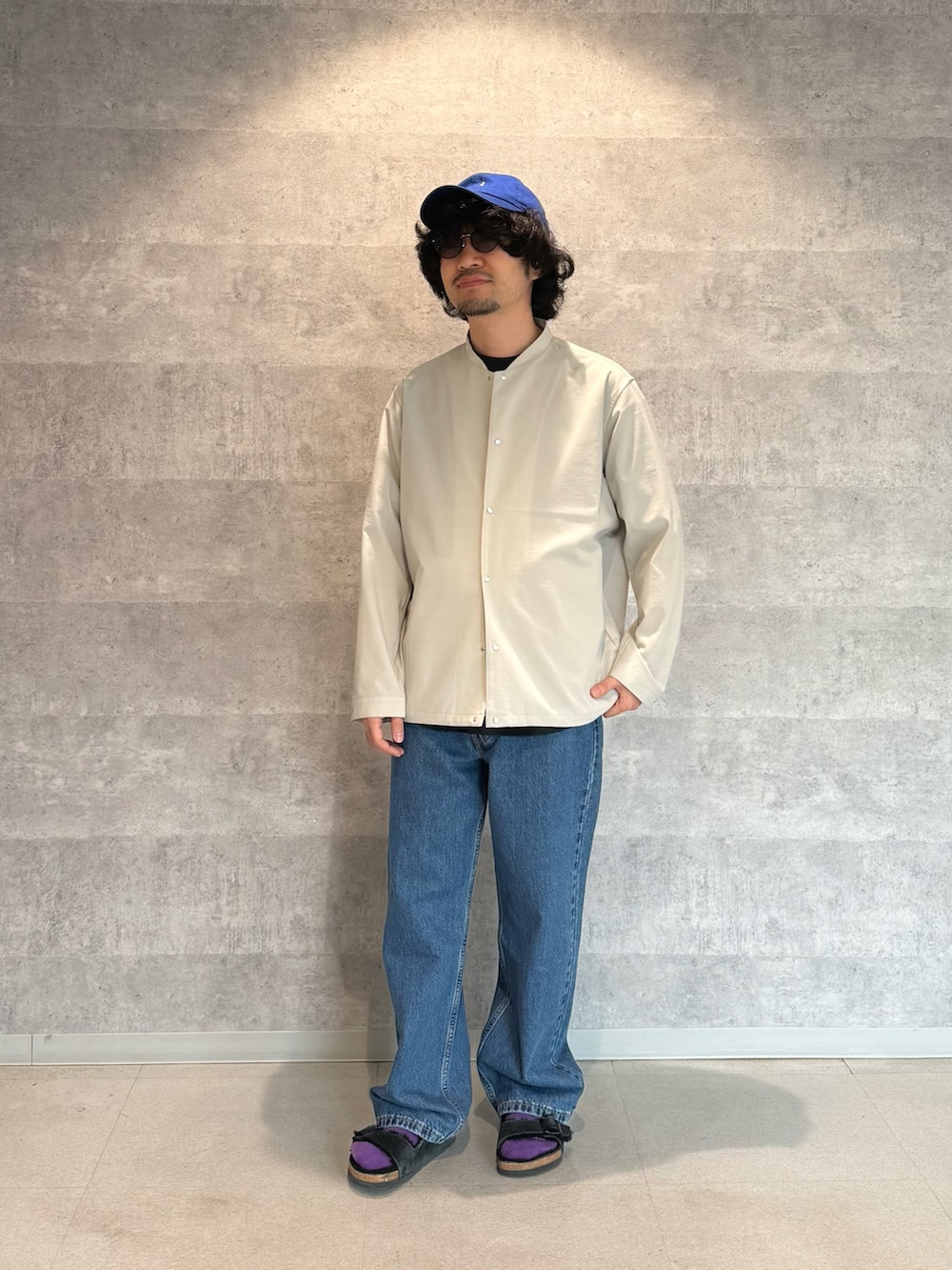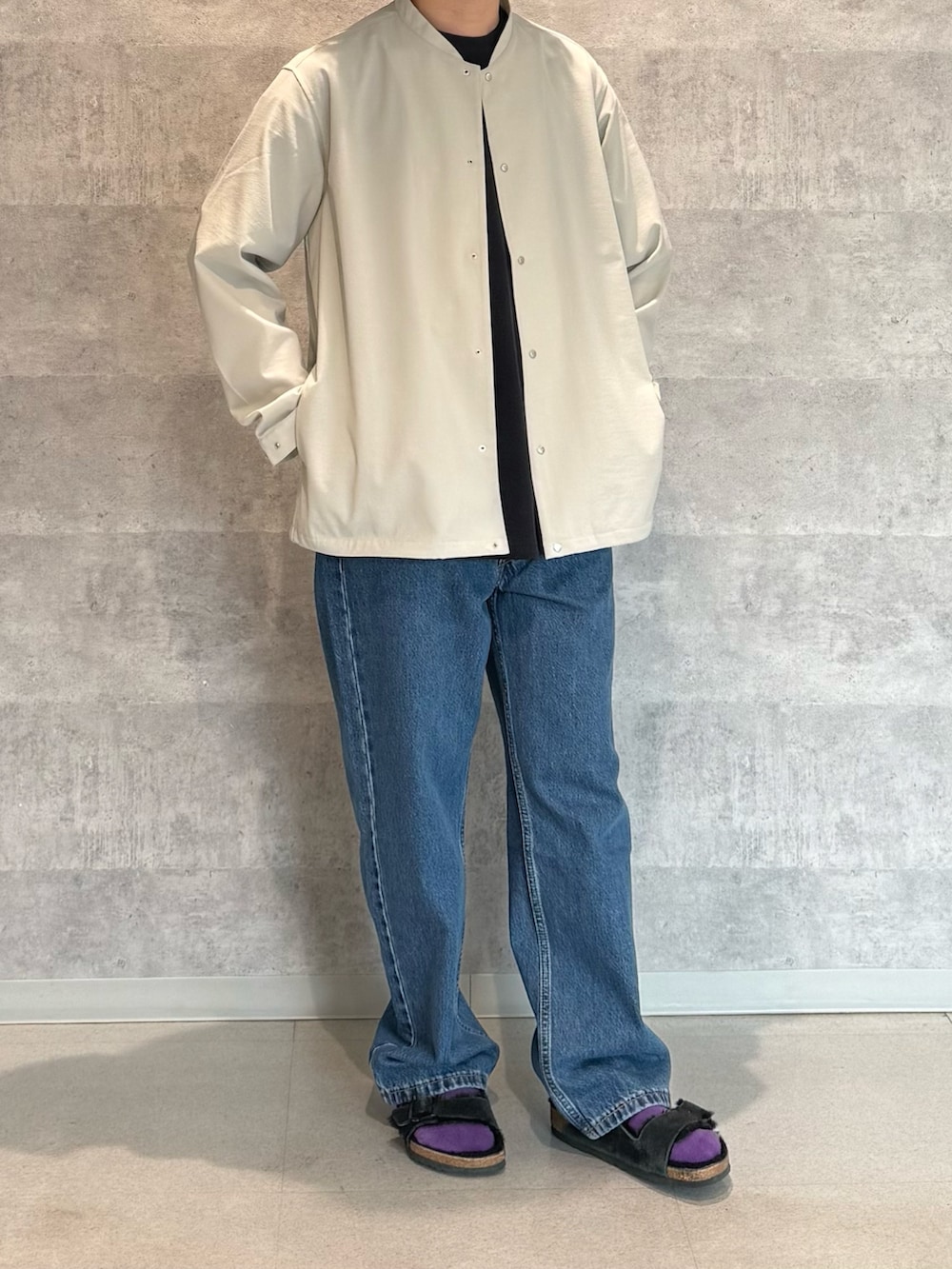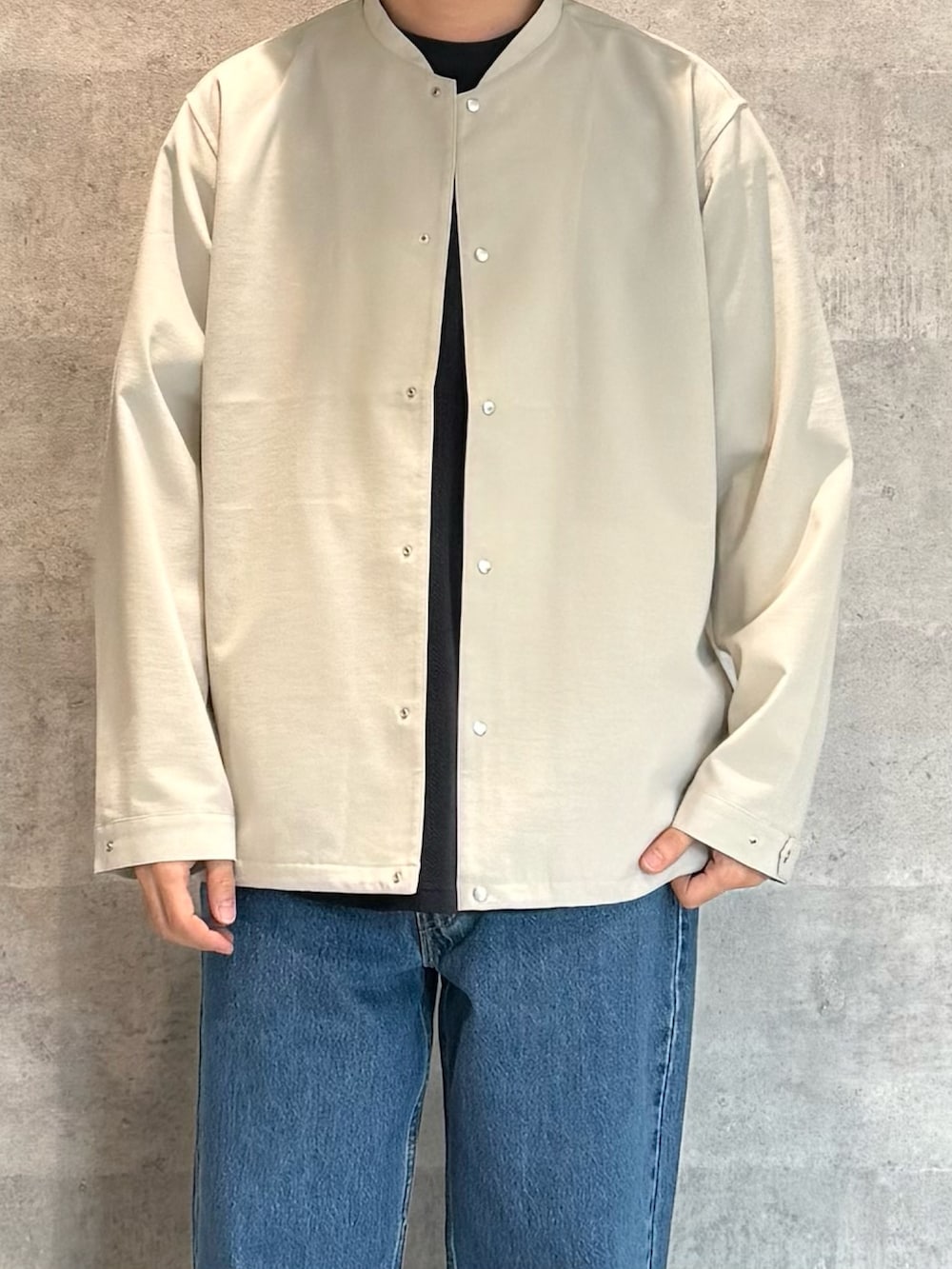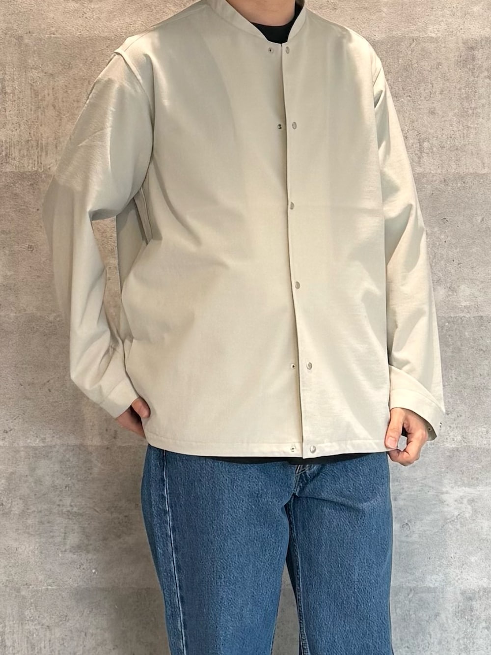 定番のノーカラーブルゾン。