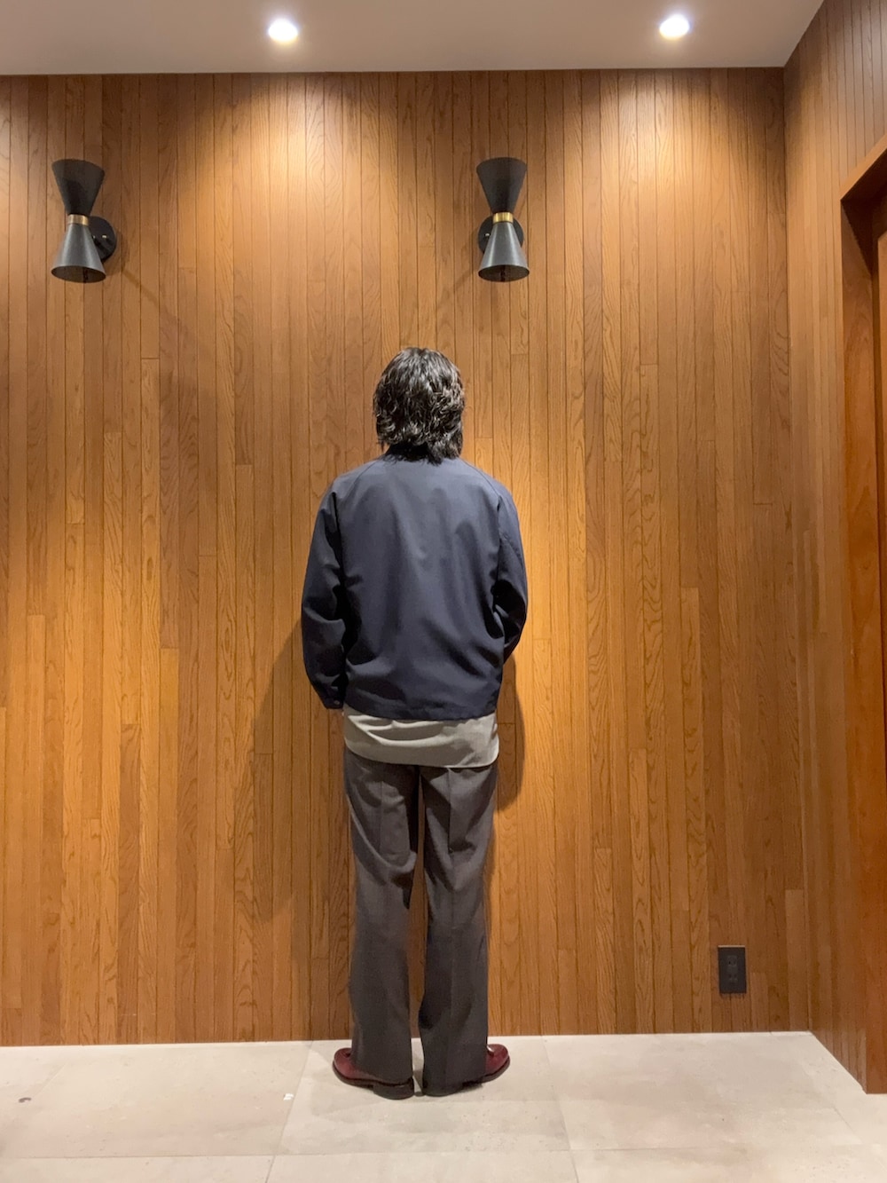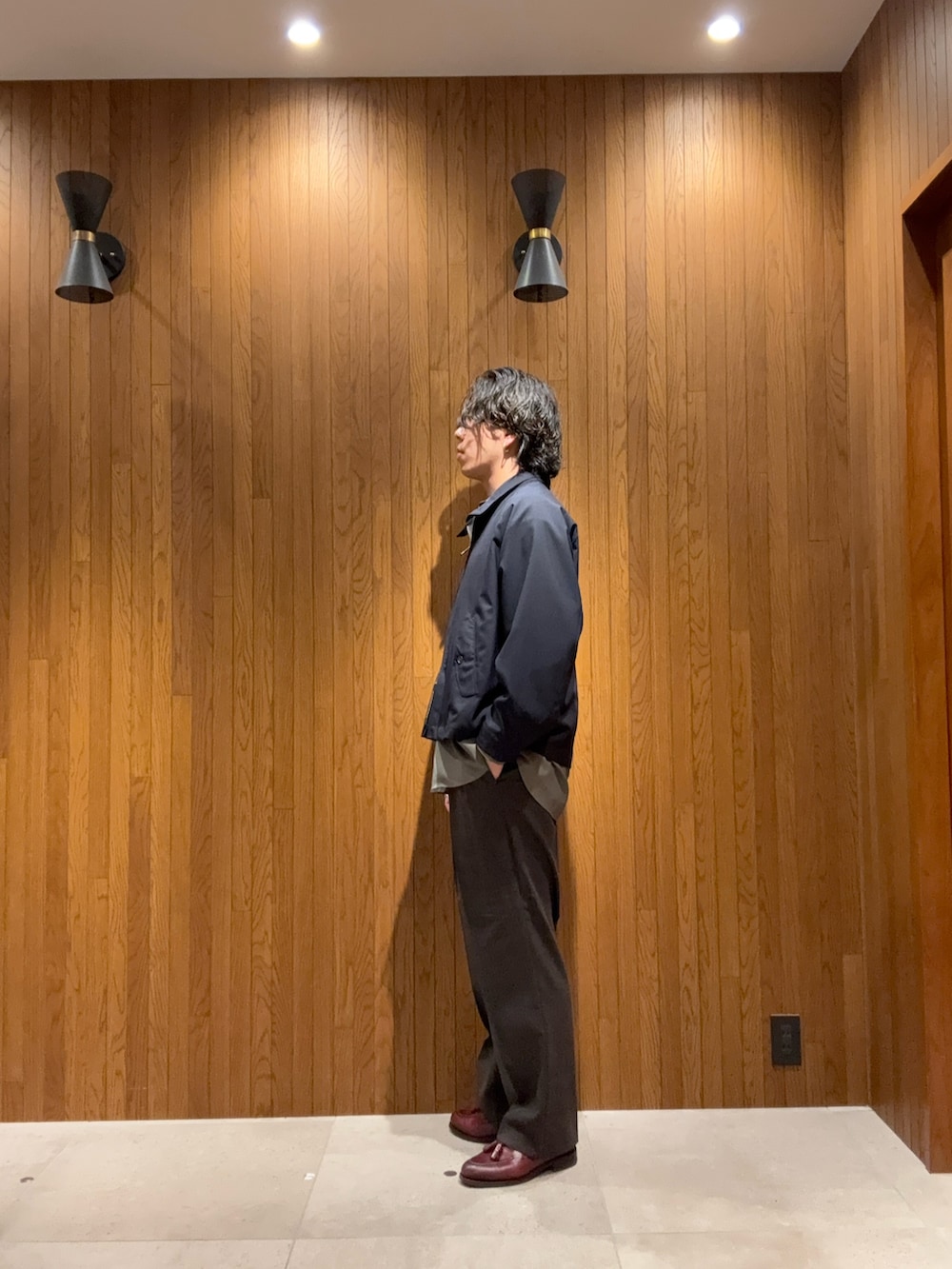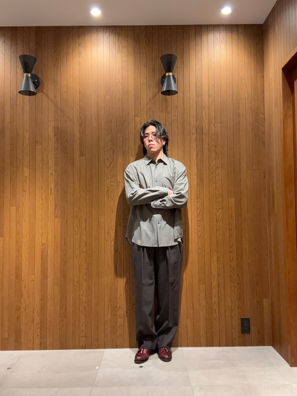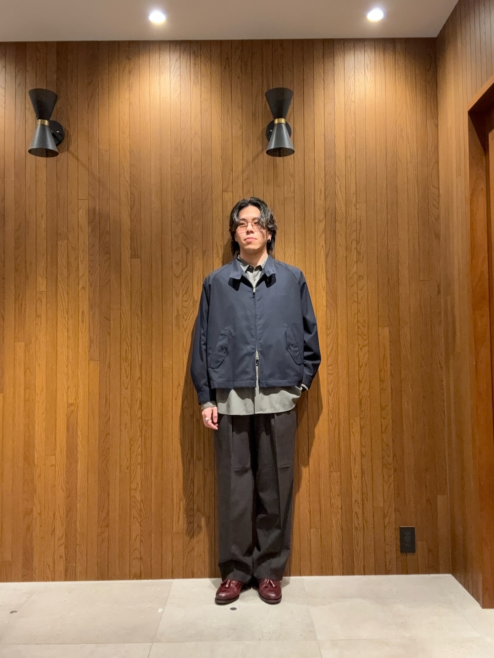 ボトムスはツータックのドレストラウザーでクラシックにまとめつつ、全体はリラックスしたサイズ感で今の空気感に。