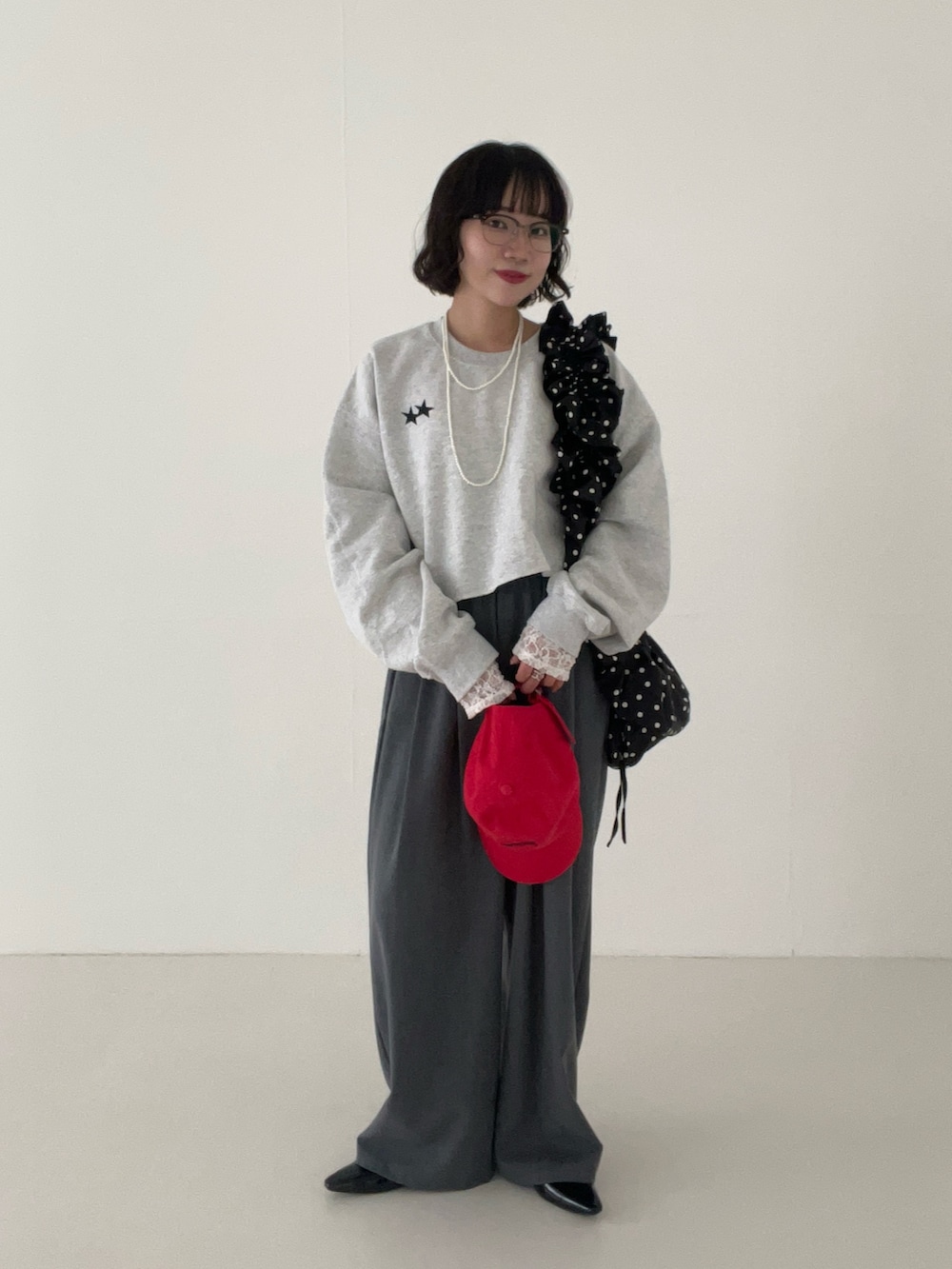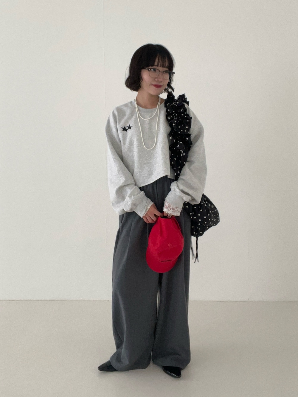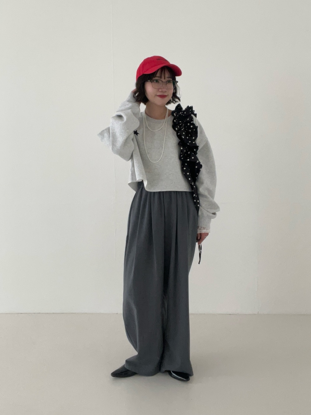 ベルトループ仕様のスラックスは1番小さいサイズでも大きいものがほとんどなので、、「ウエストがゴム、紐がついている」ことがボトム選びの中でマストです!(笑)