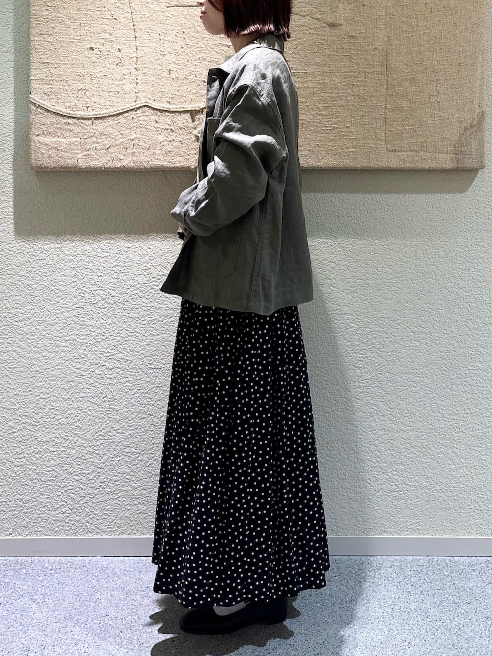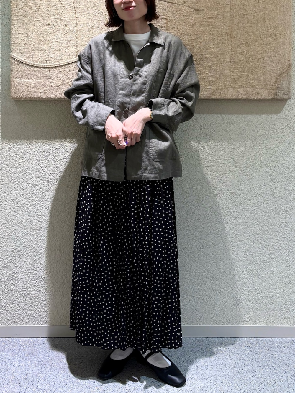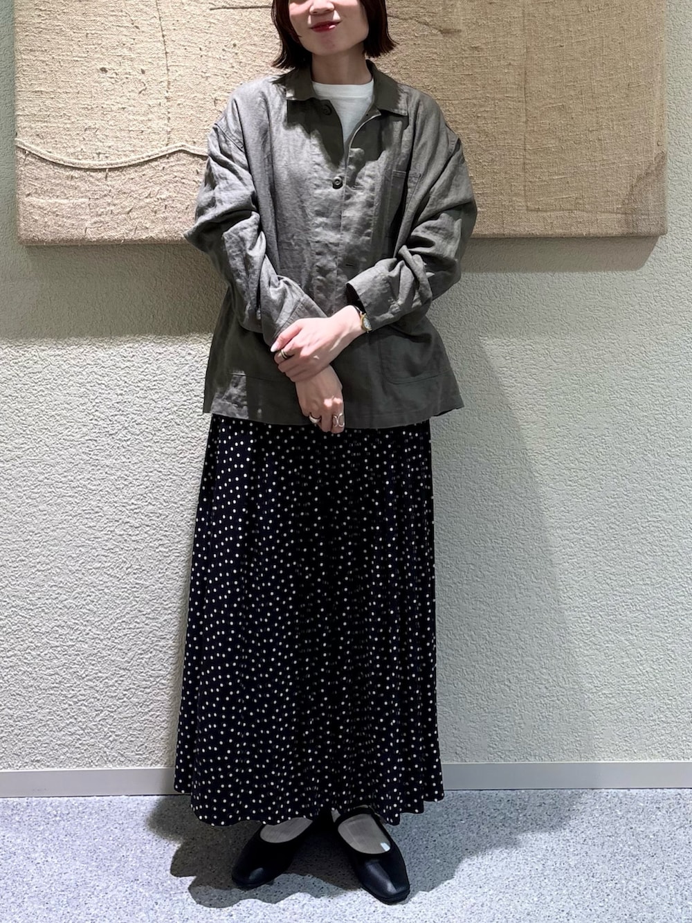 今回は1のサイズを着用してみましたが、2のサイズと比べると着丈も身幅もややスッキリめなので、スカートなど広がるシルエットのボトムスとのバランスが綺麗です◎