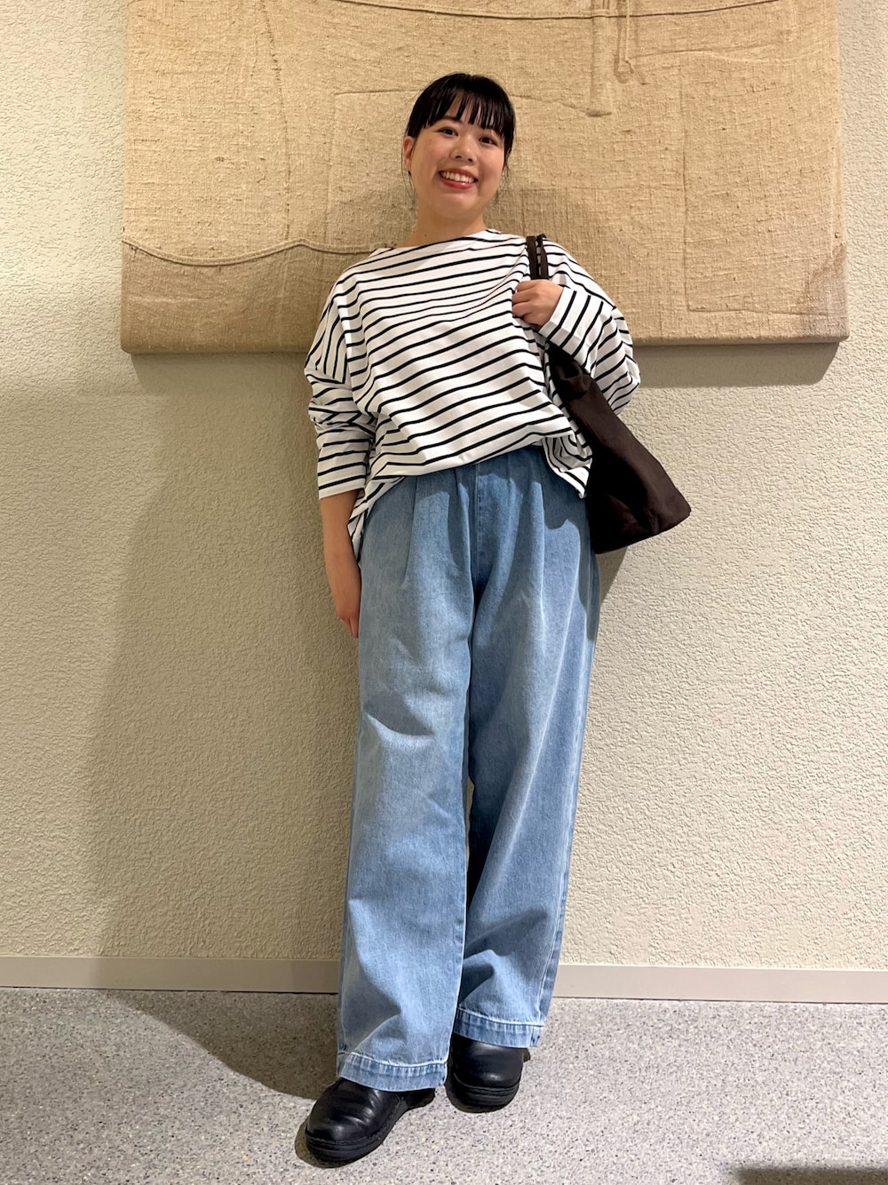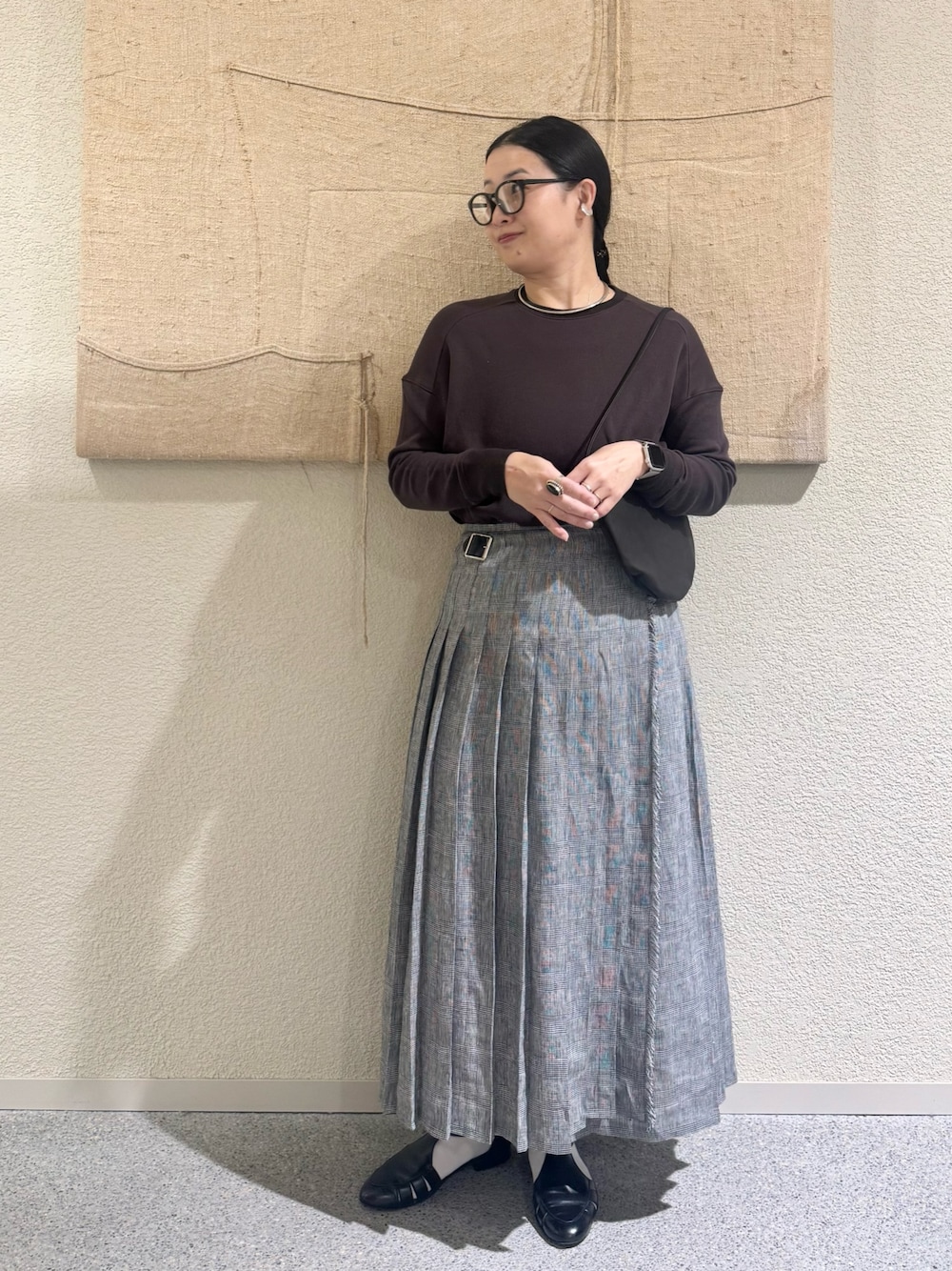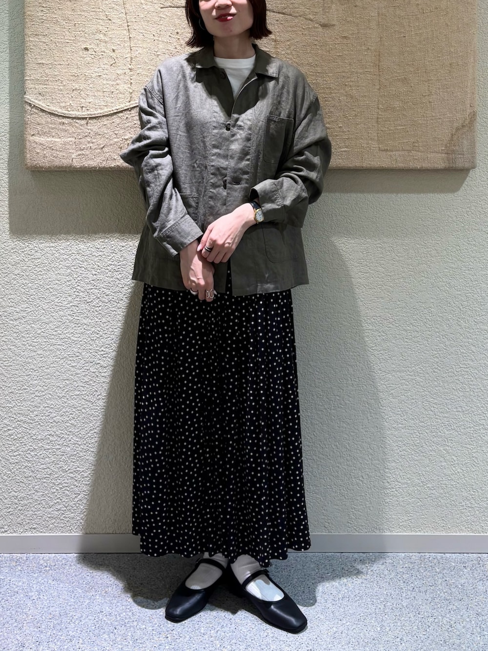今回は1のサイズを着用してみましたが、2のサイズと比べると着丈も身幅もややスッキリめなので、スカートなど広がるシルエットのボトムスとのバランスが綺麗です◎