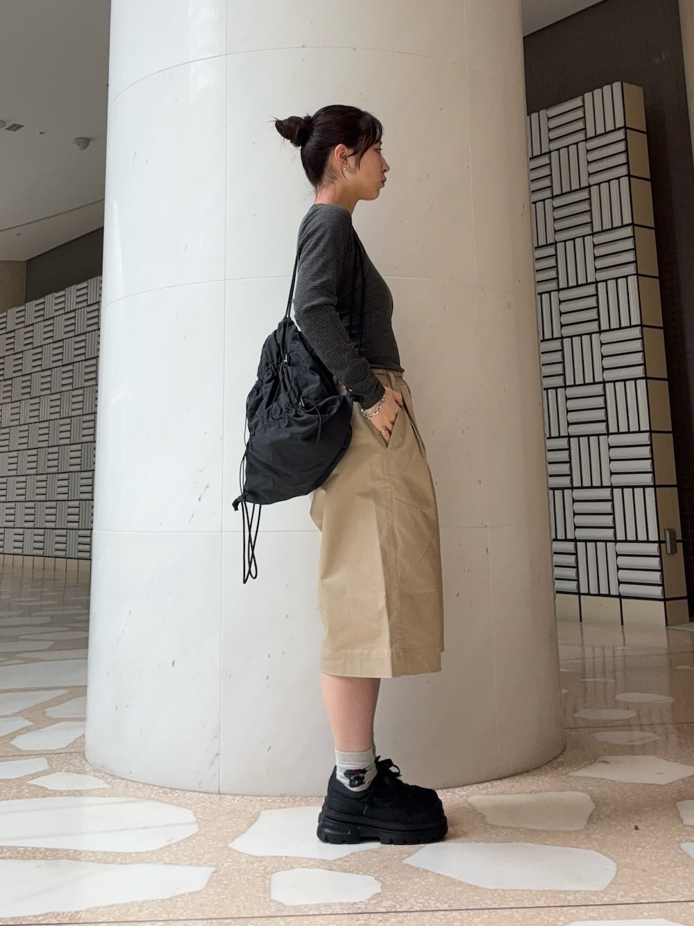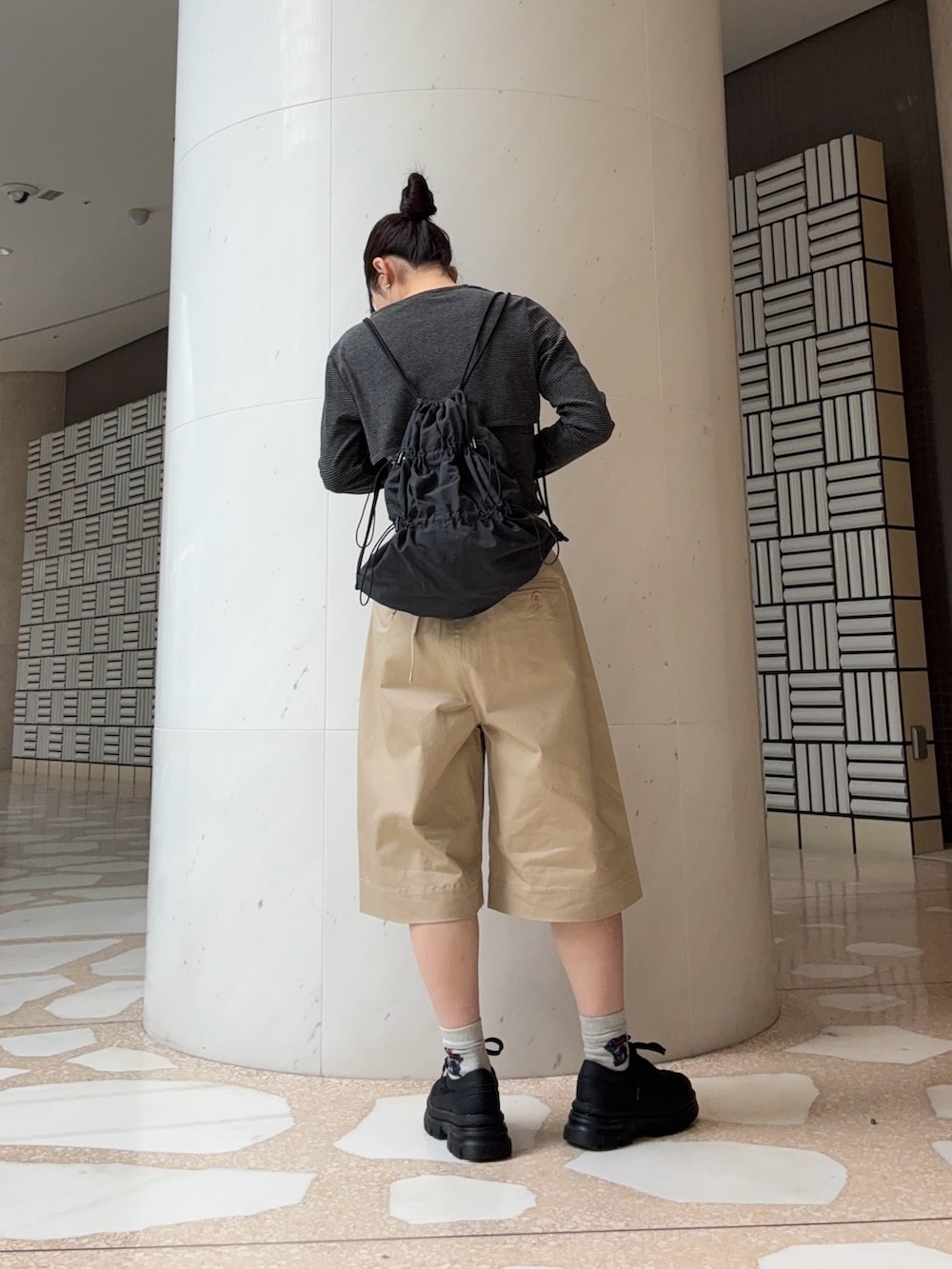 ハーフパンツ×バックパックでスポーティーな雰囲気ですが、キャミソールのクロス部分が女性らしさもプラスしてくれます🎒