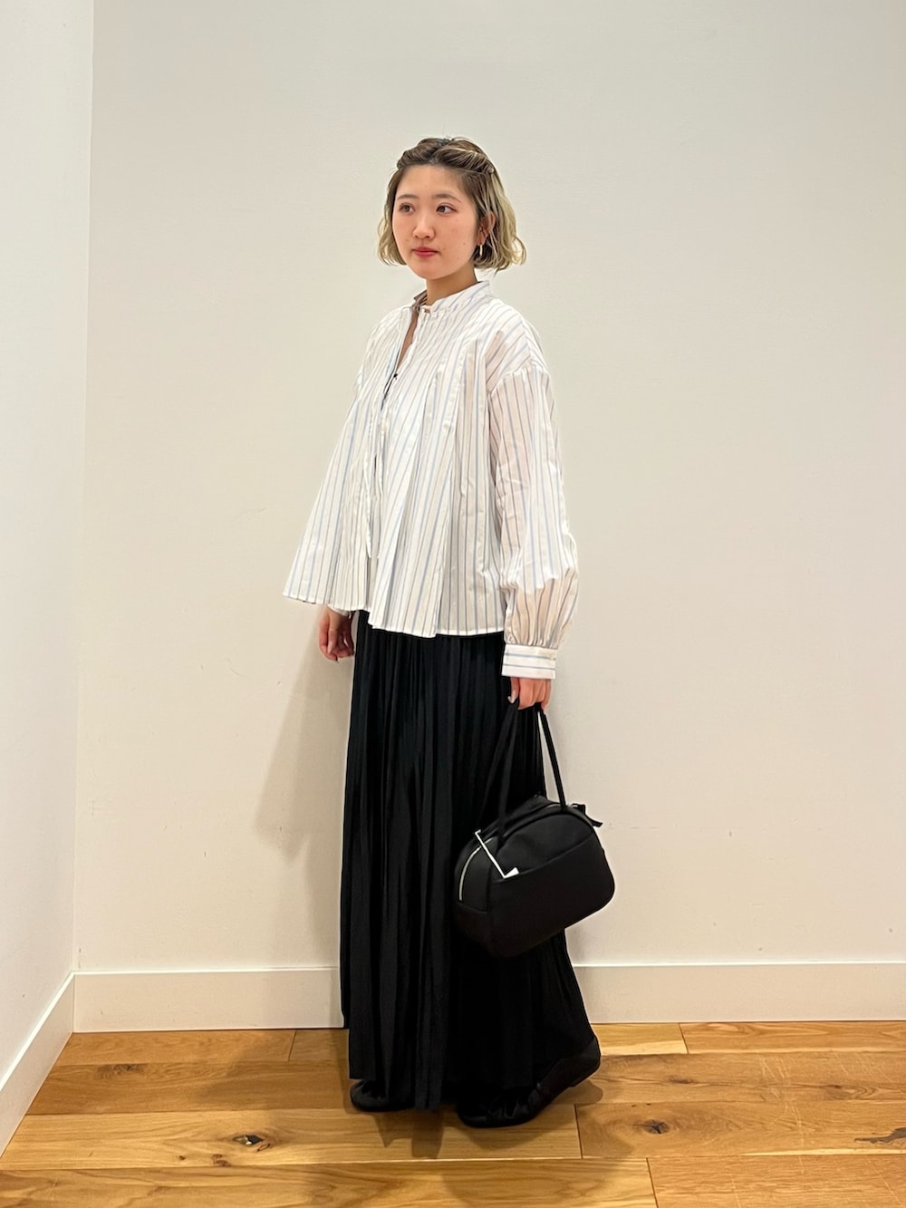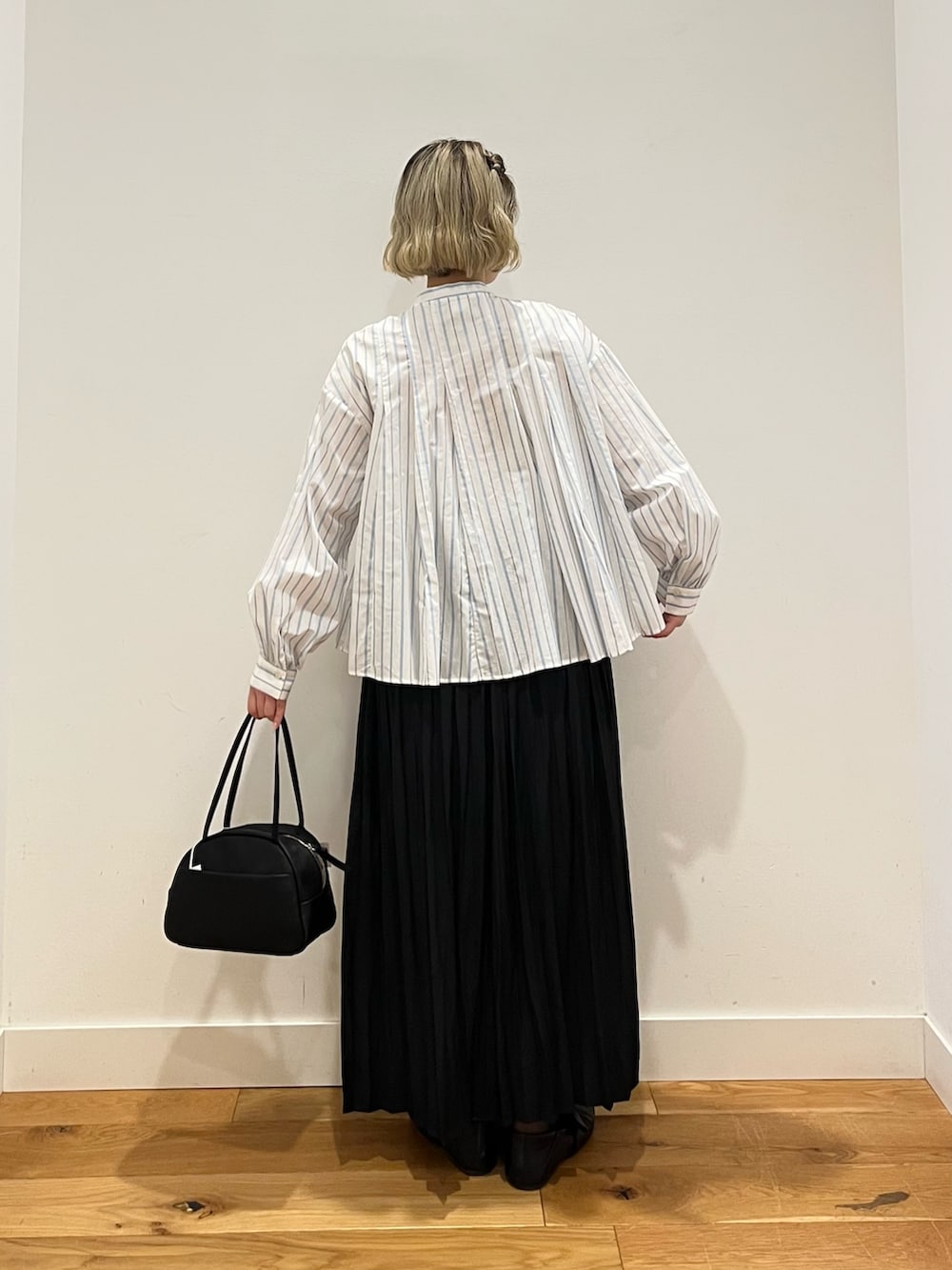 タックとフレアーを贅沢に取り入れた立体的なシルエットが特徴で、シンプルながらも華やかさのある一枚。