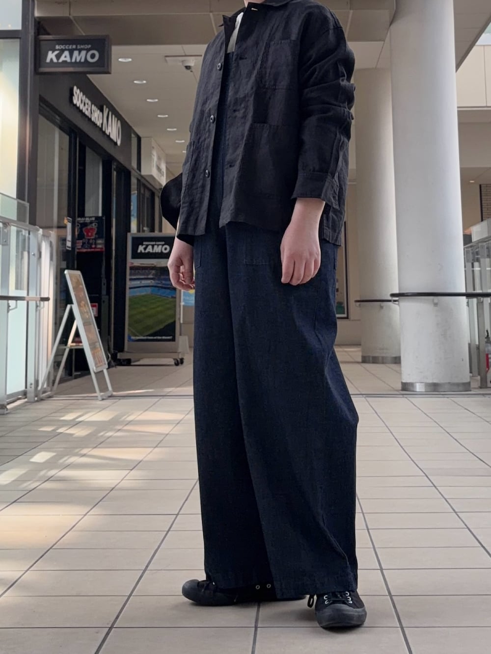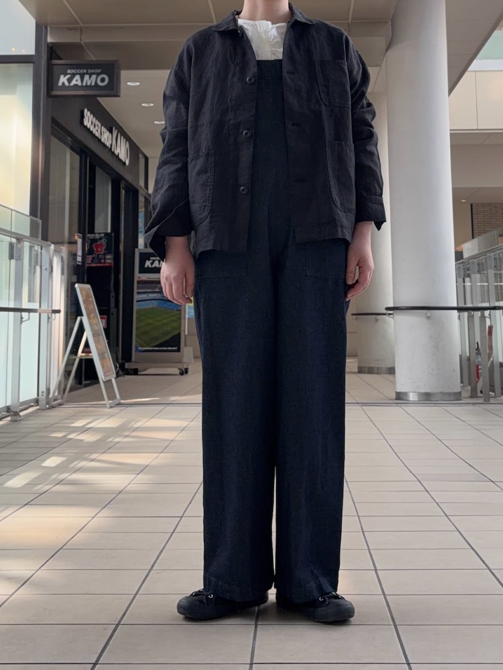 今回はさりげないフリルがポイントのブラウスをインナーに。リネンのカバーオールを羽織ってカジュアルダウンした装いに。