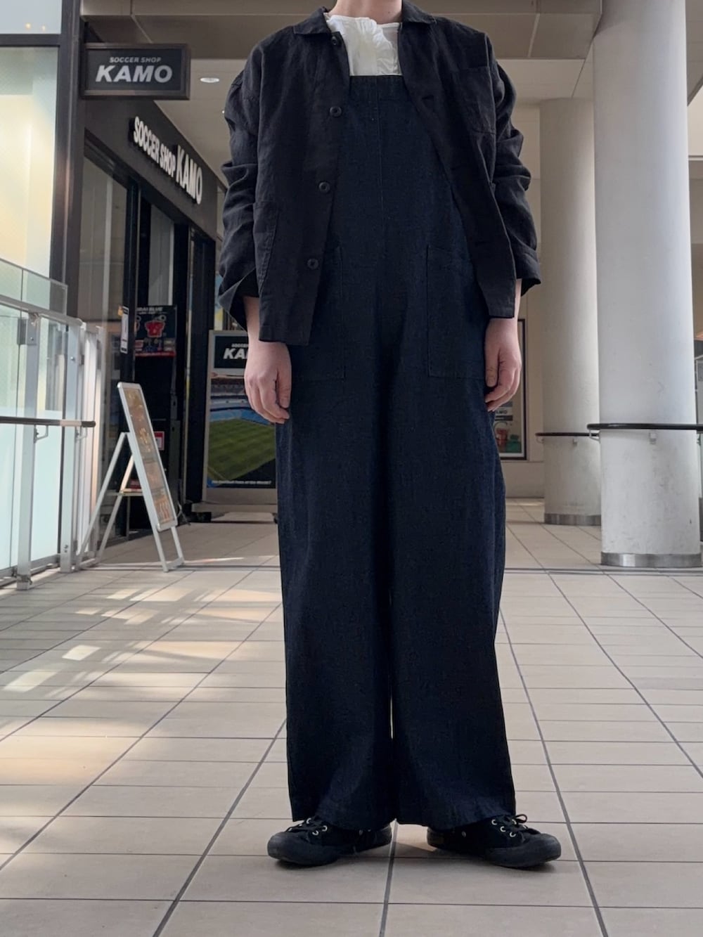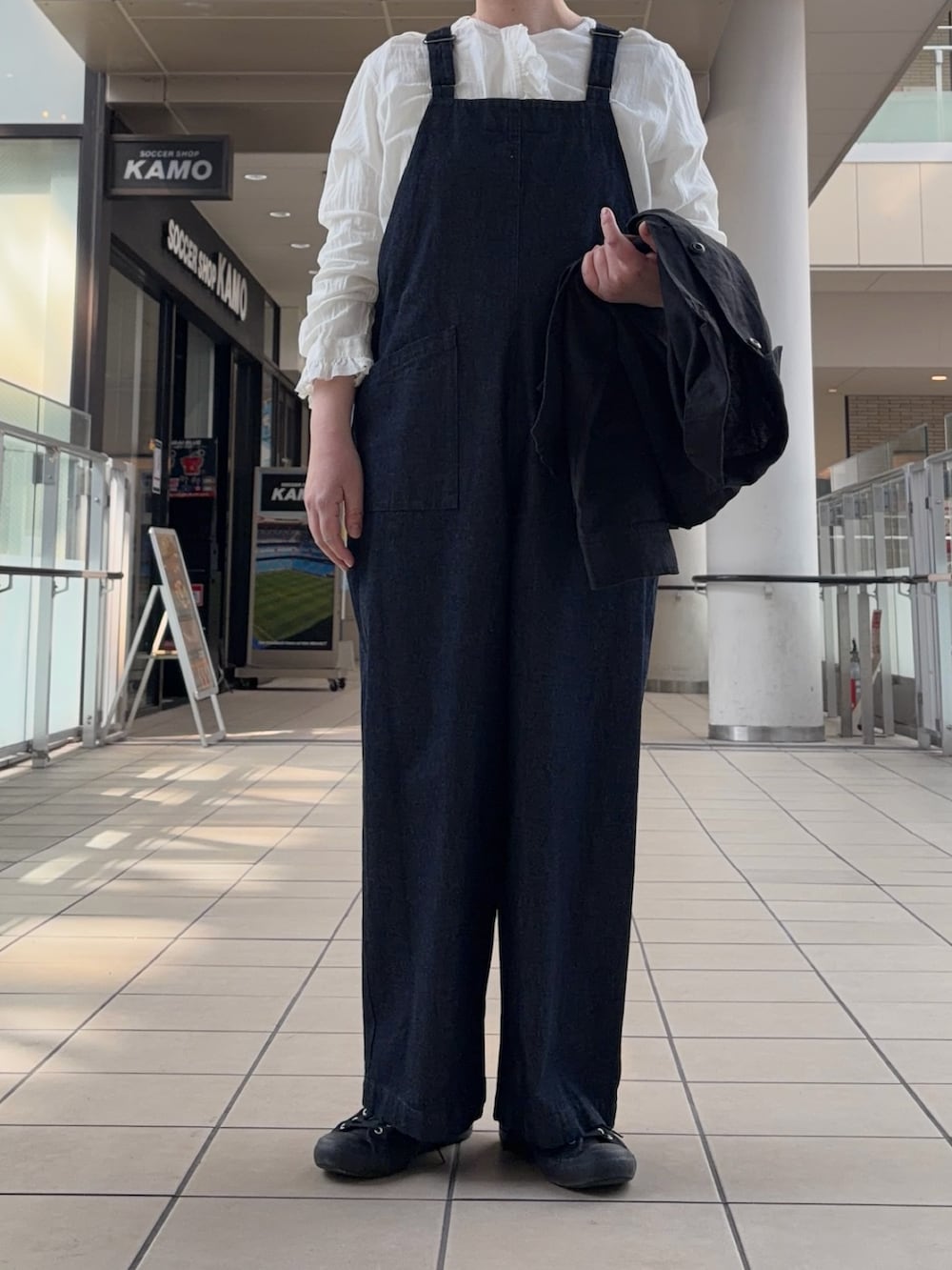 サロペットにカバーオールを合わせた大人カジュアルです。