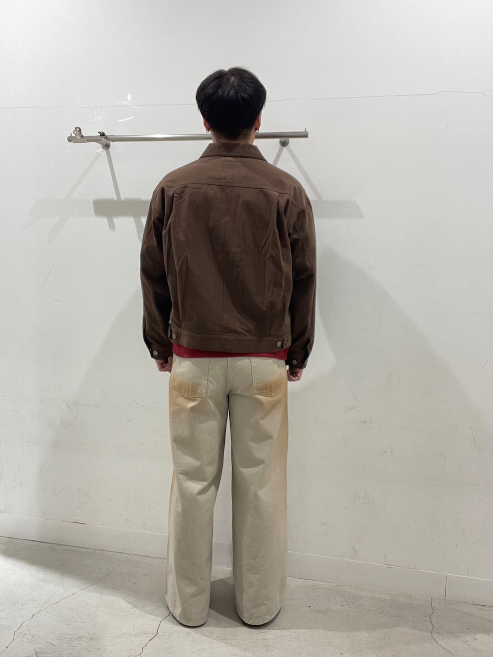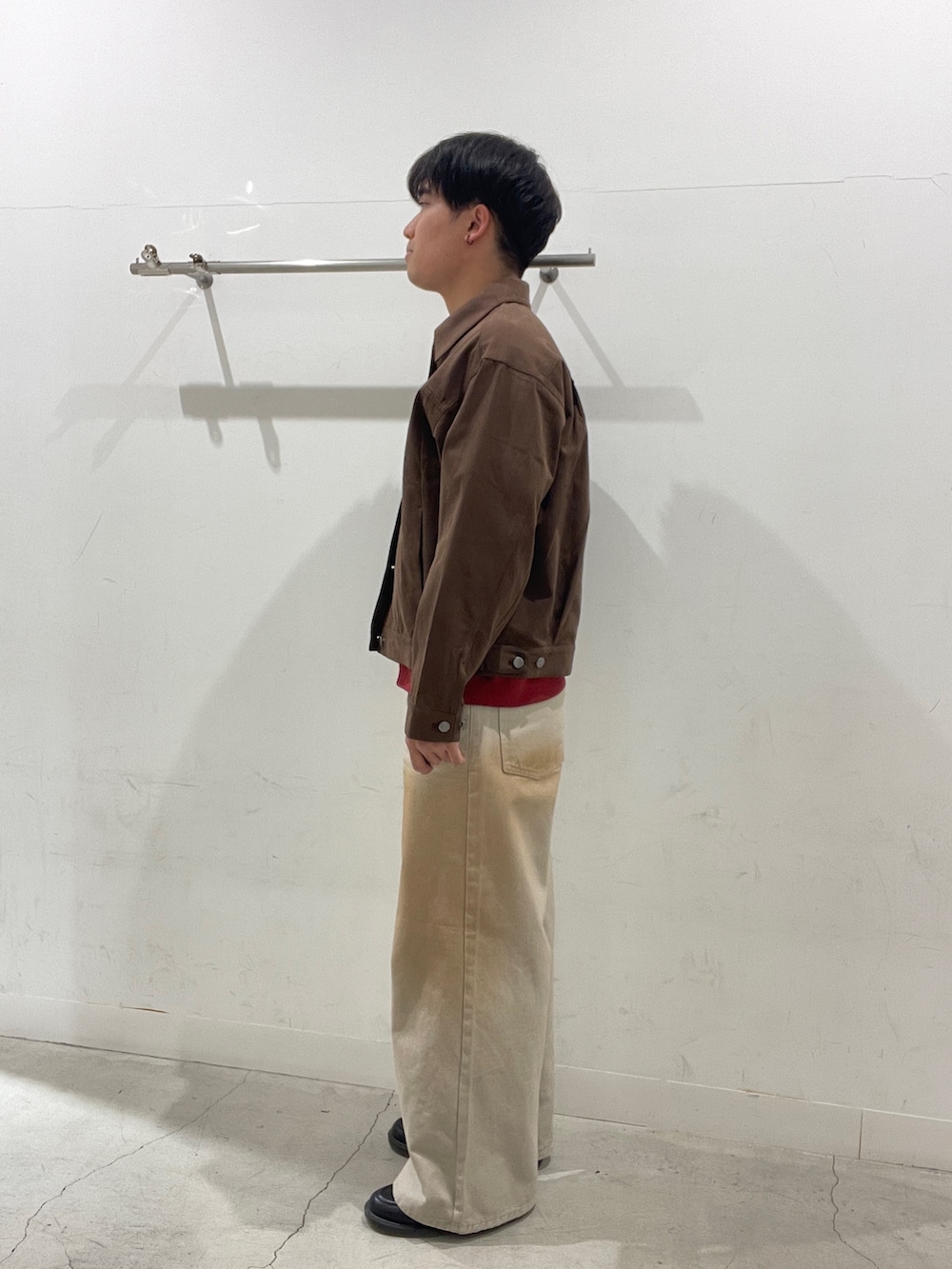 ブラウンジャケットをベースに赤Tでアクセント。