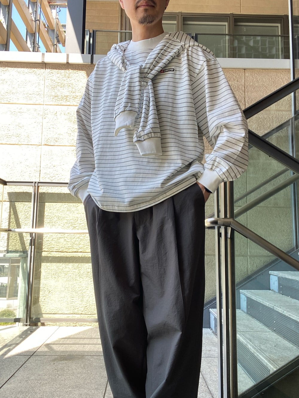 繊細なピッチのボーダーに対して、胸元のボックスロゴがアクセントに。
