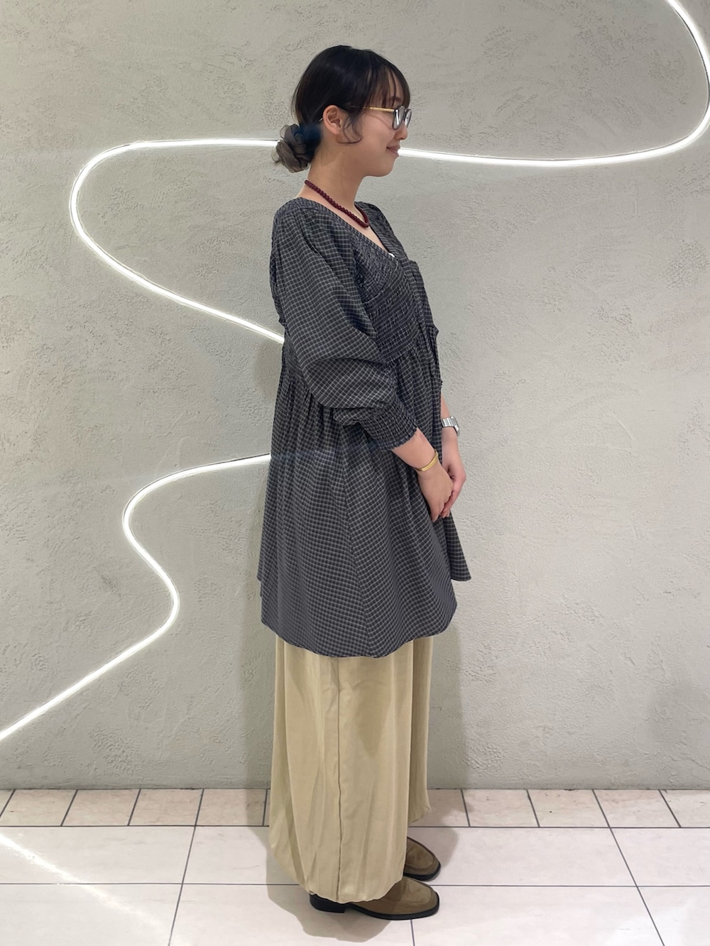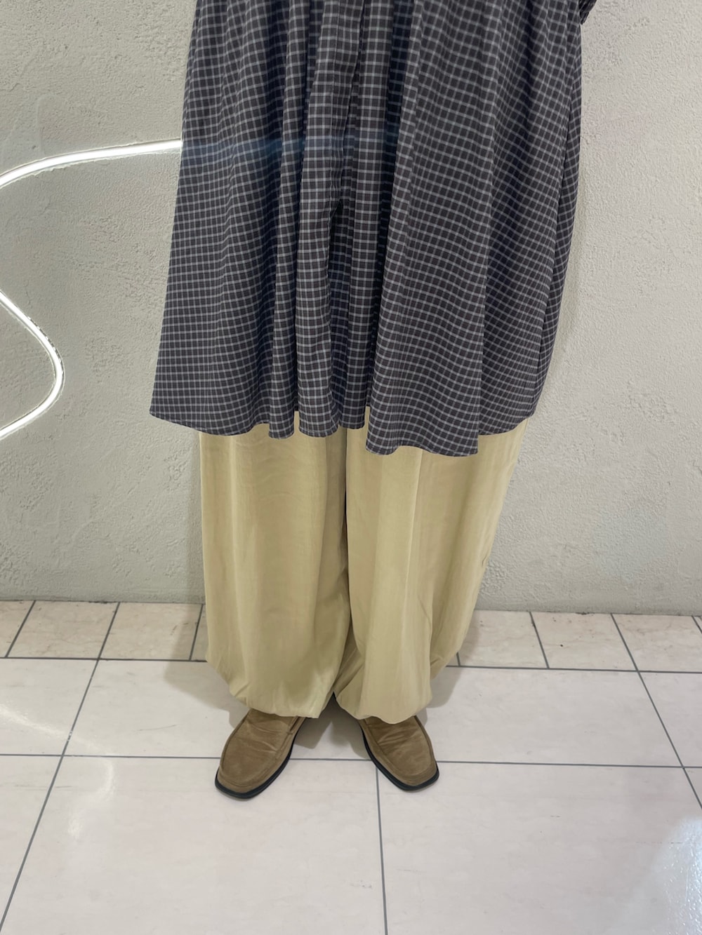 高身長さんはウエストで履くと、少し溜まりがスッキリめになるので、裾をたっぷりと溜めたい方は腰履きで試していただくのが◎