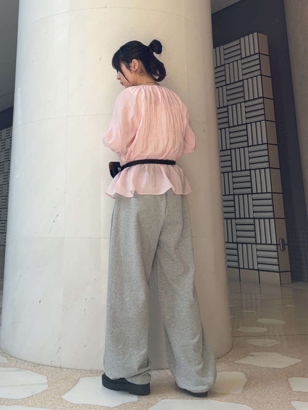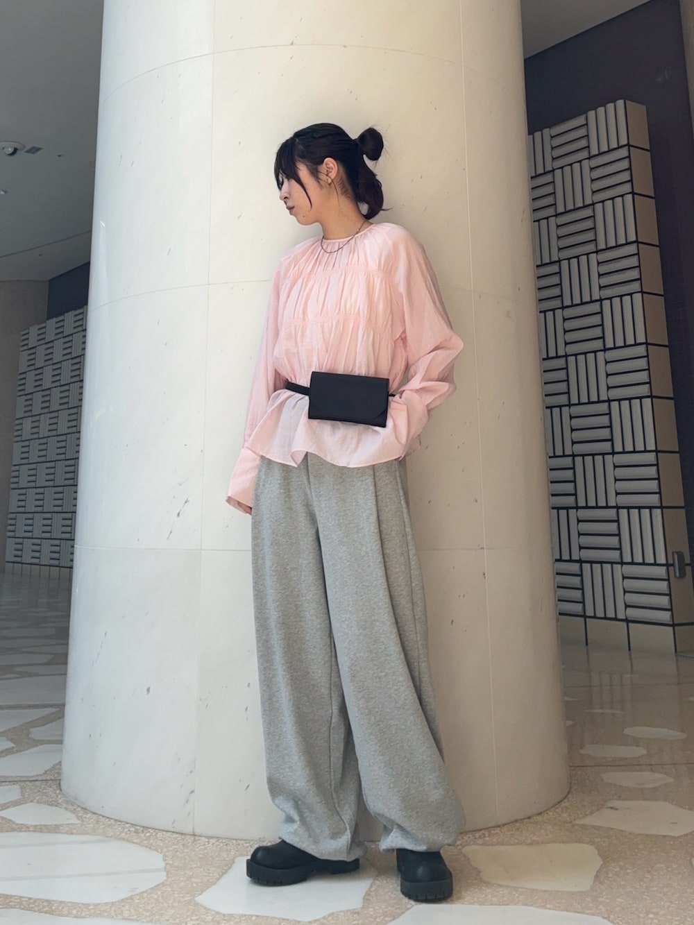 シャーリングが入っていて可愛らしいイメージのブラウスは、スウェットパンツと合わせると甘くない雰囲気になります⁎⁺˳✧༚