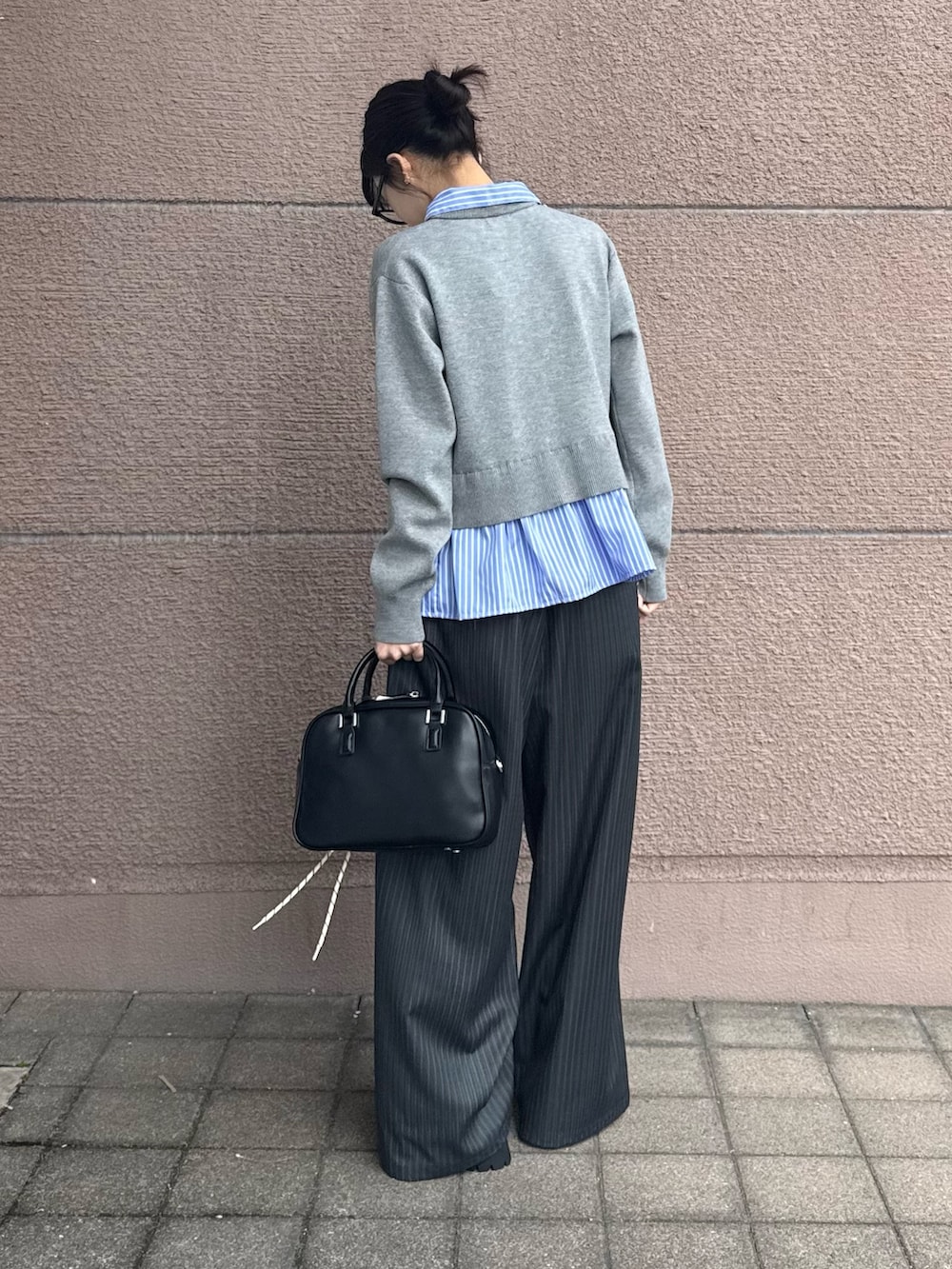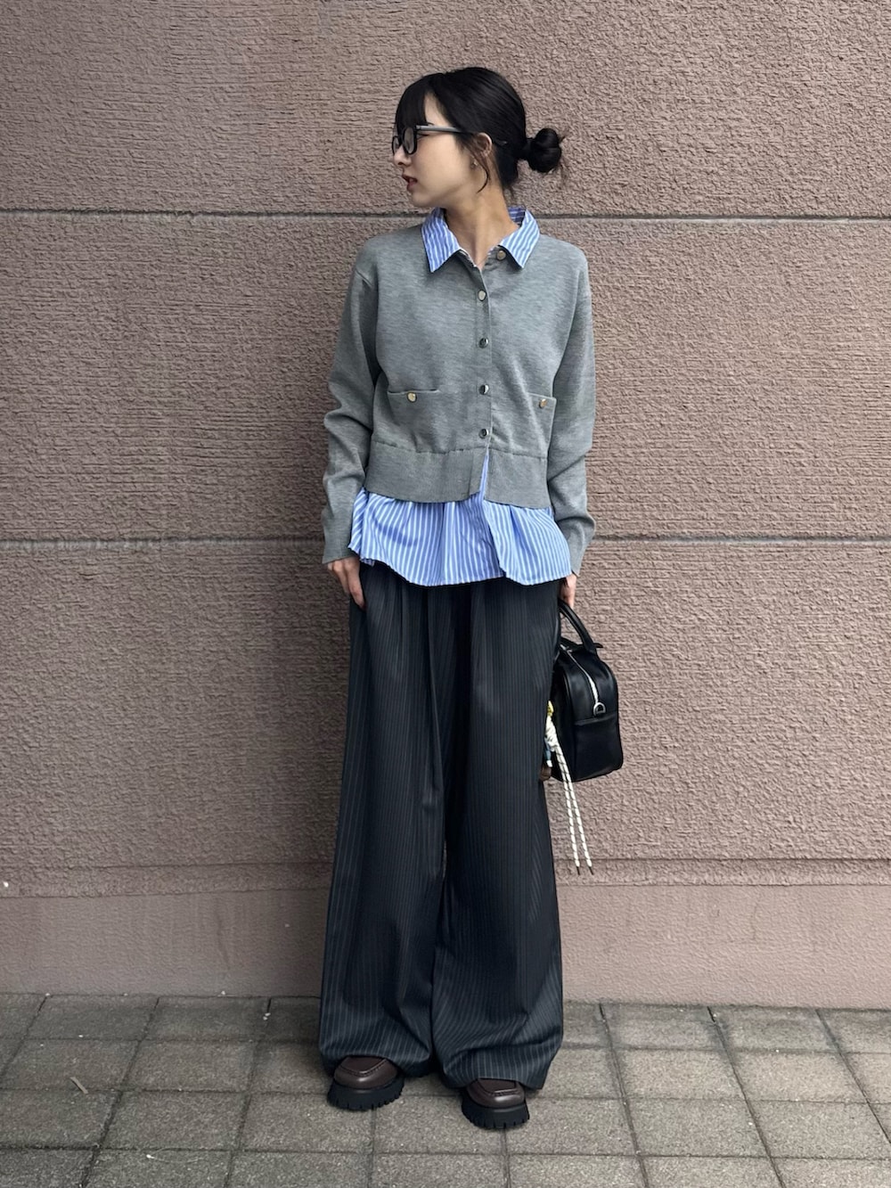 ボトムスはギャザーストレートパンツでシルエットとデザインが可愛いアイテムになっています!太めのストレートパンツに細めのストライプがとても可愛く着回ししやすいかなと思いました!