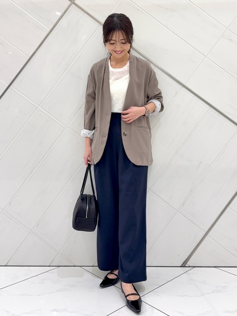 インナーに着ているレースカットソーと一緒に袖を捲ると裏地のようになって可愛いのでおすすめです。
