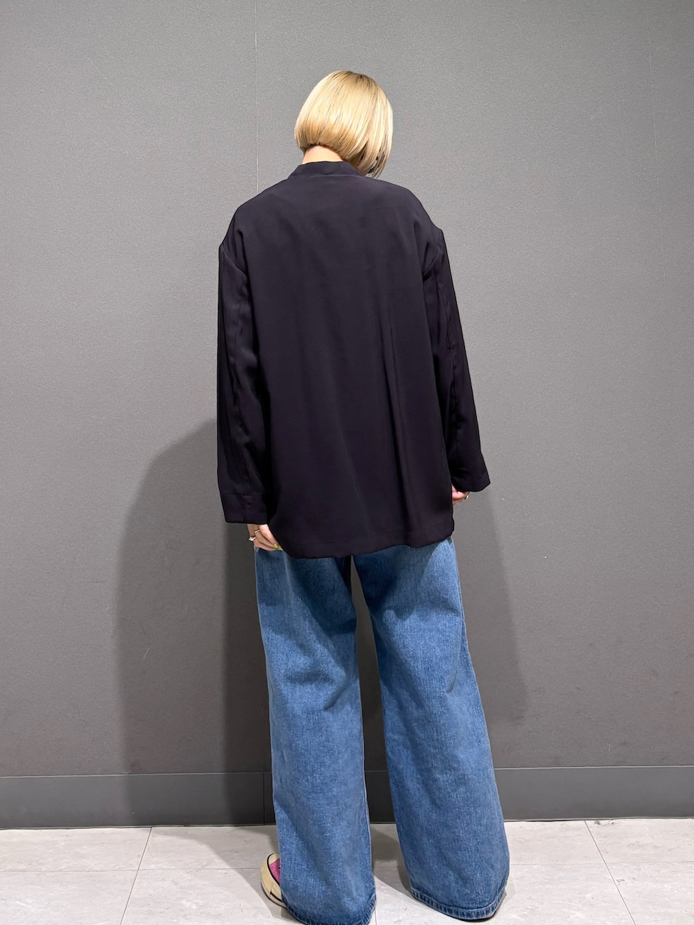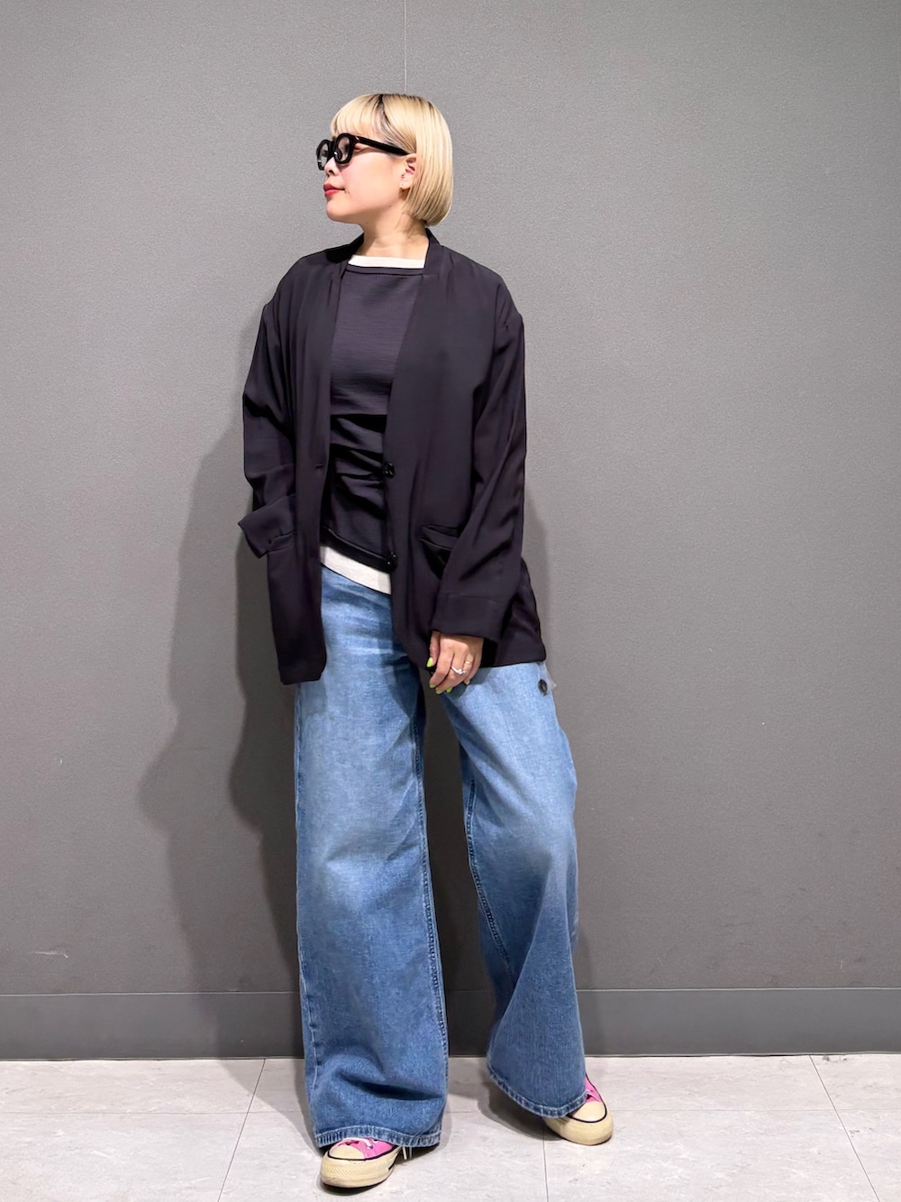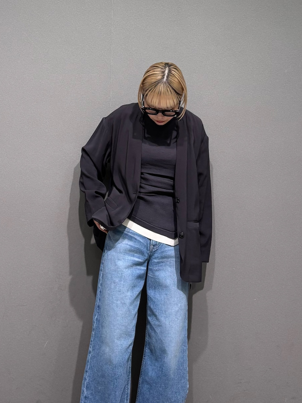 ノーカラージャケットを羽織って