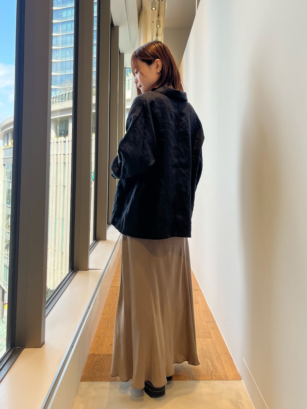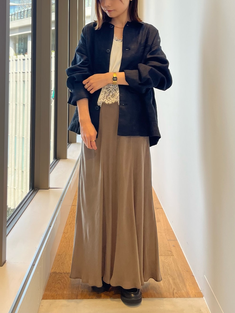 キュプラスカートを合わせてカジュアルになりすぎない、大人かわいいスタイリングにしました。