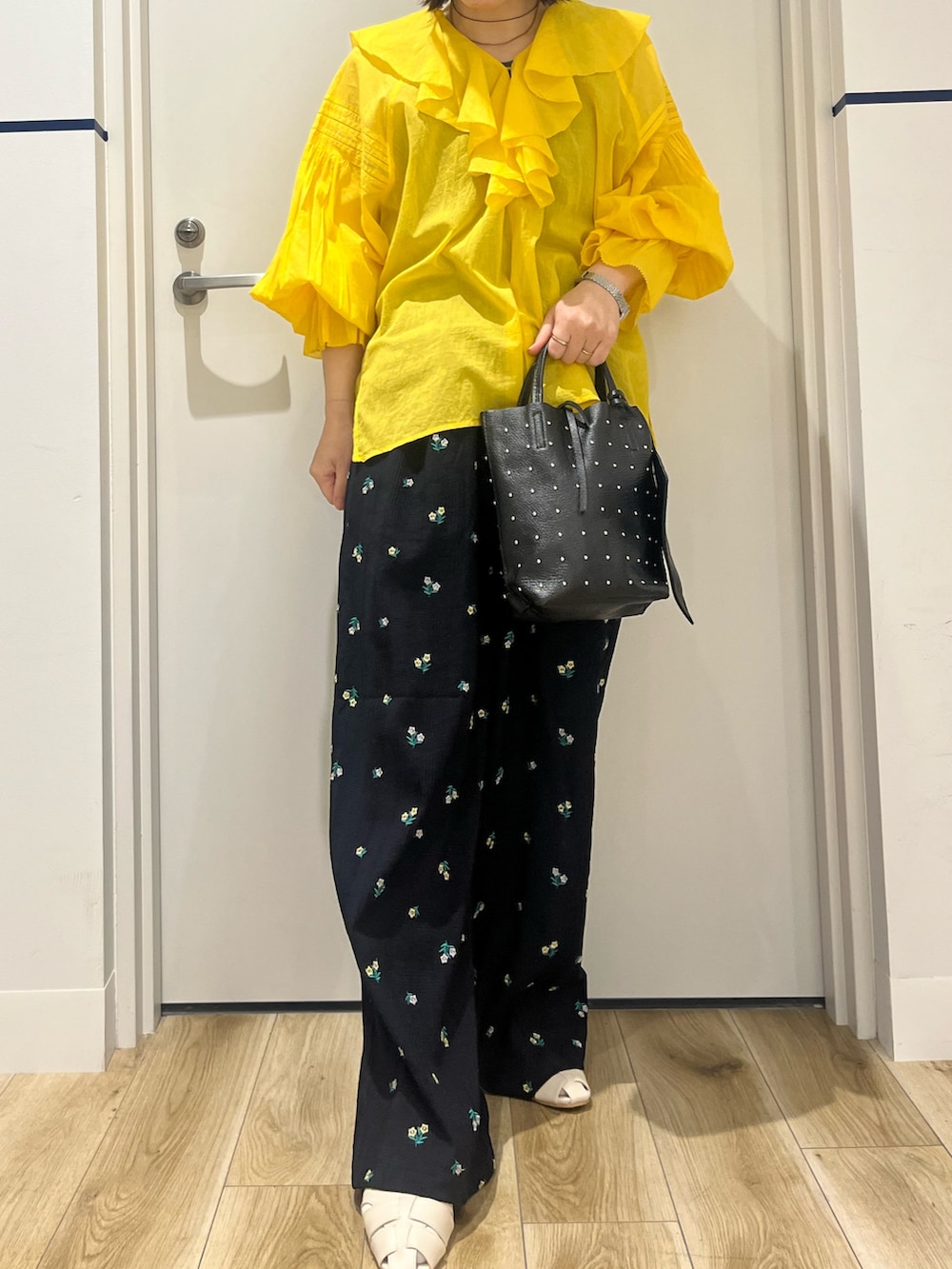フラワー刺繍イージーパンツに合わせましたが、ボトムは選ばずにデニム、スカート、