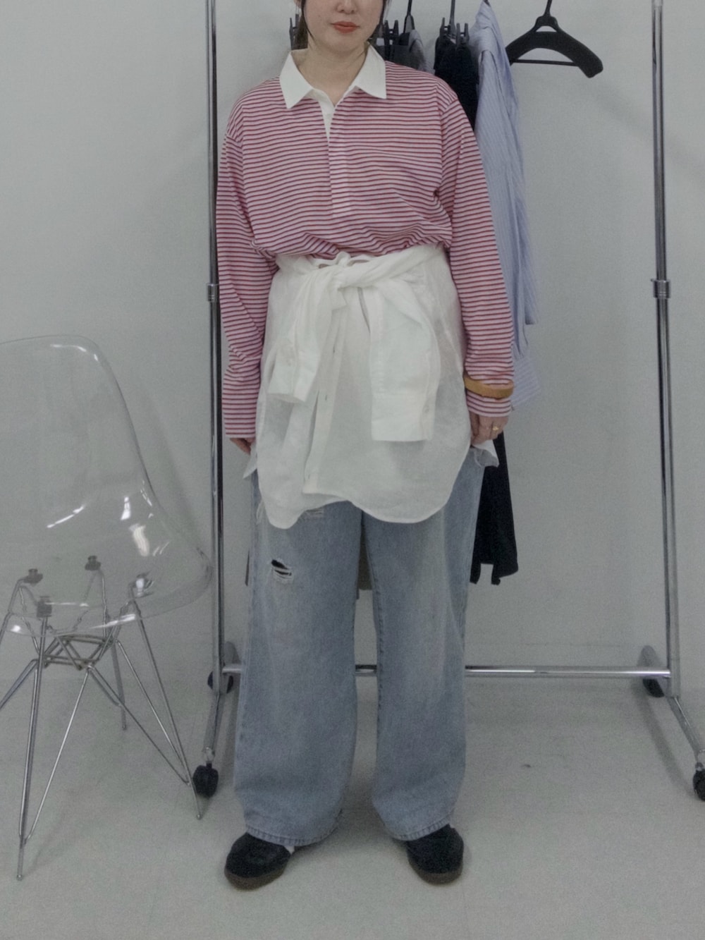 白いリネンシャツを腰巻きにして
