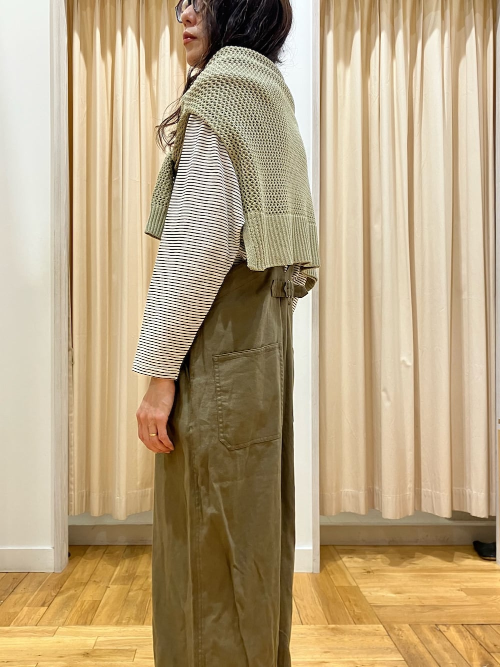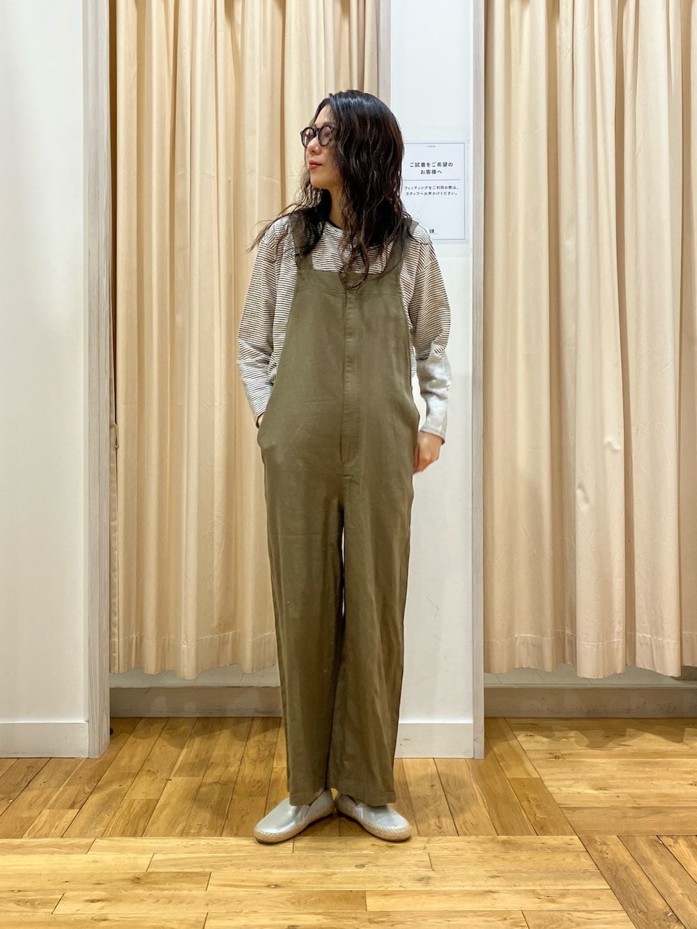 着脱のしやすいフロントジップのサロペット。Mサイズ、後ろのボタン調節は最長にして、くるぶしが隠れるくらいのちょうど良い長さでした。綿麻の柔らかい素材でナチュラルな雰囲気に◎