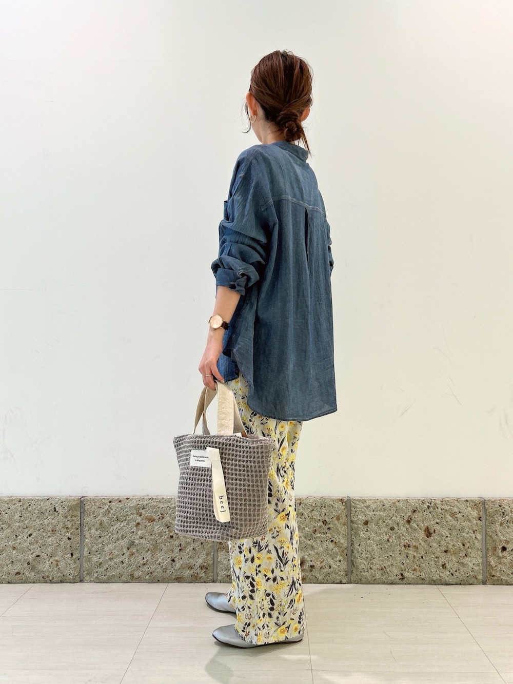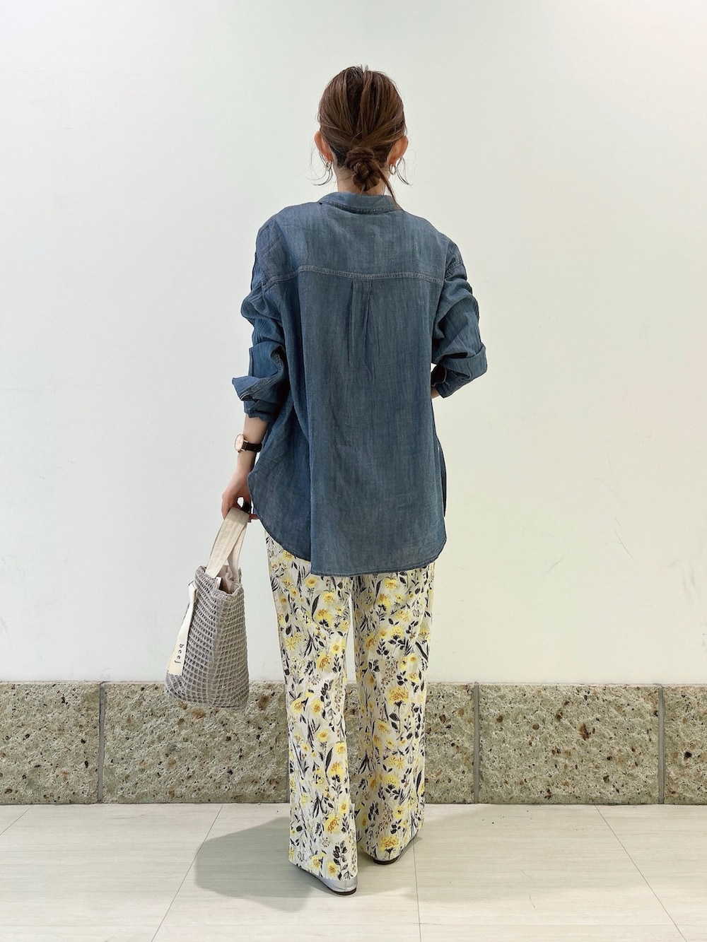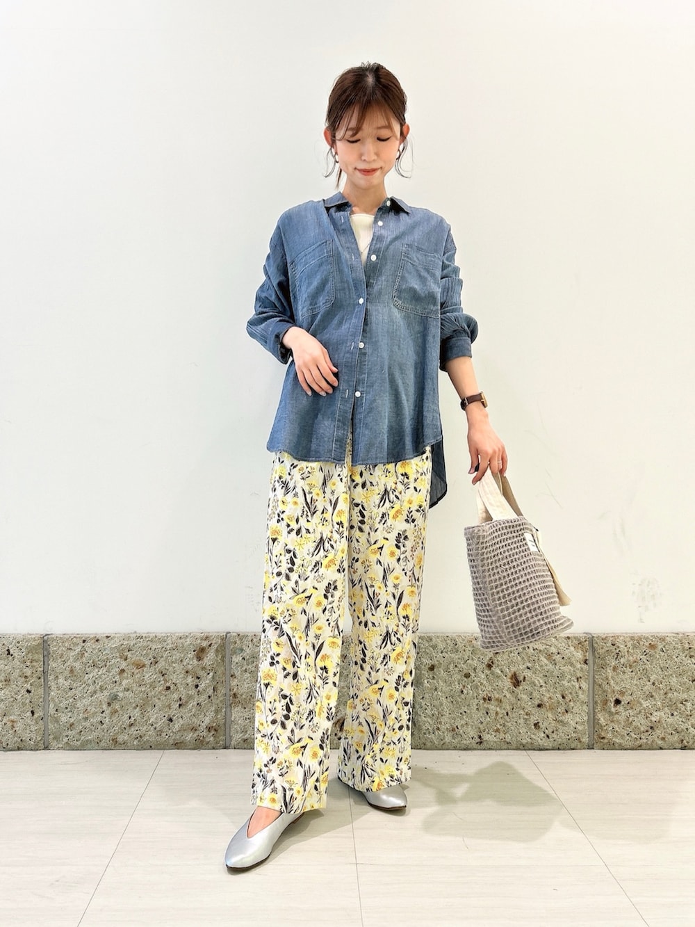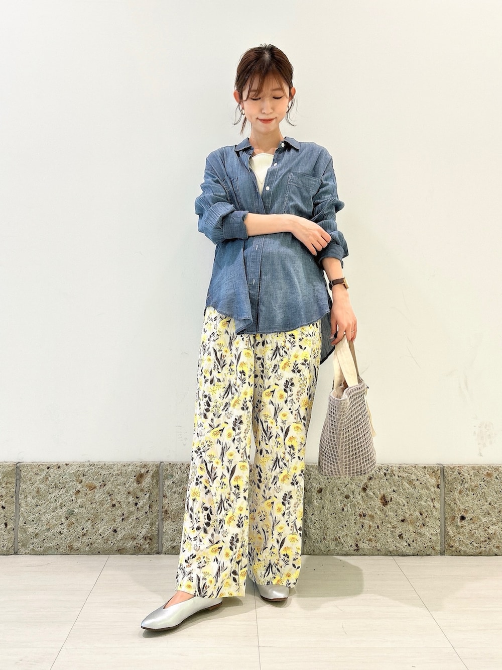 ボトムには花柄のワイドパンツを。