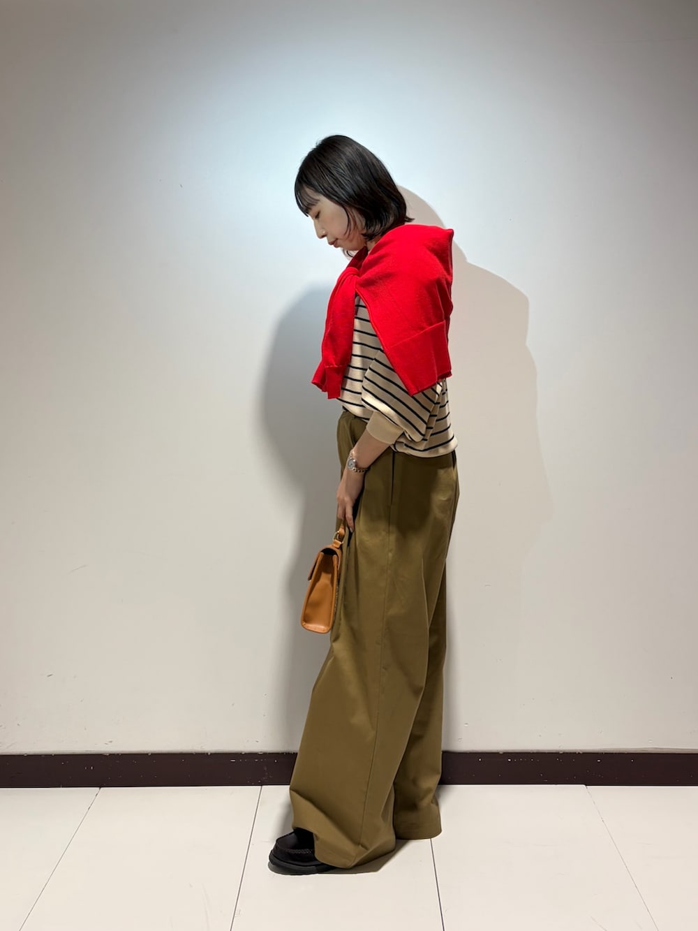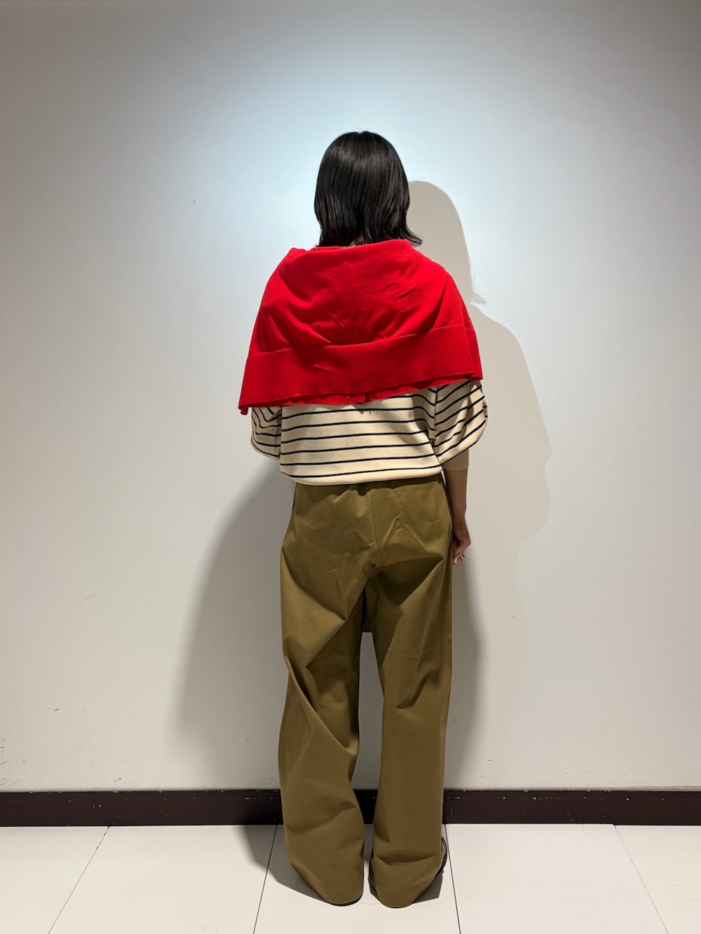 赤のカーディガンをかけてアクセントに❤️