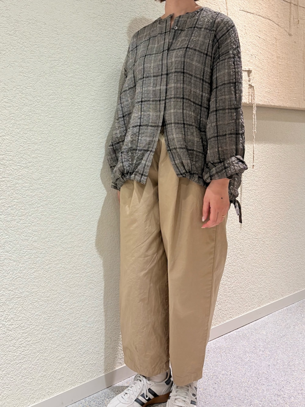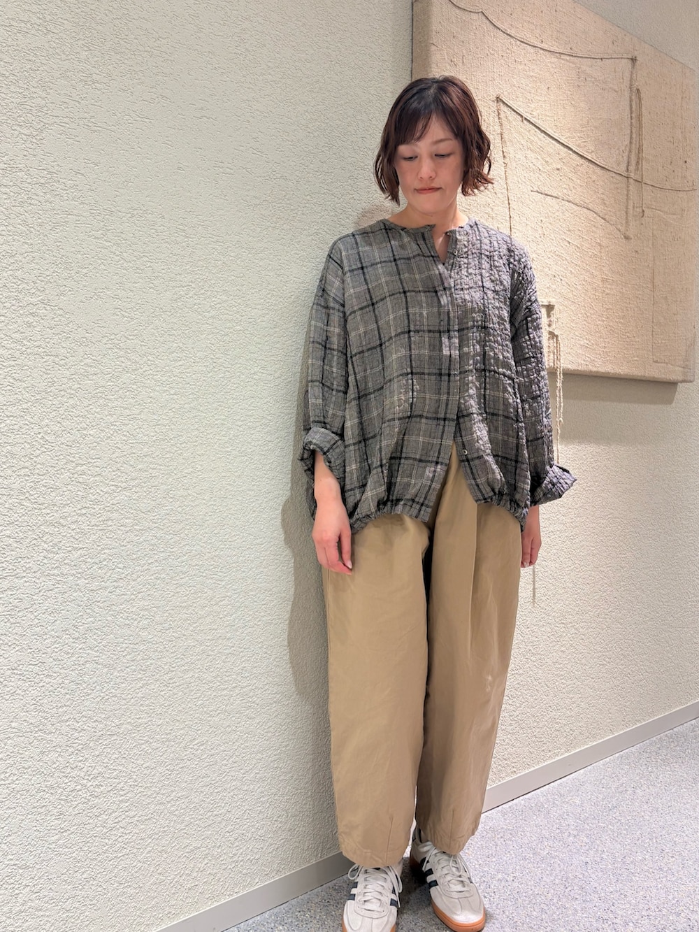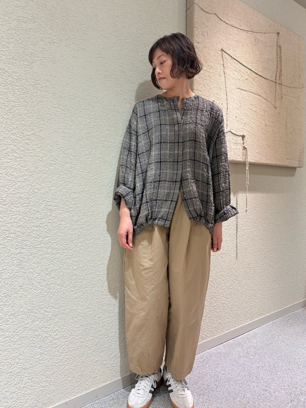 立体感のあるシャーリング生地の合わせやすいチェック柄で、カーディガンとして羽織っても可愛いです。