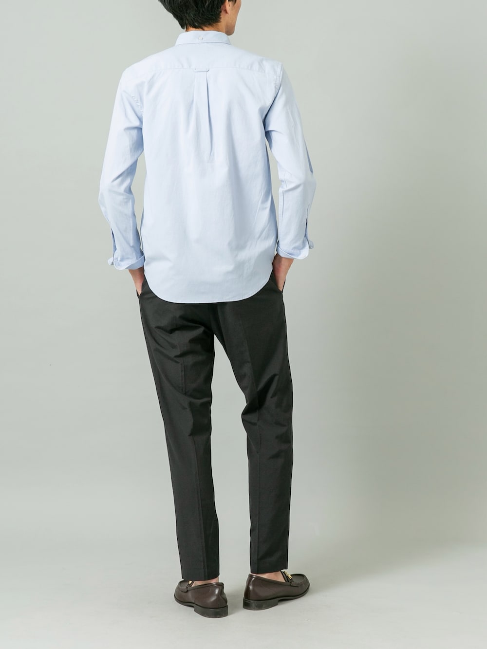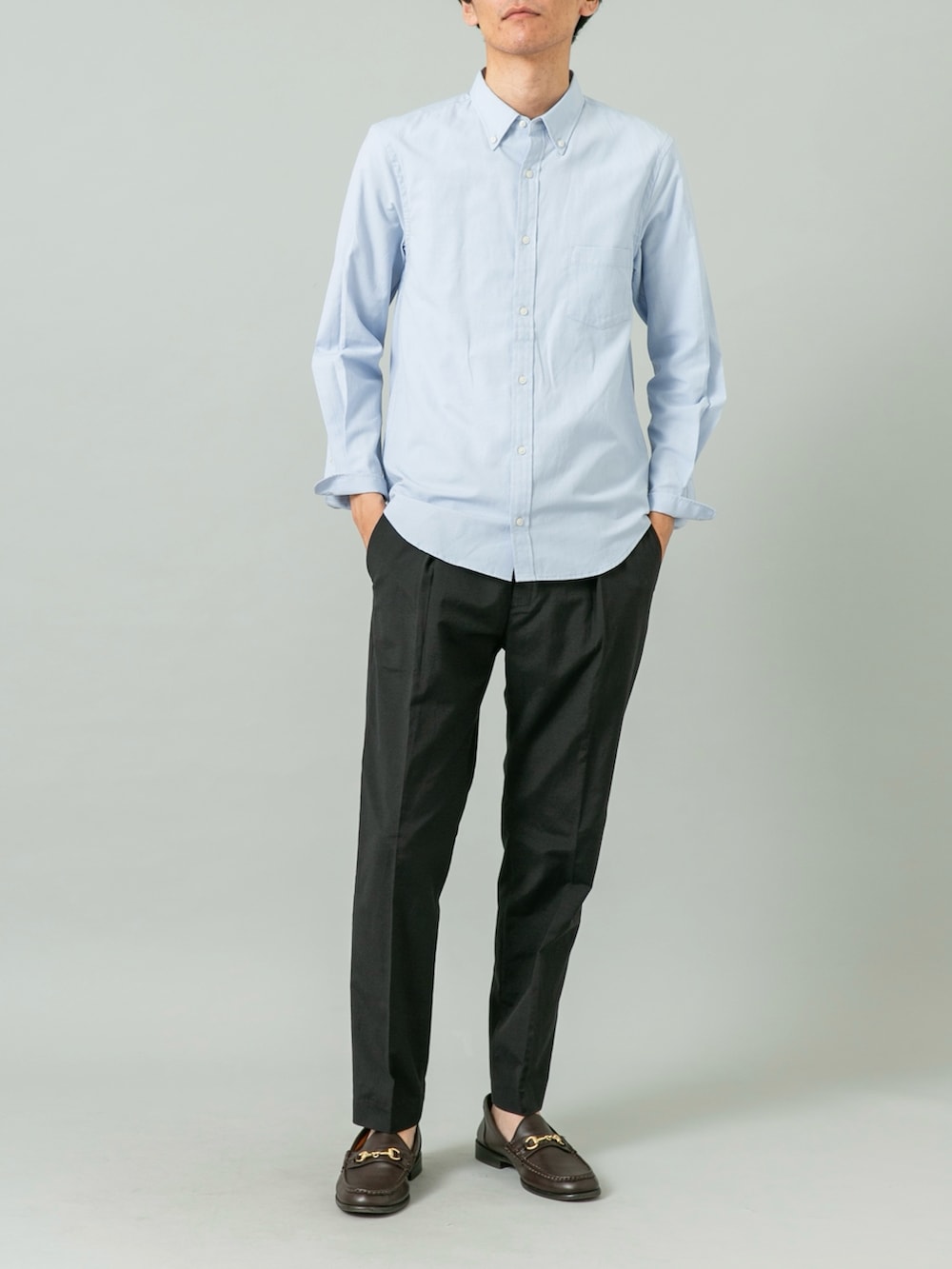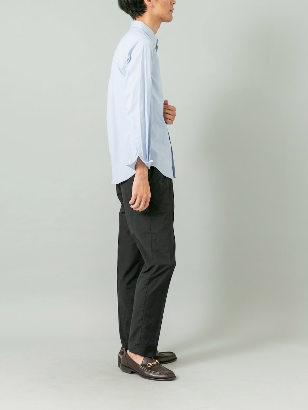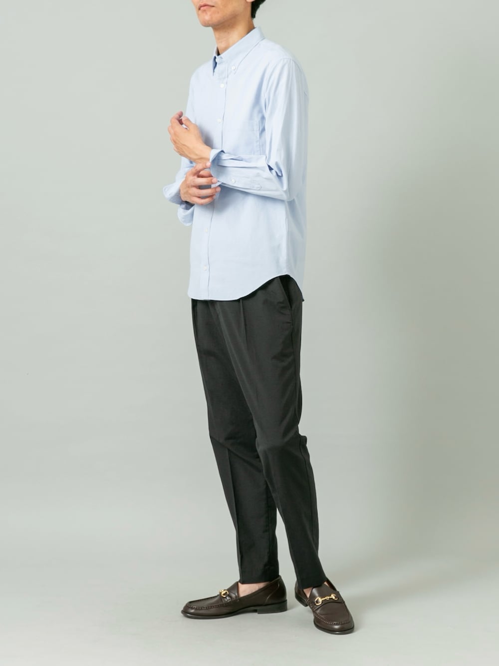 「ハイパフォーマンスリネン」シリーズのサックス(SAX)ボタンダウンシャツに、ブラックのテーパードパンツを合わせた、シャープで清潔感のある着こなしです。
