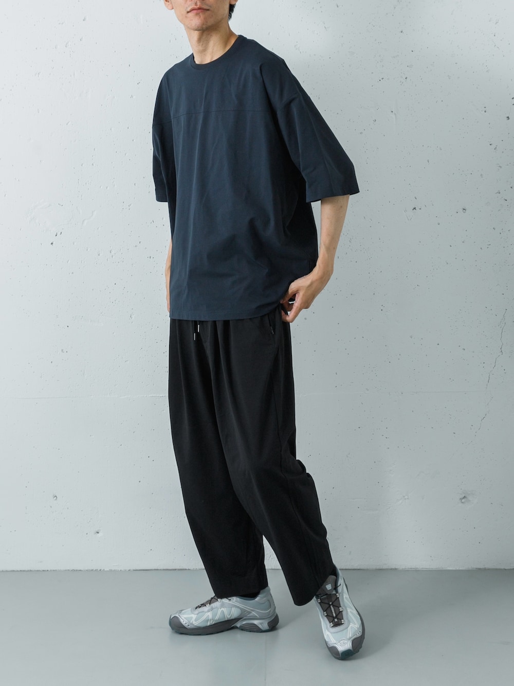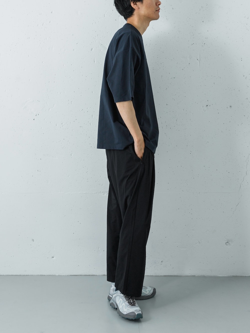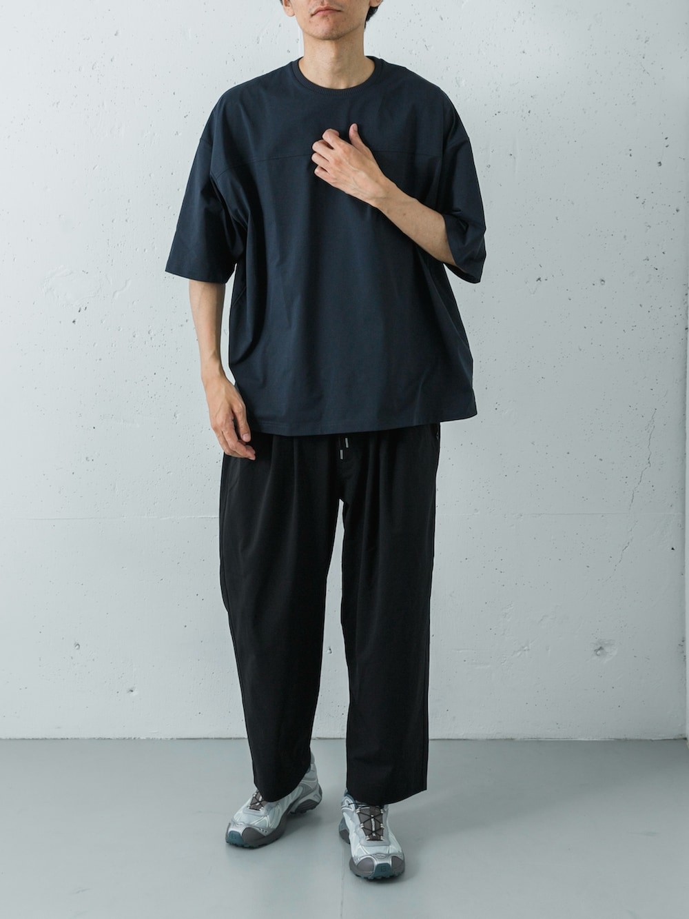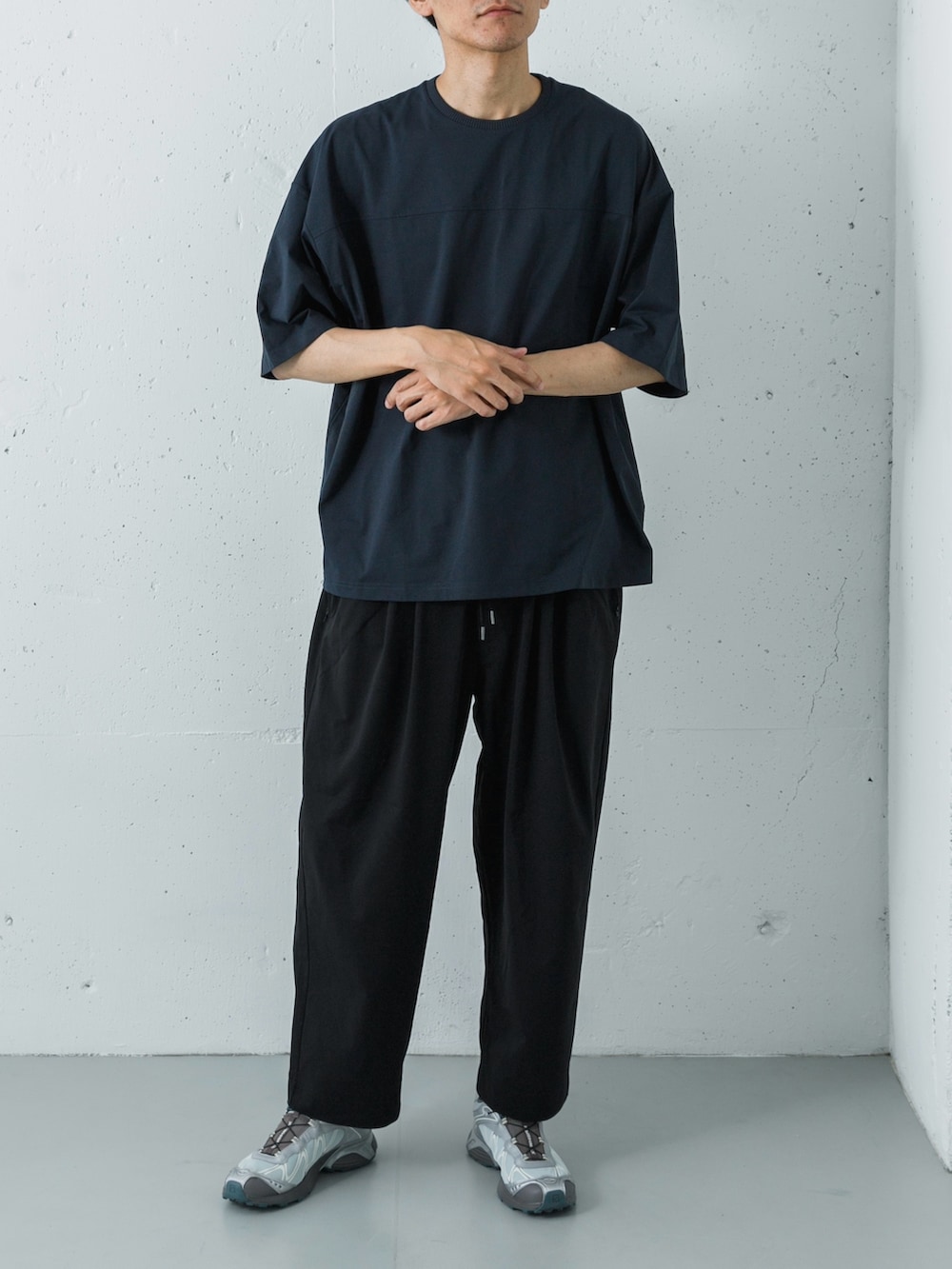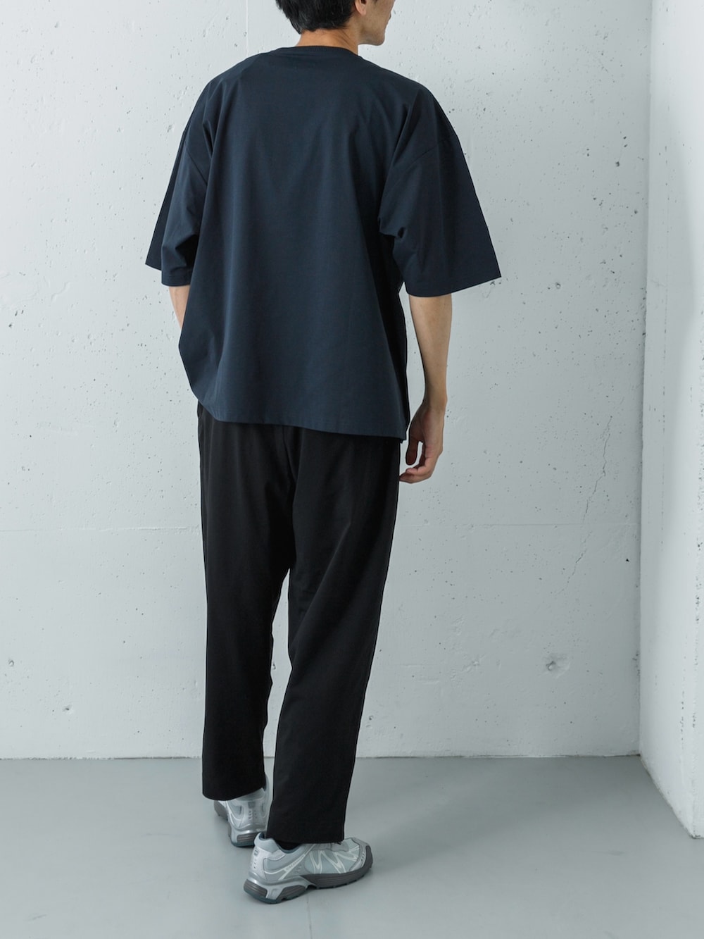 トップスには深みのあるダークネイビー(D.NAVY)のTシャツを、ボトムスには全体をシャープに引き締めるブラックのイージーパンツをセレクト。ゆったりとしたワイドシルエットながら、ダークトーンでまとめることで、大人に相応しい落ち着きとモードな空気感を演出しています。