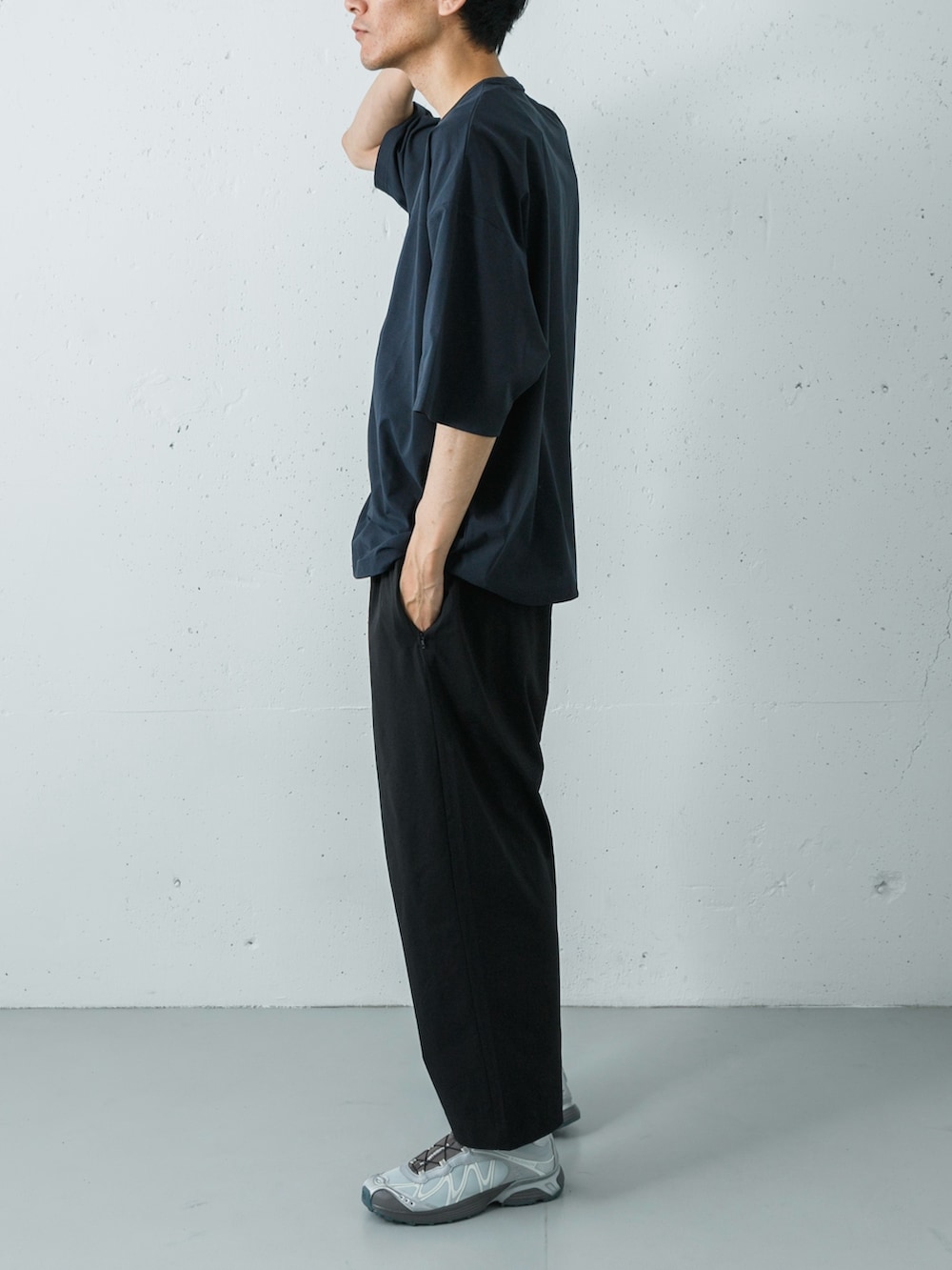 足元には、ニュアンスのあるグレーのSALOMON(XT-WHISPER)を合わせました。ダークな上下を足元のグレーが軽やかに繋ぎ、テックウェア特有のギア感を品良く昇華。街歩きからアクティブなシーンまで、常に涼しくスマートに過ごせる機能的な装いです。