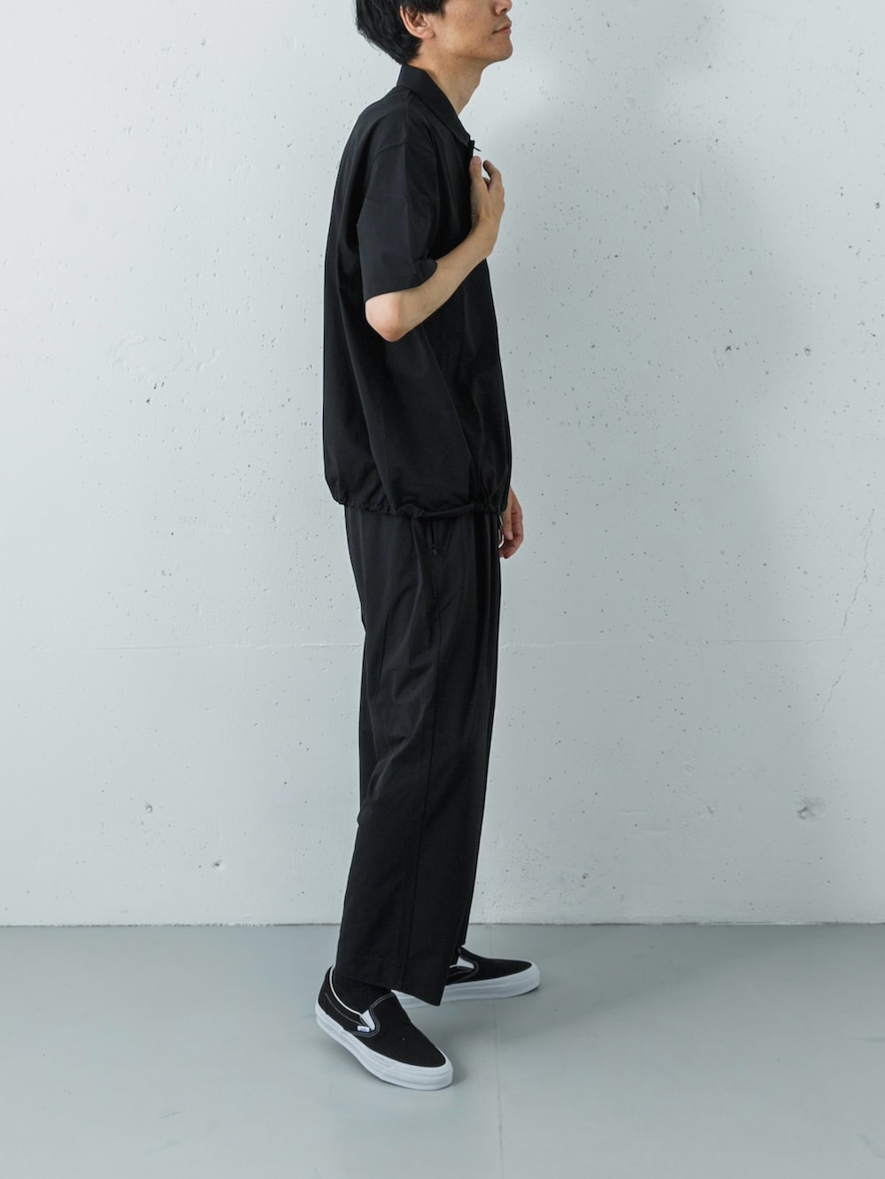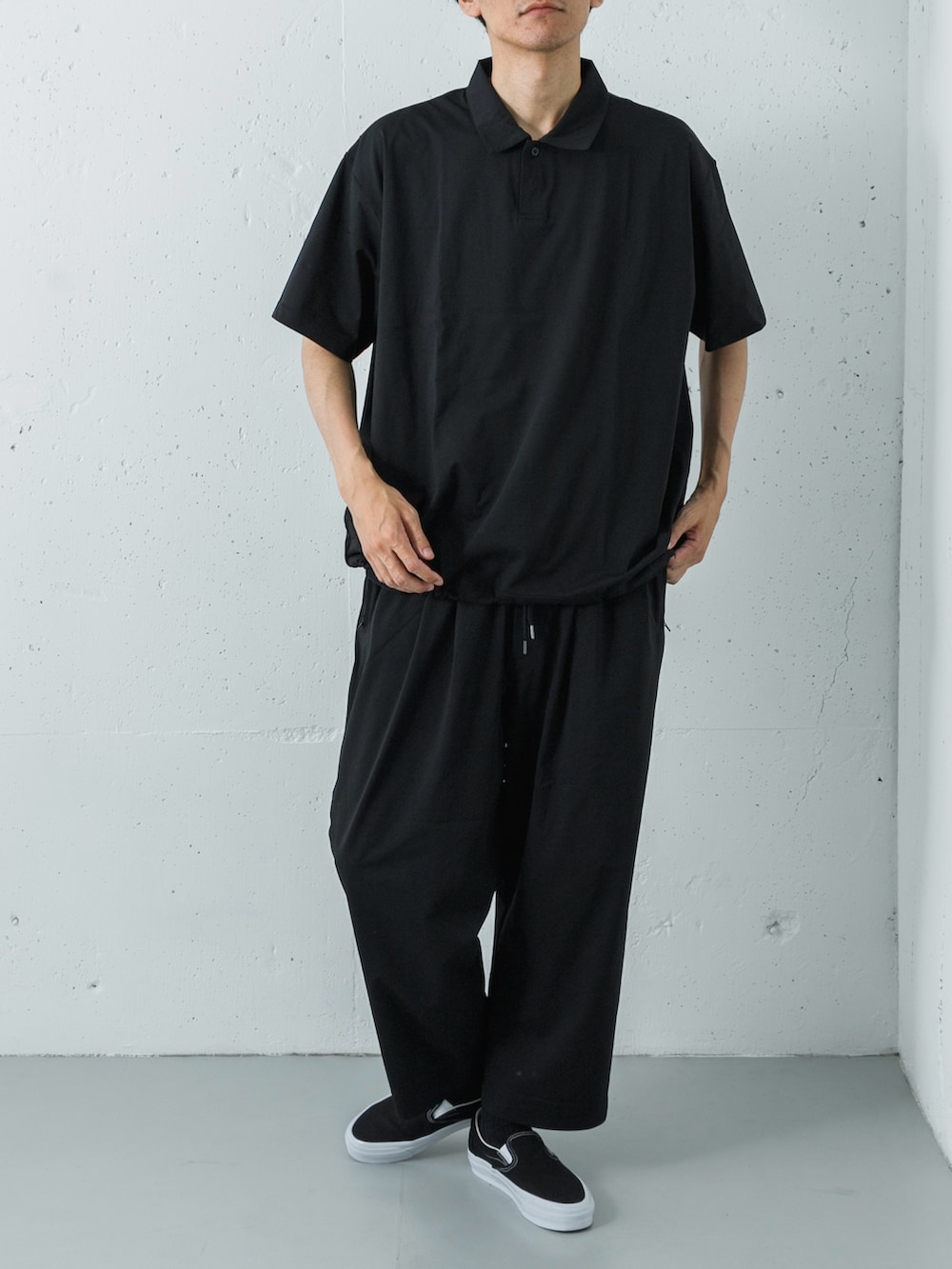 Wide Dadの「BREEZY TECH」素材を使用した、ダークネイビーのポロシャツとイージーパンツによるセットアップスタイルです。